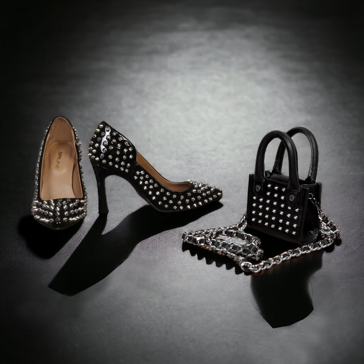 Gifting Combo Pack For Ladies Heels Stud Sandals & Hand Mini Stud Bag in Black Patent leather