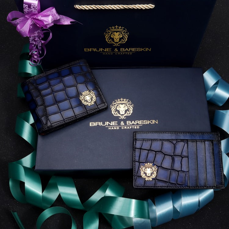 Surprise your loved ones with the exquisite gifting combo pack from Brune & Bareskin. This carefully curated set features a smokey blue croco-textured leather wallet and a matching card holder, both handcrafted to perfection. The bi-fold wallet and card holder are crafted with meticulous attention to detail, showcasing the brand's commitment to quality and luxury. The unique croco-textured leather adds a touch of sophistication and style, making this combo pack a statement accessory for any occasion. Our Bespoke service make it a perfect gifting combo for the gentlemen. What are you waiting for? You can click on CUSTOMIZE NOW Button (Just above the "ADD TO CART" button) & fill the form to submit your customization requirements. Or you can reach us by Call, Email, WhatsApp, and DM..