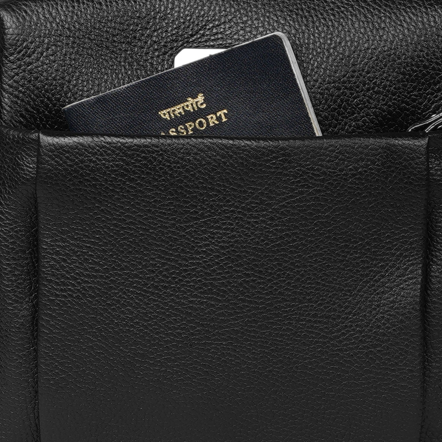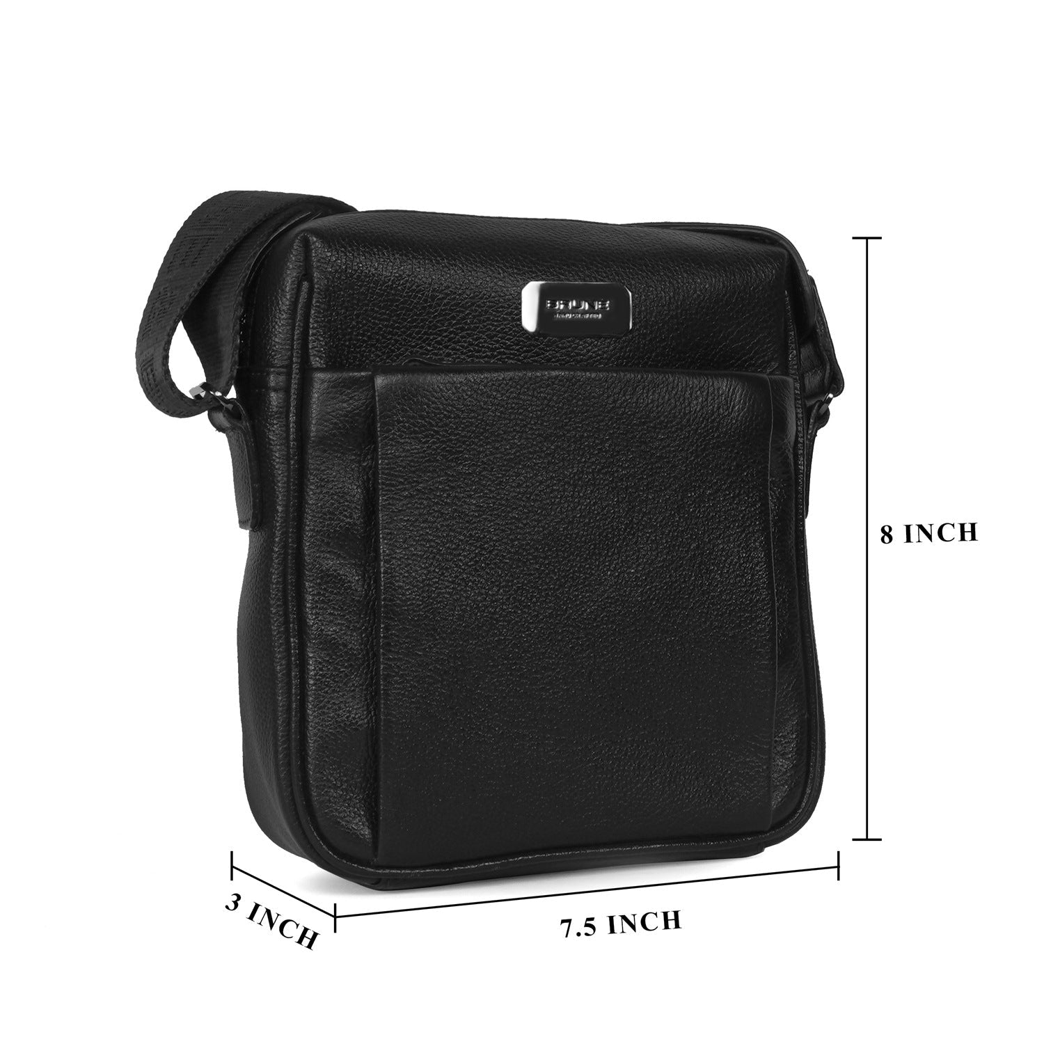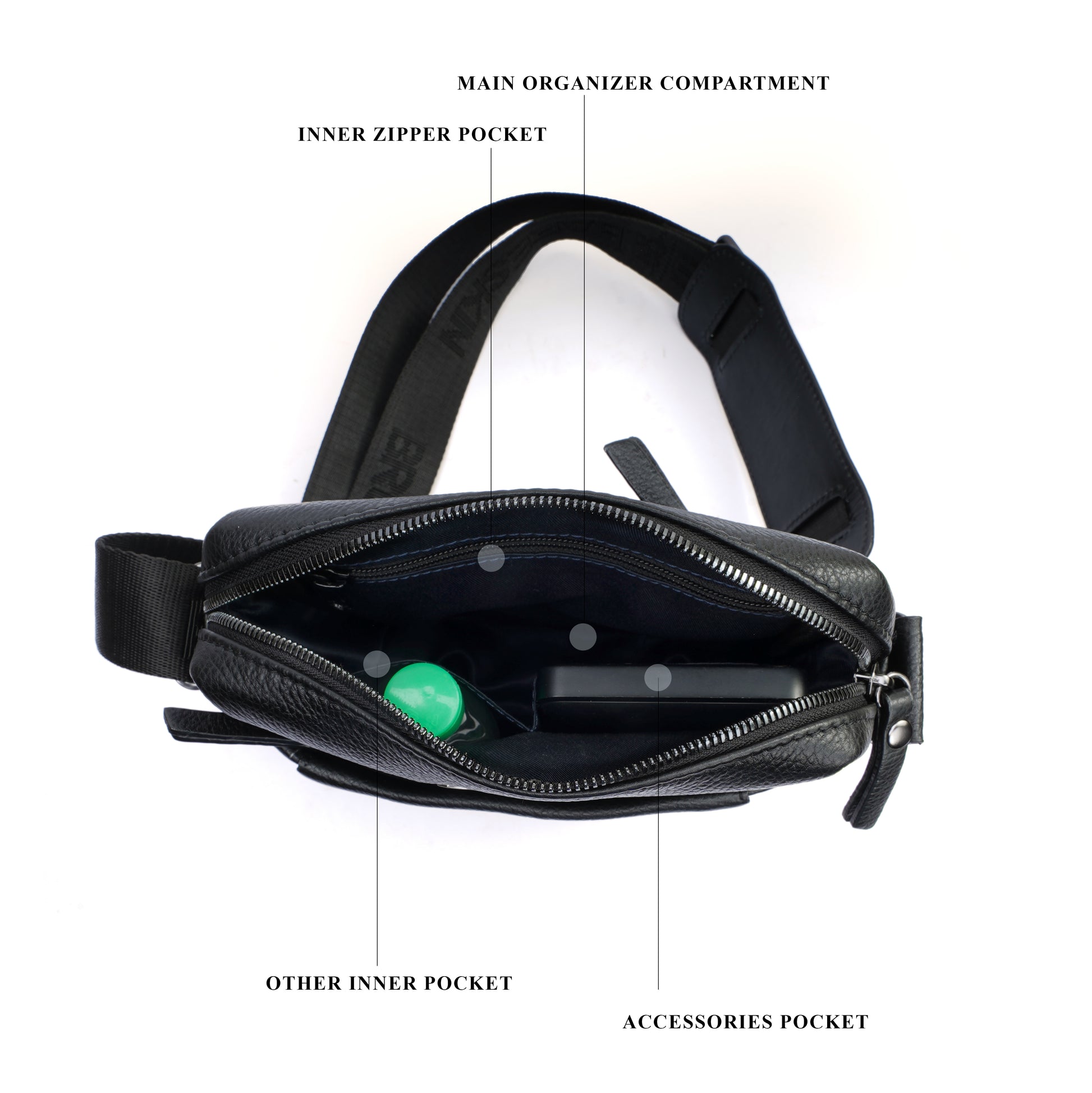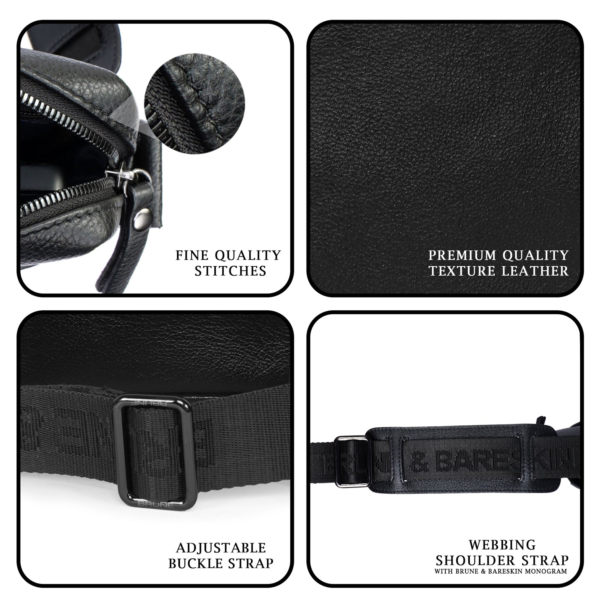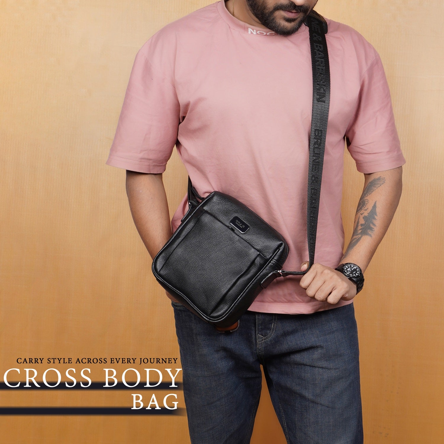 Upgrade your airport look with our Small Sized Crossbody/Sling Bag in Black Textured Leather. Handcrafted with premium quality genuine Leather and a patina finish, it's perfect for both formal and casual looks. The Brune & Bareskin branded webbing adjustable strap allows you to carry all your essentials with ease, while the top opening main zipper compartment and easy access pockets provide secure storage. Travel in style with this versatile and stylish bag. You can get it customized with your name initials with our Bespoke services.