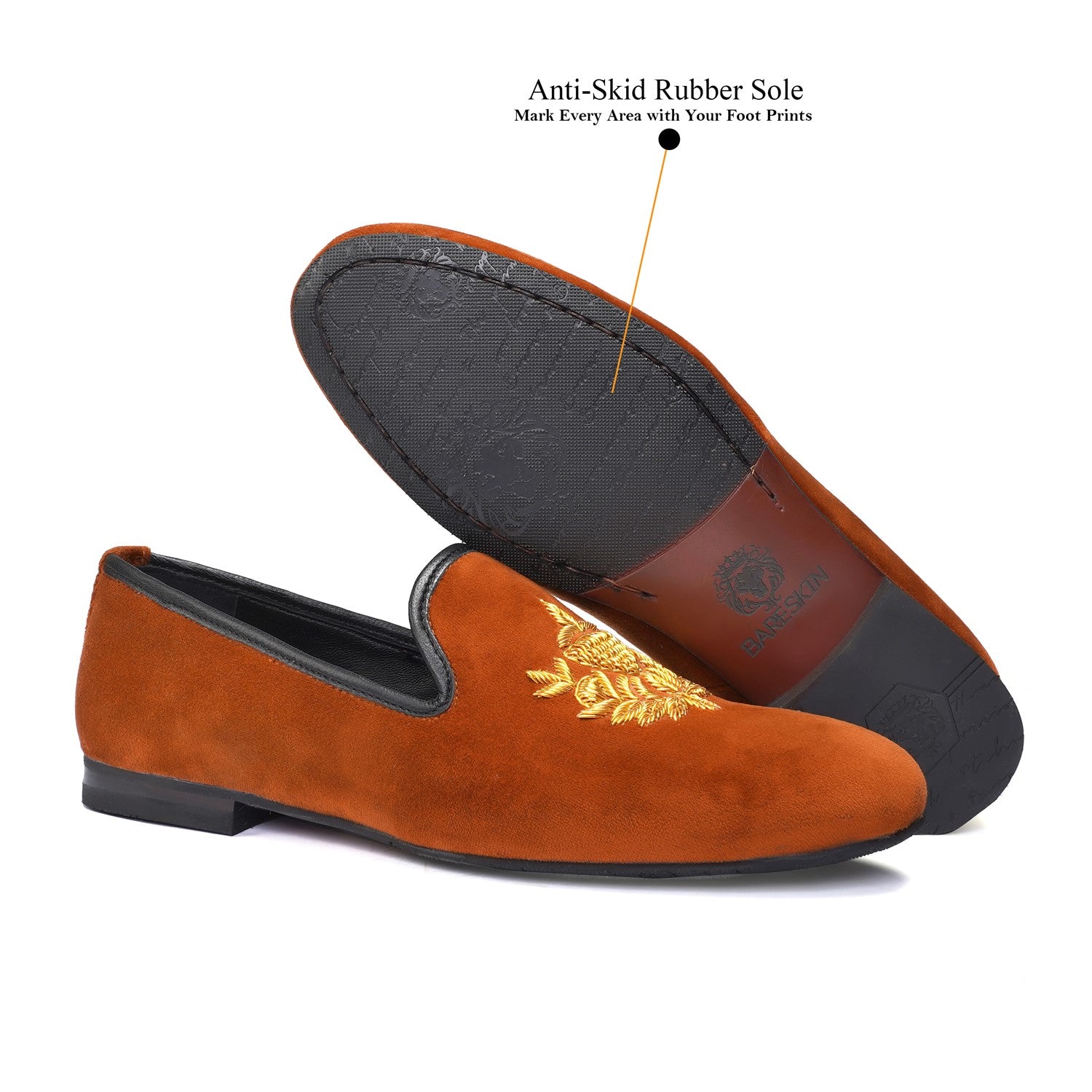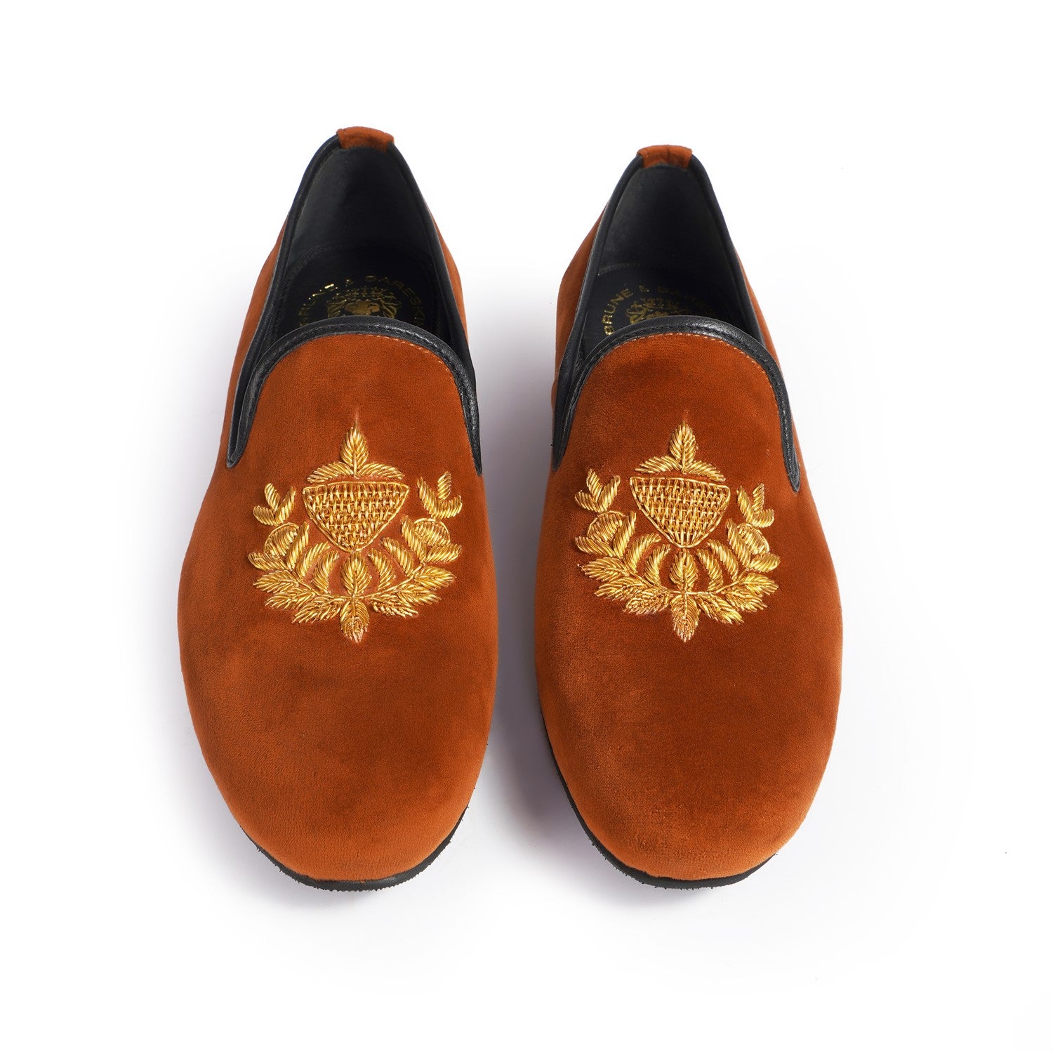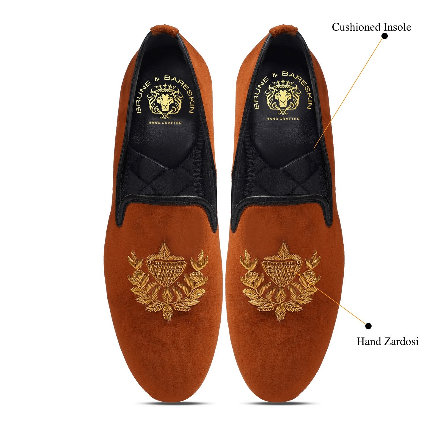 Handcrafted from premium tan velvet, these Brune & Bareskin Slip-on feature a sleek silhouette with an intricately embroidered gold laurel leaf motif on the vamp for a sophisticated, regal accent. The extra cushioned insole provides superior all-day comfort and support, while the branded interior lining highlights artisanal quality.