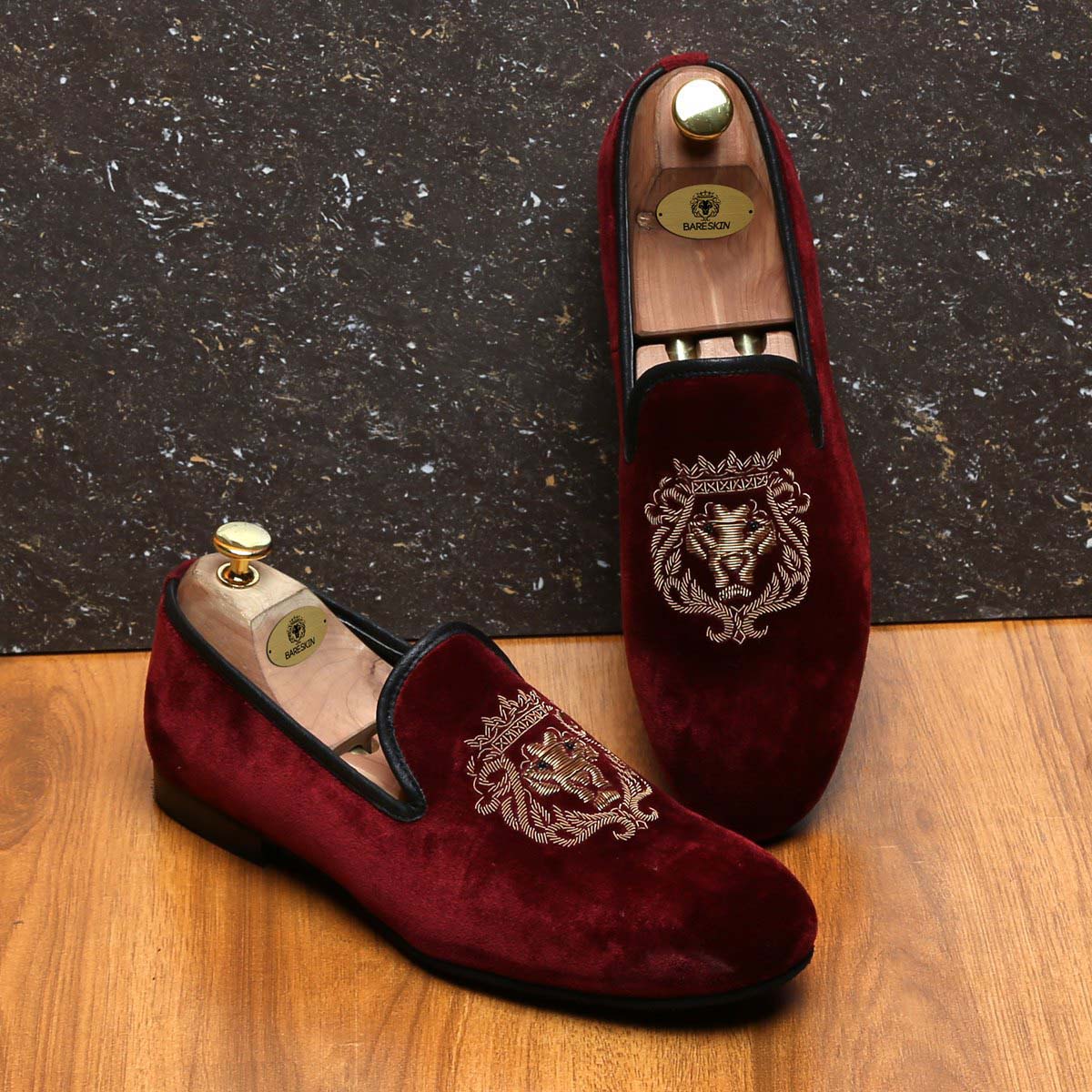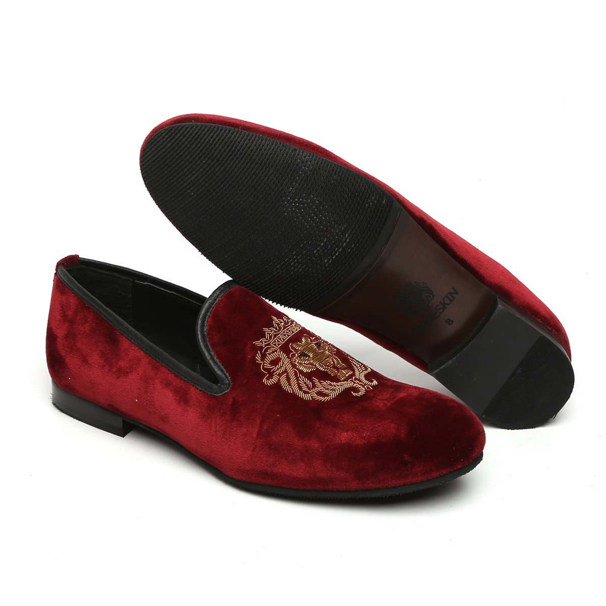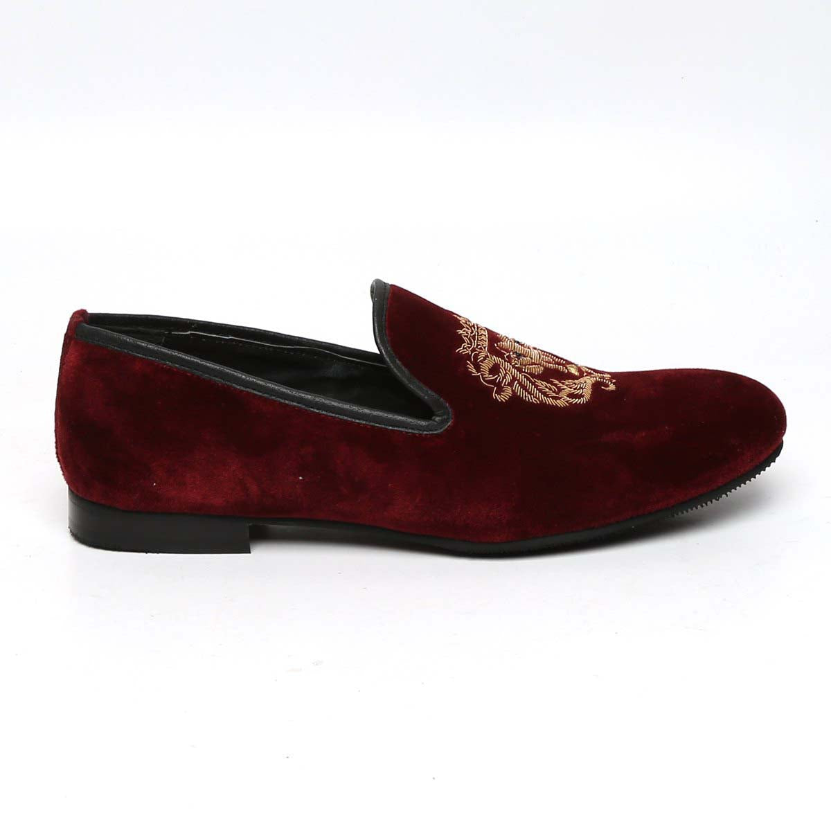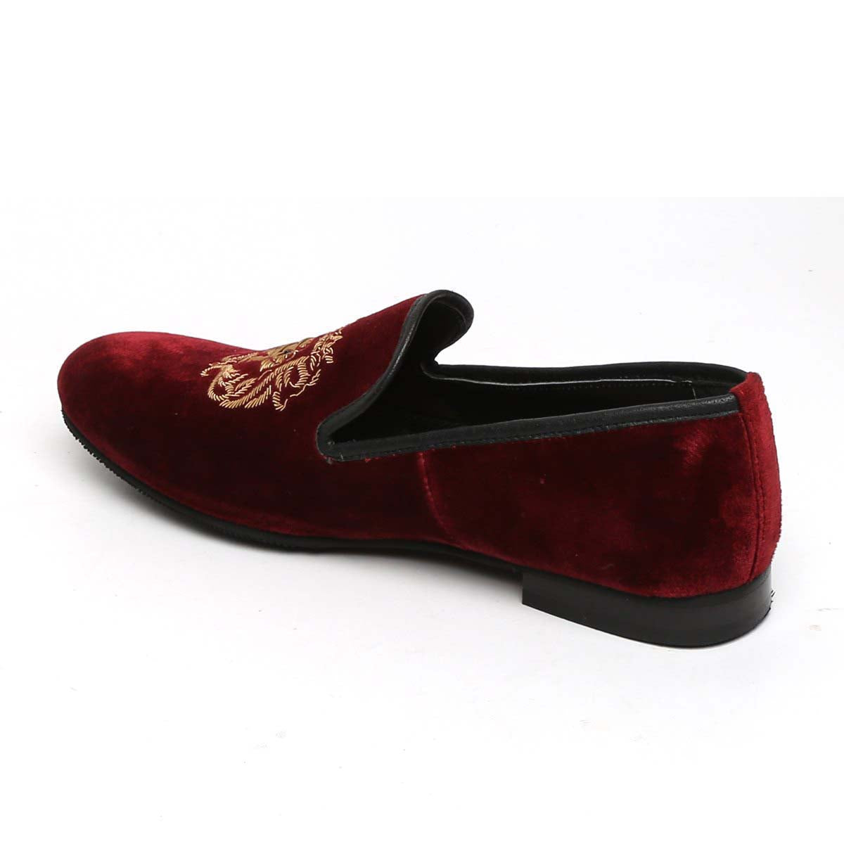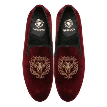 The Brune & Bareskin Lion logo Zardosi collection is one of a very elite collection. The Lion hand zardosi in golden color looks fantastic. The special bead eyes enhance the appearance. This special zardosi is done by the most experienced hands of the Industry. This can be customized further to match the apparel's theme of your choice. The richness of red Italian velvet slip on shoes compliments the well dressed man. This smooth Velvet Black Slip-on gives an elite style and debonair look. This is an amazing addition to your wardrobe.