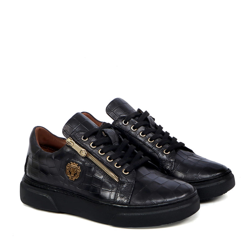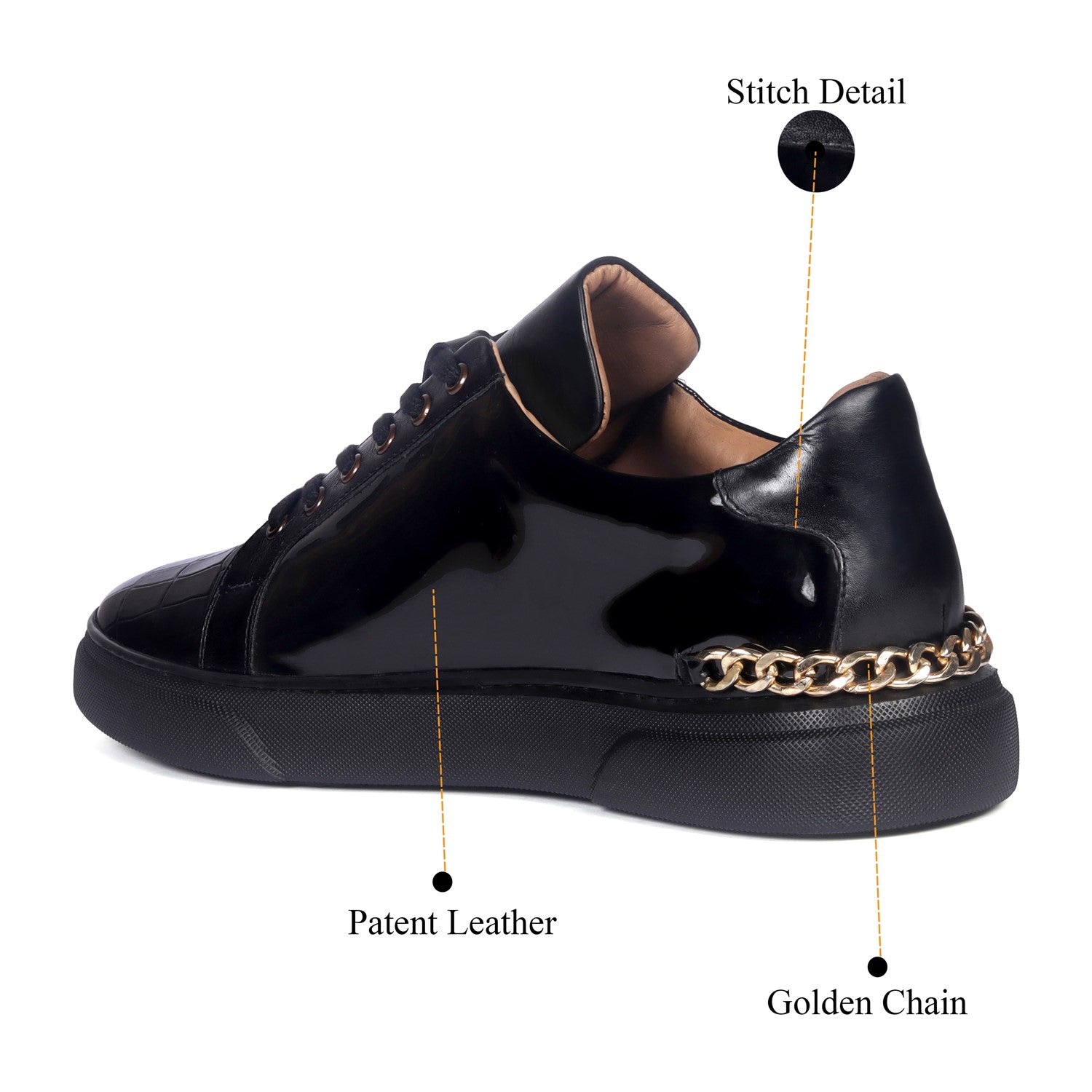 Golden Chain Embellished Sneakers with Zipper Lace Up Patent Quarter with Deep Cut Croco Print Toe Leather