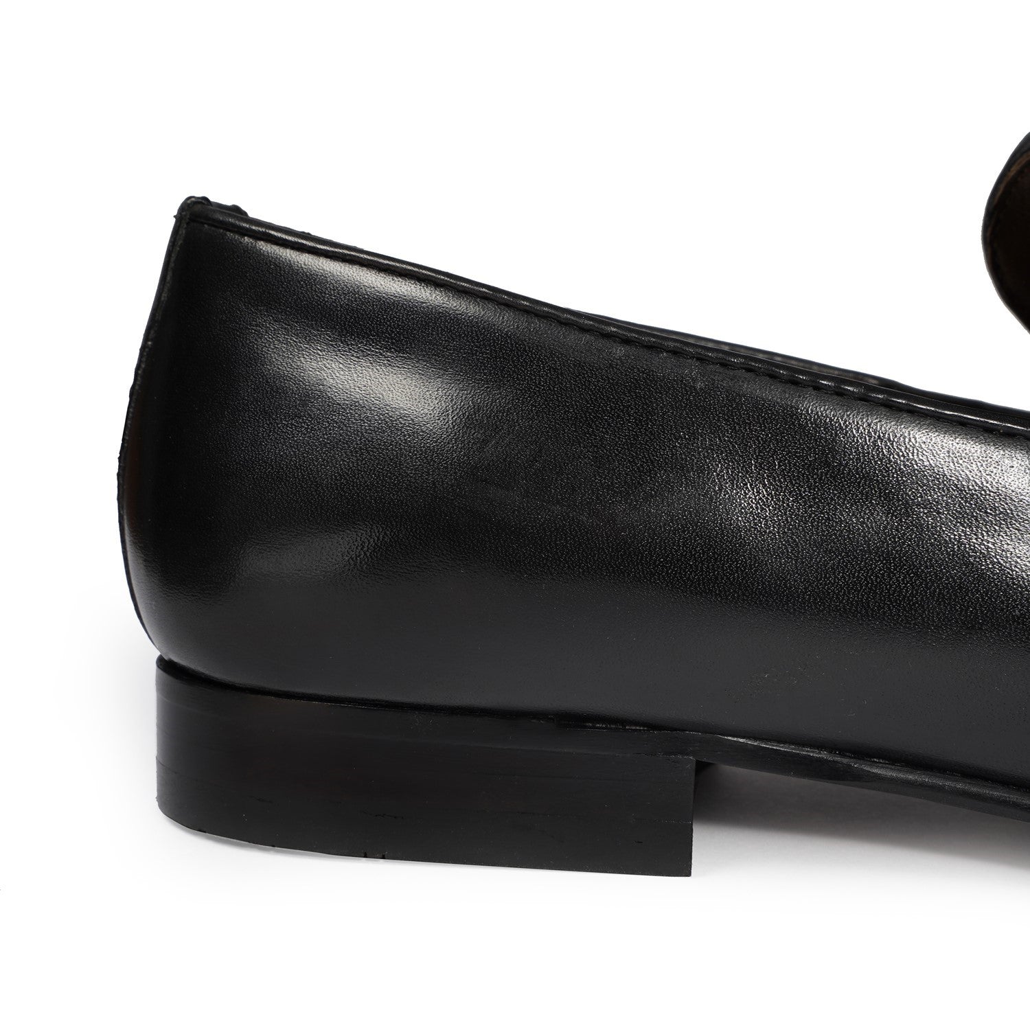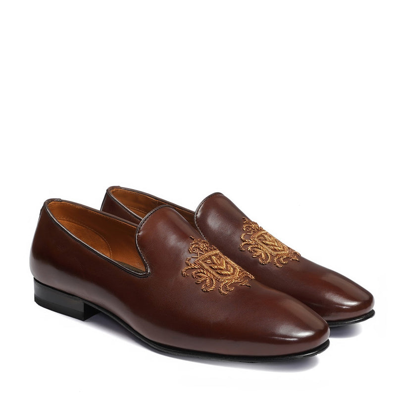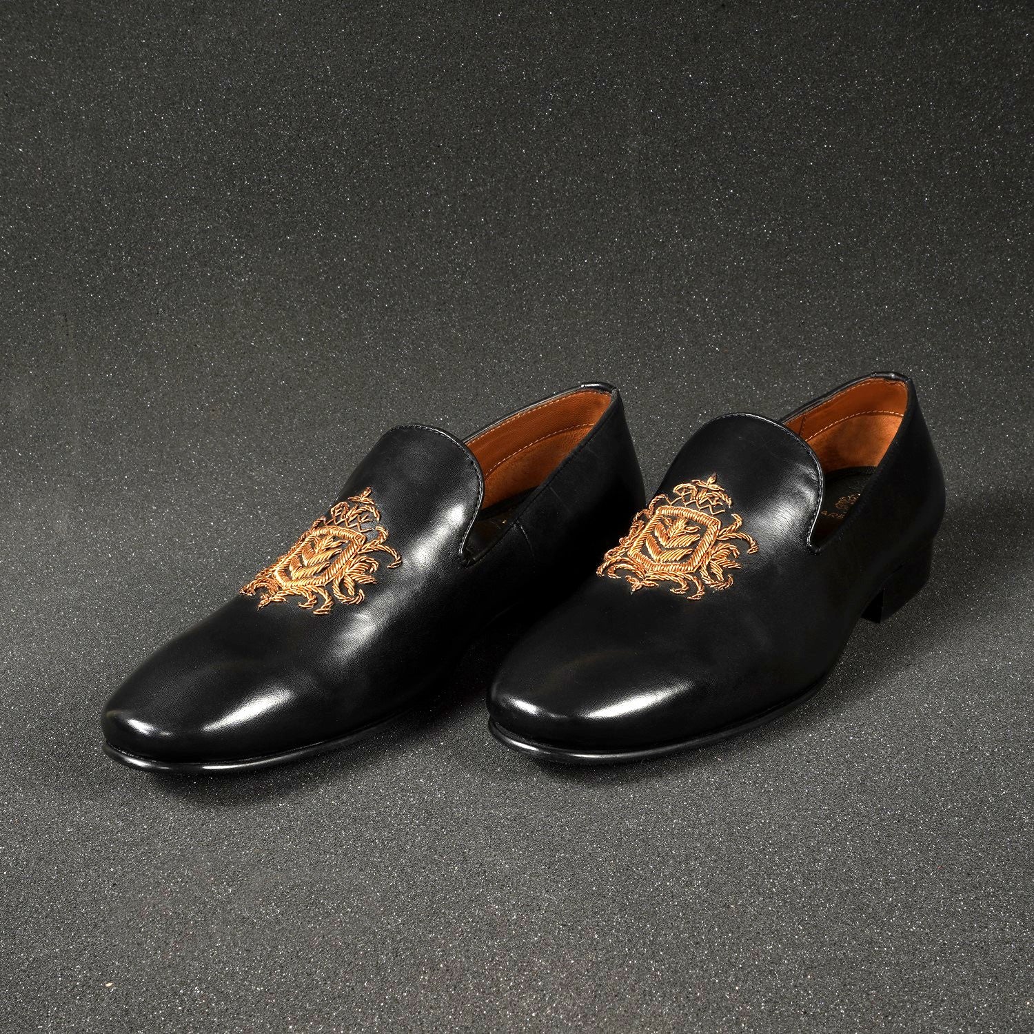 The Brune & Bareskin Lion logo Zardosi collection is one of a very elite collection. The hand zardosi in gold color looks astonishing. This special zardosi is done by the most experienced hands of the Industry. This can be customized further to match the apparel's theme of your choice. The classic feel of black leather slip on shoes compliments the well dressed man.