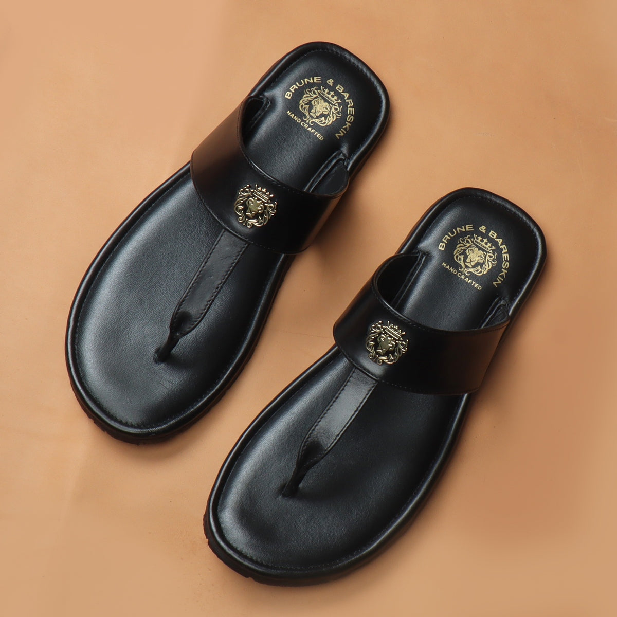 These Black metal lion logo slippers are designed to give complete comfort and style to the feet in this season. The Black Upper Genuine Leather strap with contrasting golden lion logo provides vogue and ruggedness at the same time. They are a good pick to wear with casuals and ethnicities.