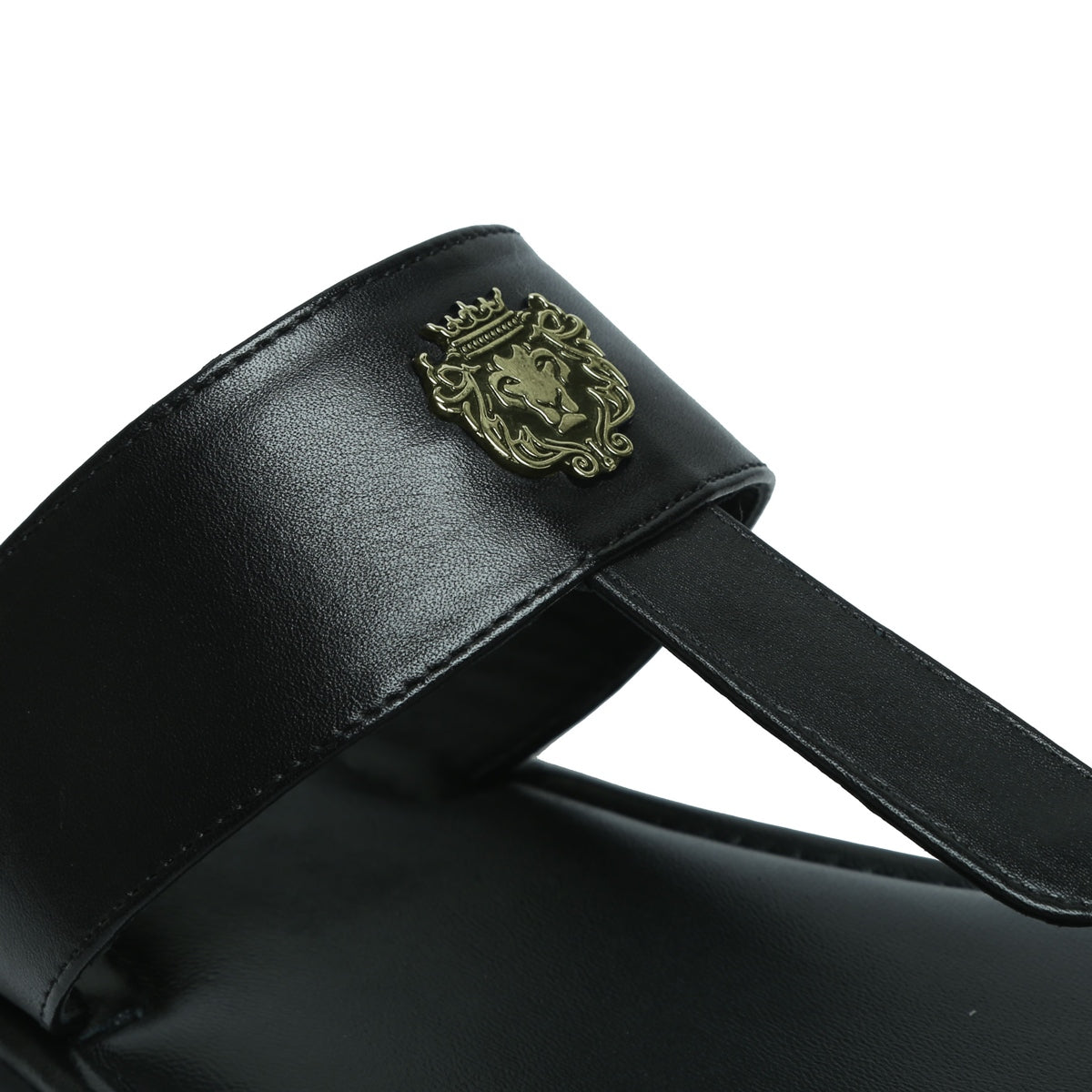 Black Leather T-Strap Slide-in Slippers with Golden Metal Lion