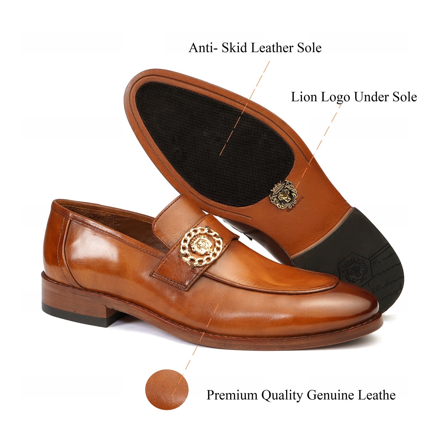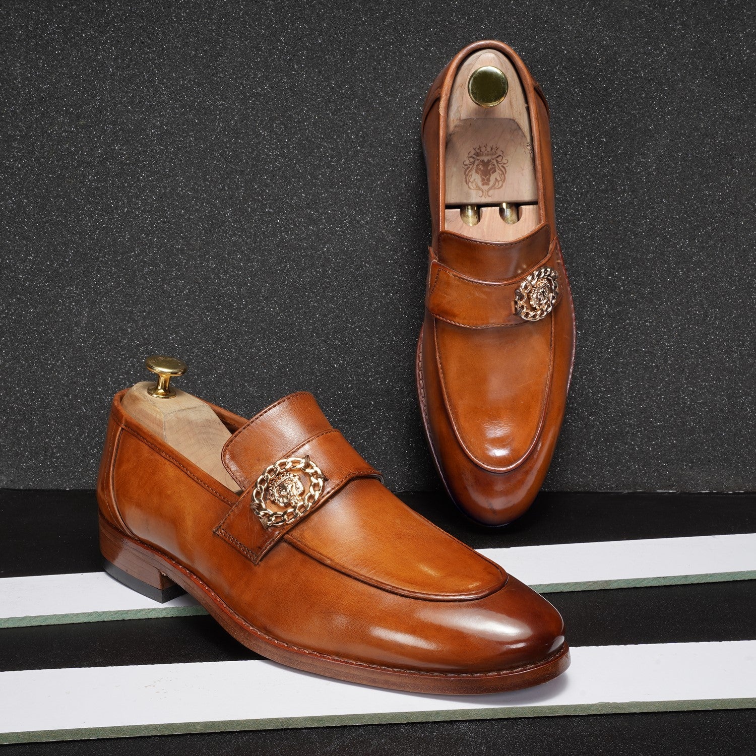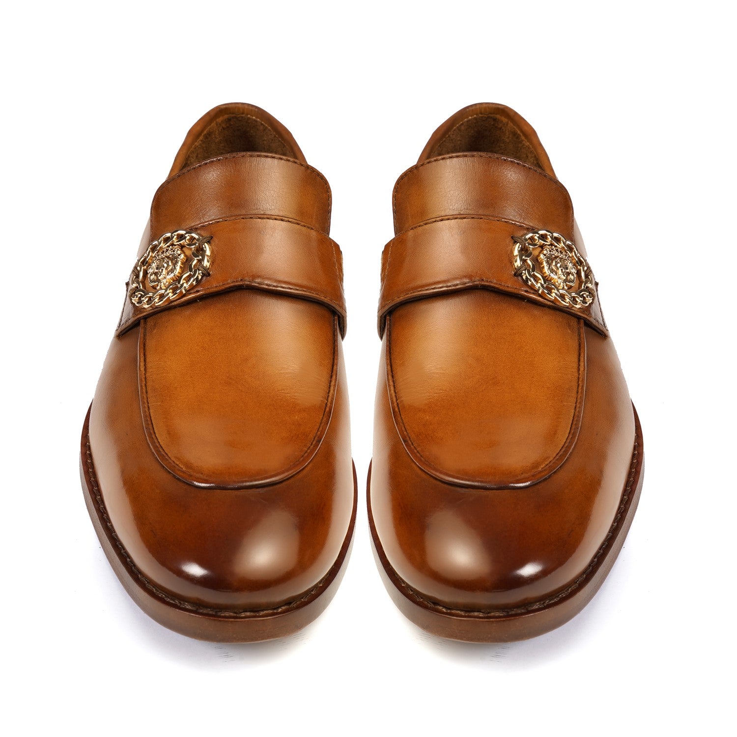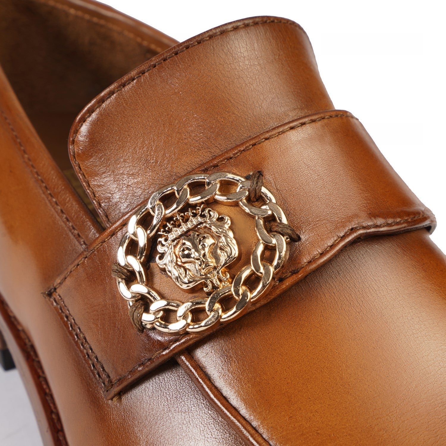 Golden Metallic Chain Lion Logo Tan Formal Slip on Shoe