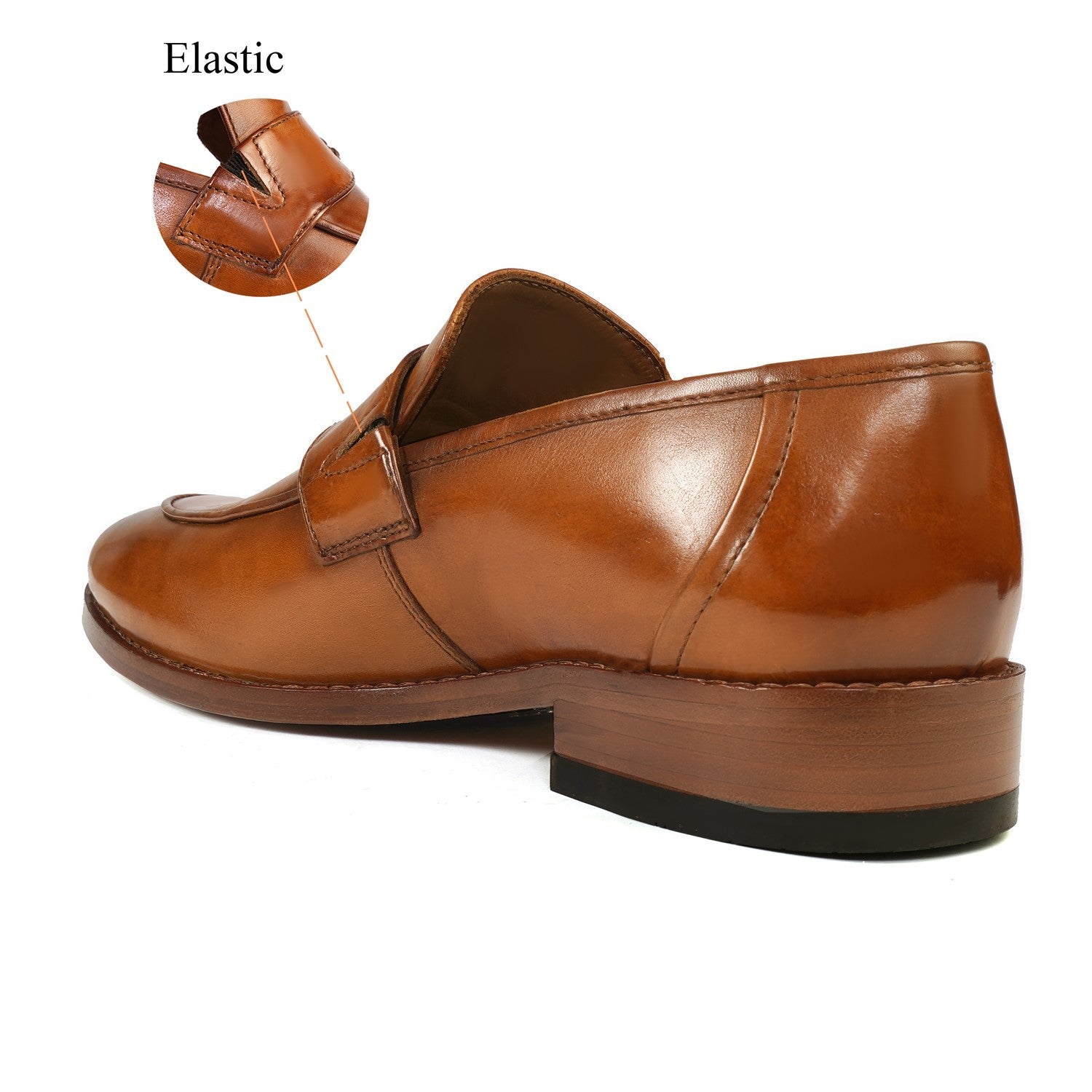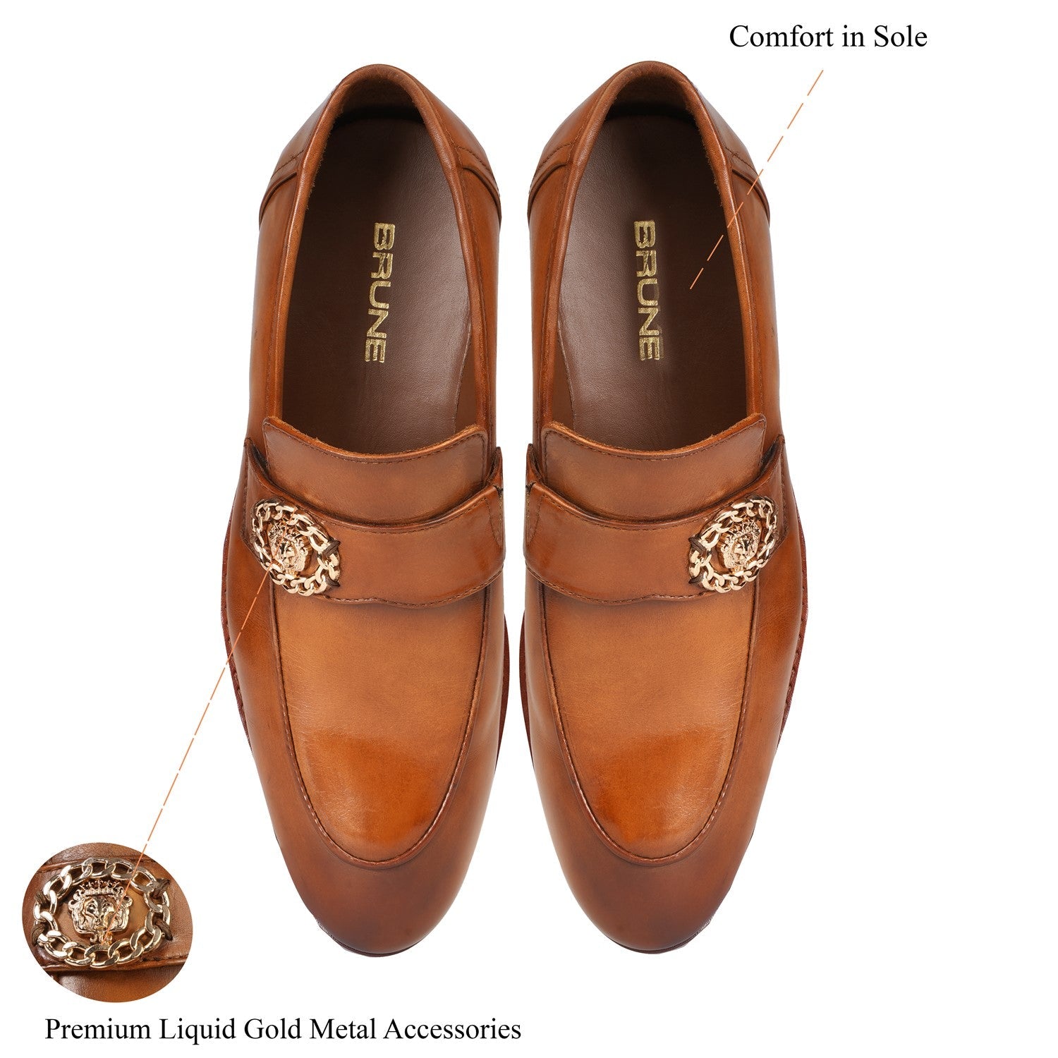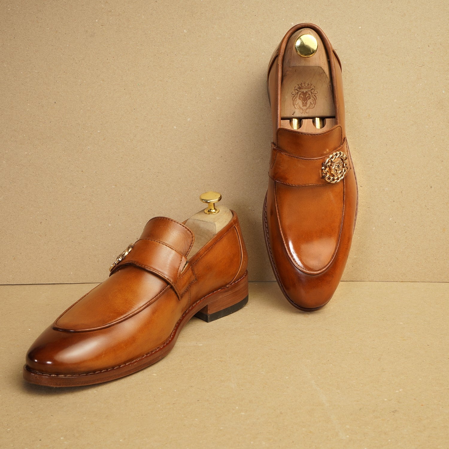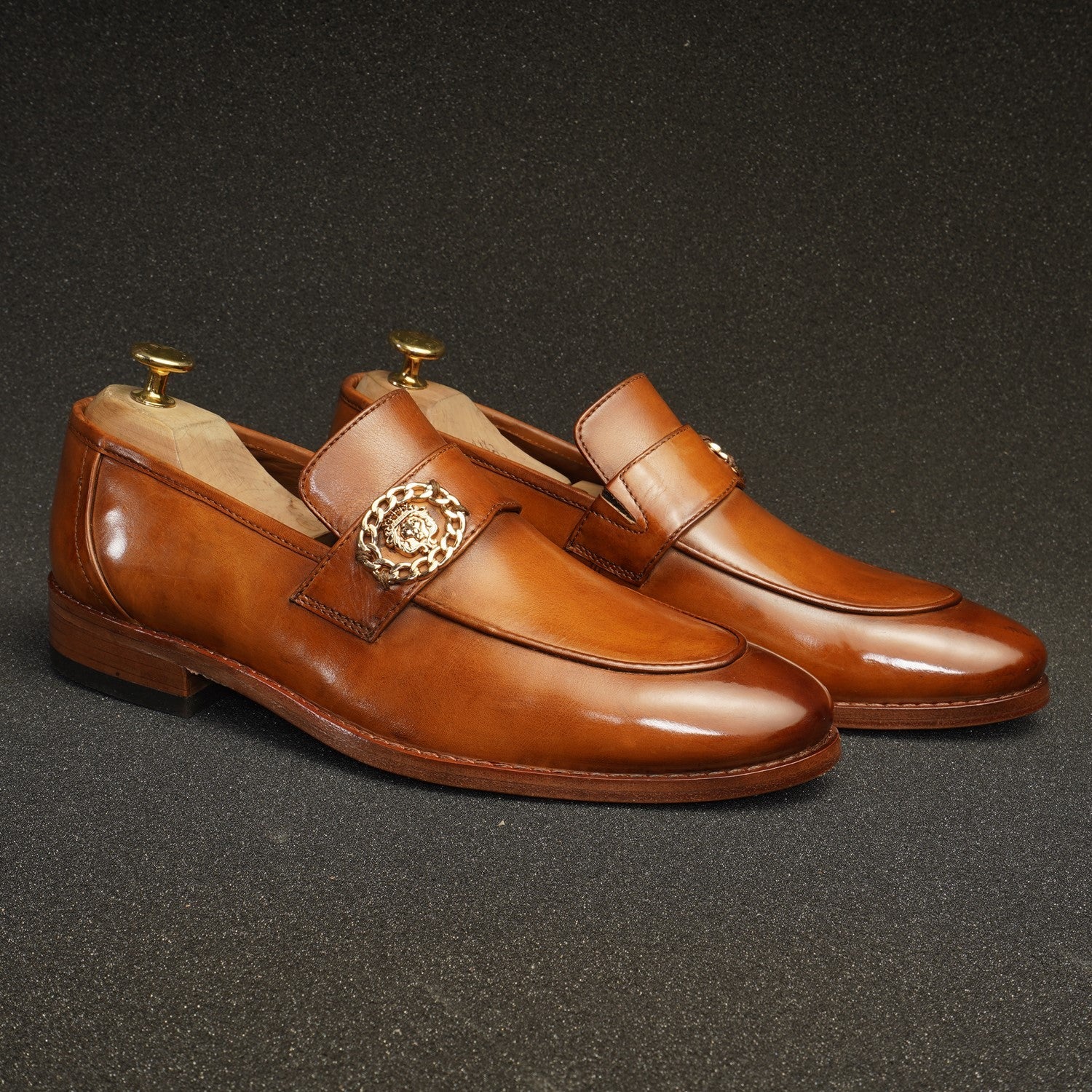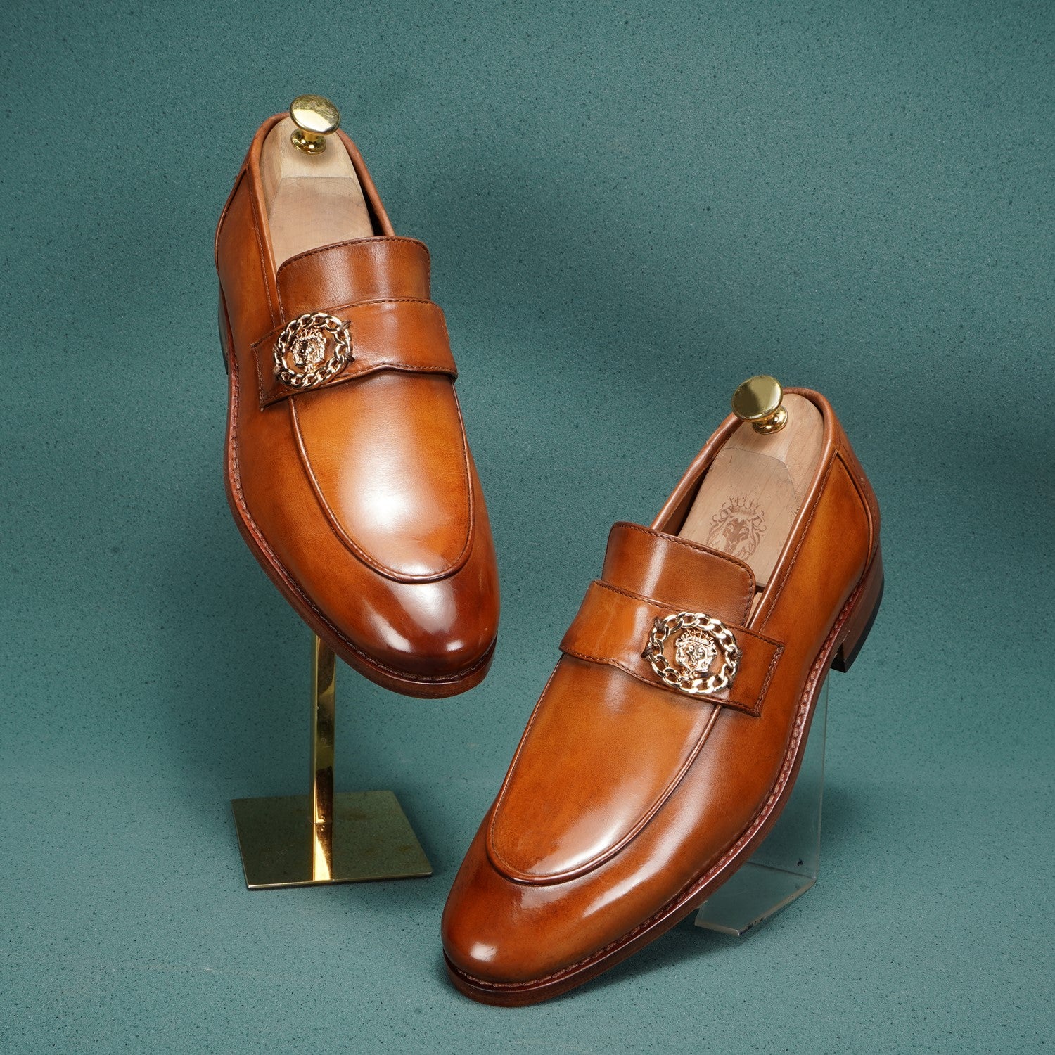 Golden Metallic Chain Lion Logo Tan Formal Slip on Shoe