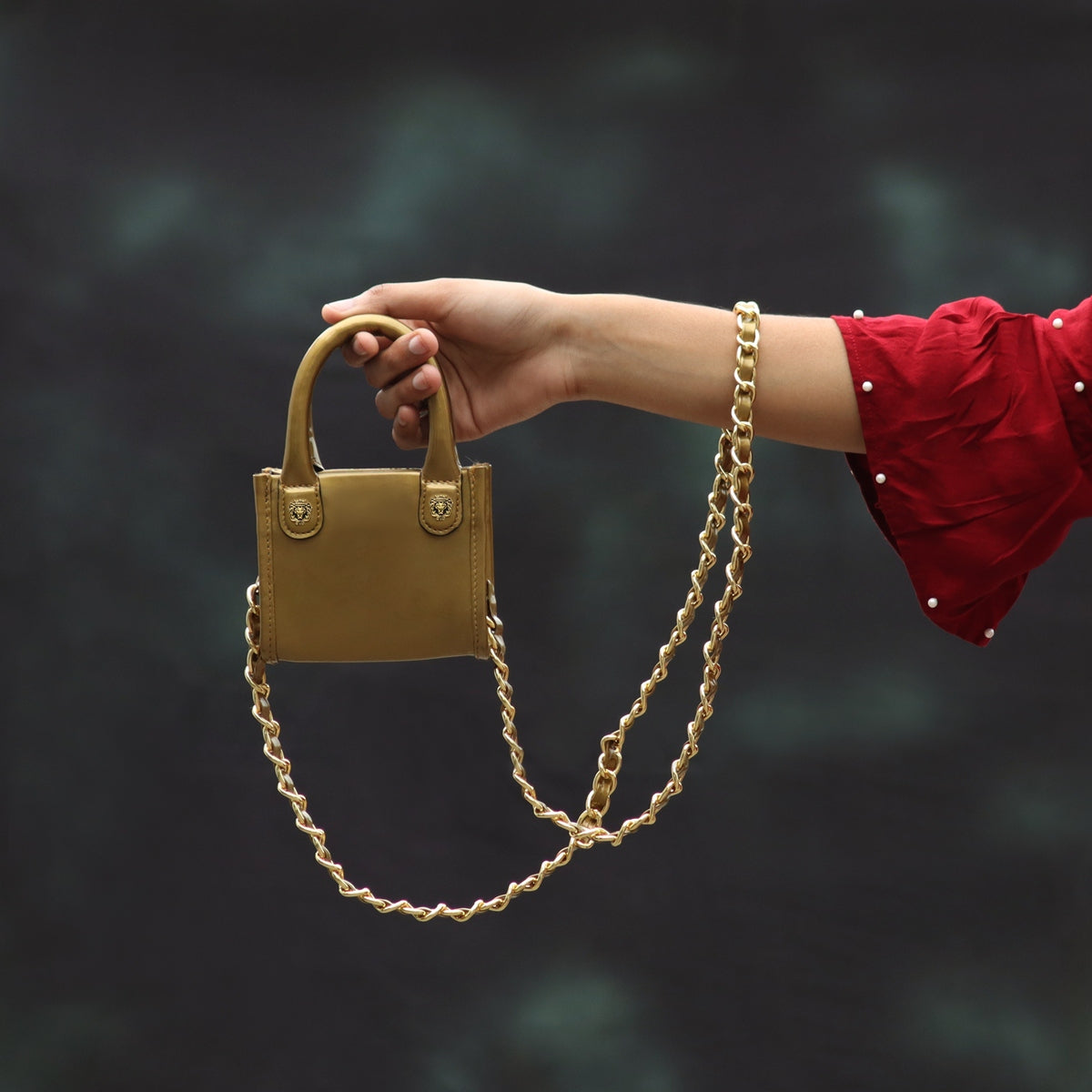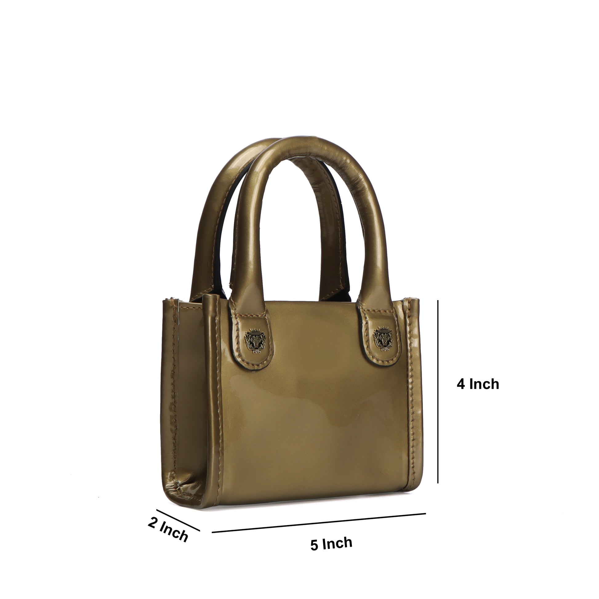 Brune & Bareskin golden micro sized leather hand bag looks very elegant. Crafted with golden patent leather, this handbag has been embellished with closure button detailing and patent leather detailing. The square space allows it to carry for travelling. The main button compartment provides the extra security to it. This bag is quite very handy for the traveler's as well. It provides the easy access to the needy essentials. Stylish look makes it an eye catching accessory. Stylish in appearance with its size its gonna be an eye stopper. This bag classic golden chain bag strap with leather weaved/threaded through choice of length and hook with two mini lion logo on front side. 100% pure genuine leather is used for making your style. This hand bag can be personalized with your name initials in any color shade and in any size with our bespoke services. This is a must-have addition to your fashion collection.