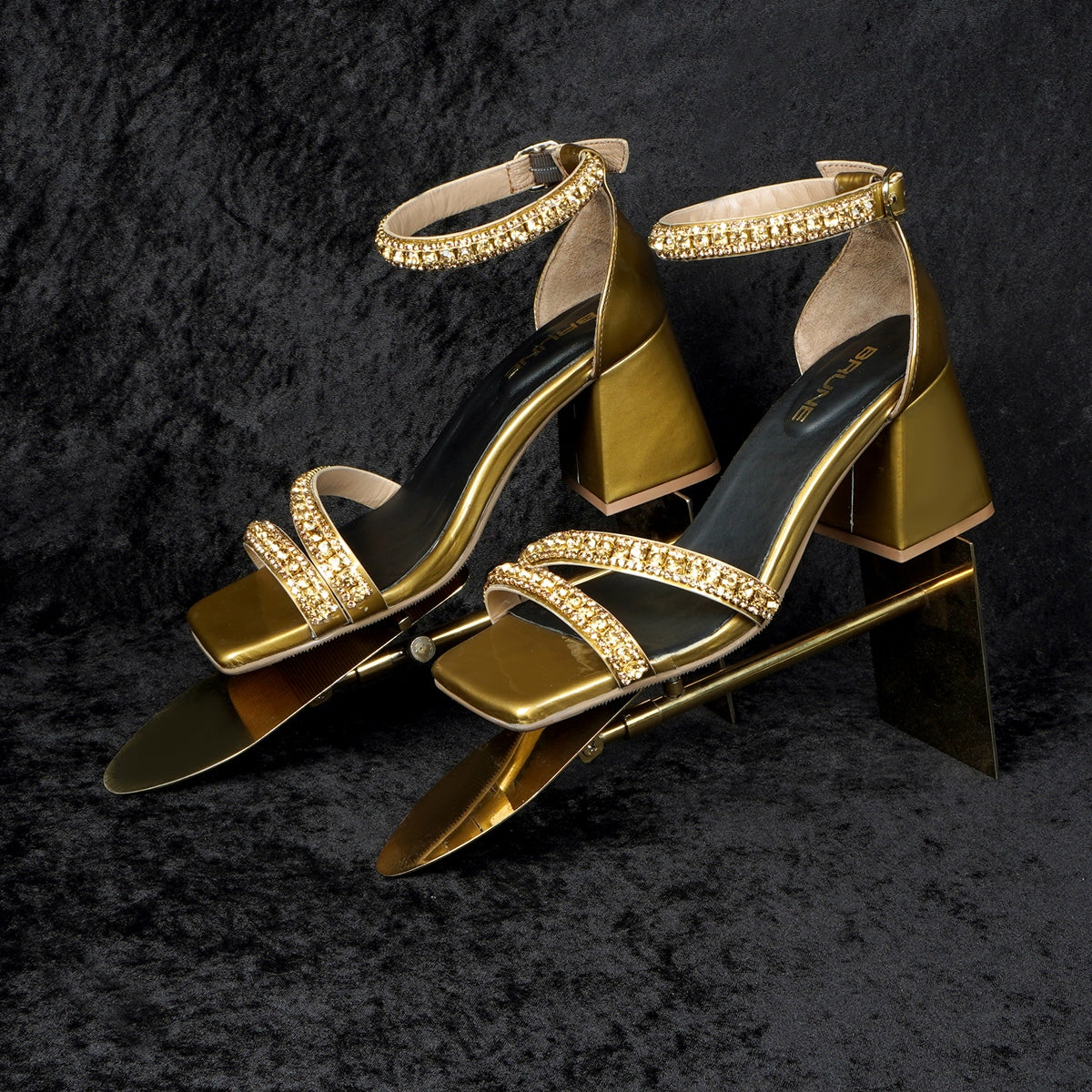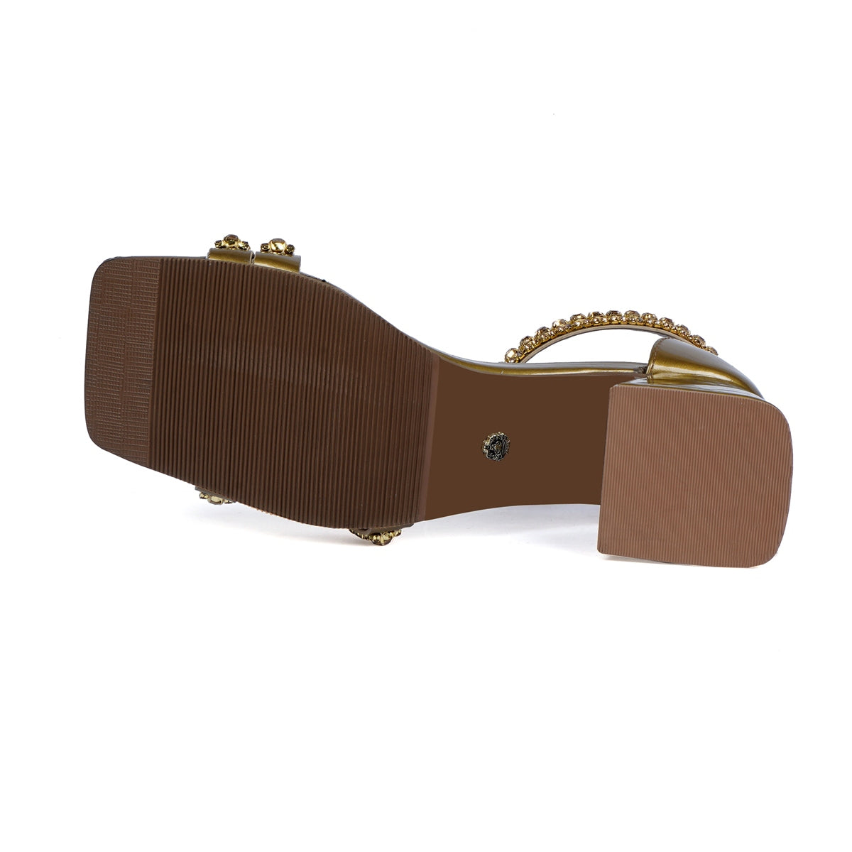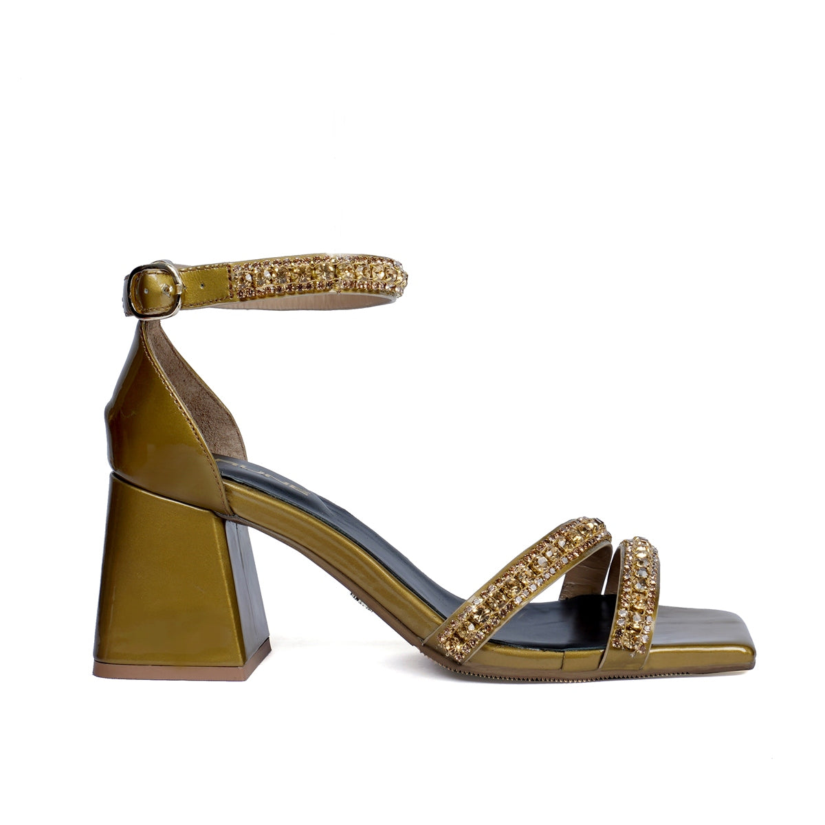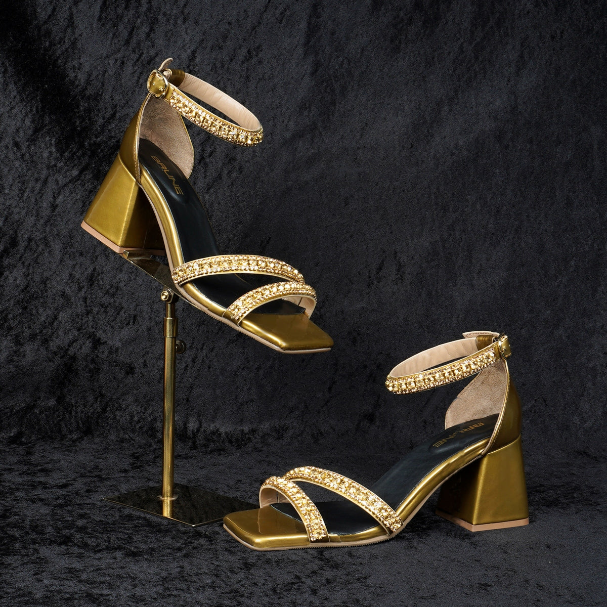 Golden Rhinestone Beads Embellishment Blocked Heel Buckled Strap Patent Leather Ladies Sandal By Brune & Bareskin