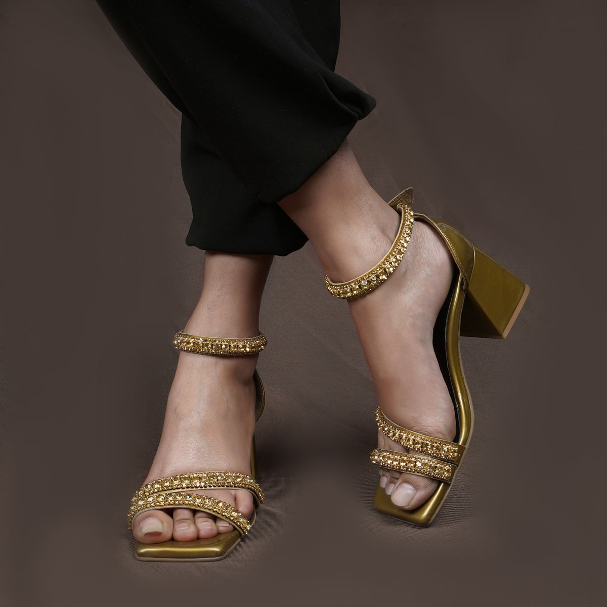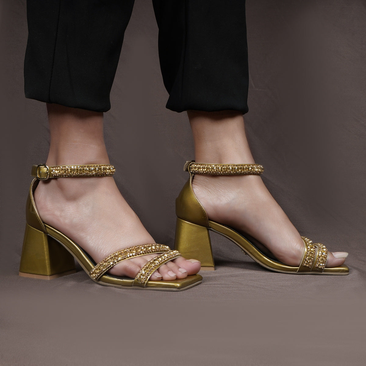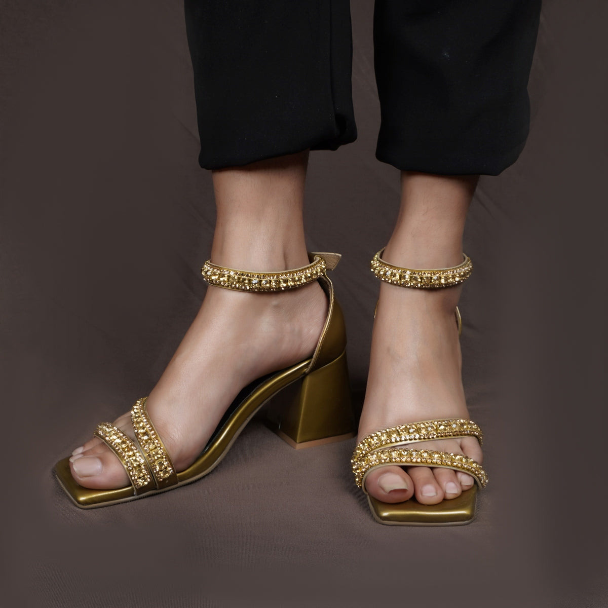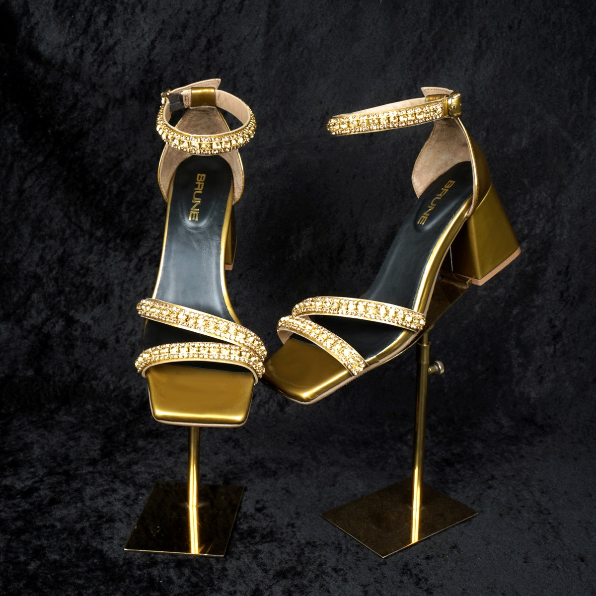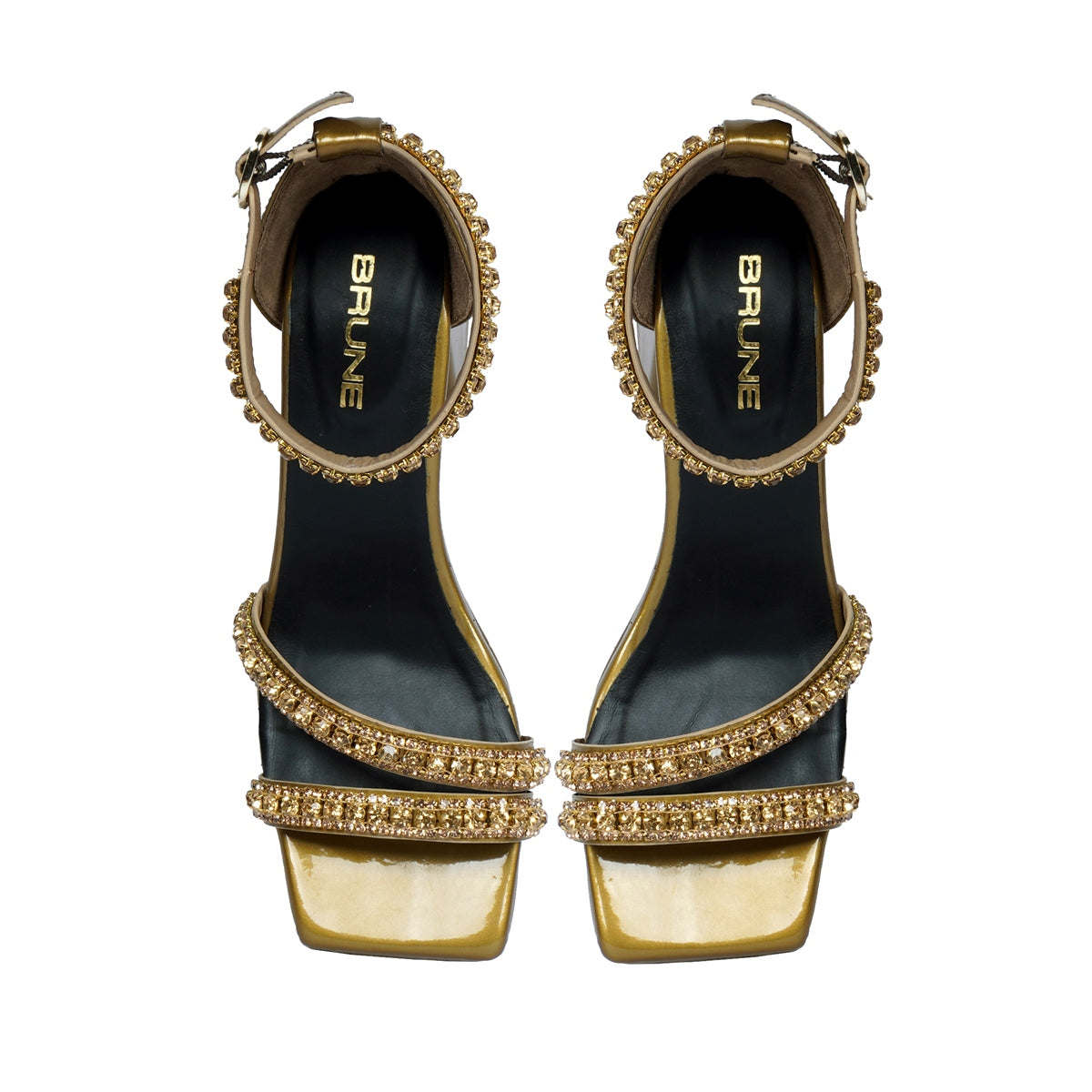 Golden Rhinestone Beads Embellishment Blocked Heel Buckled Strap Patent Leather Ladies Sandal By Brune & Bareskin