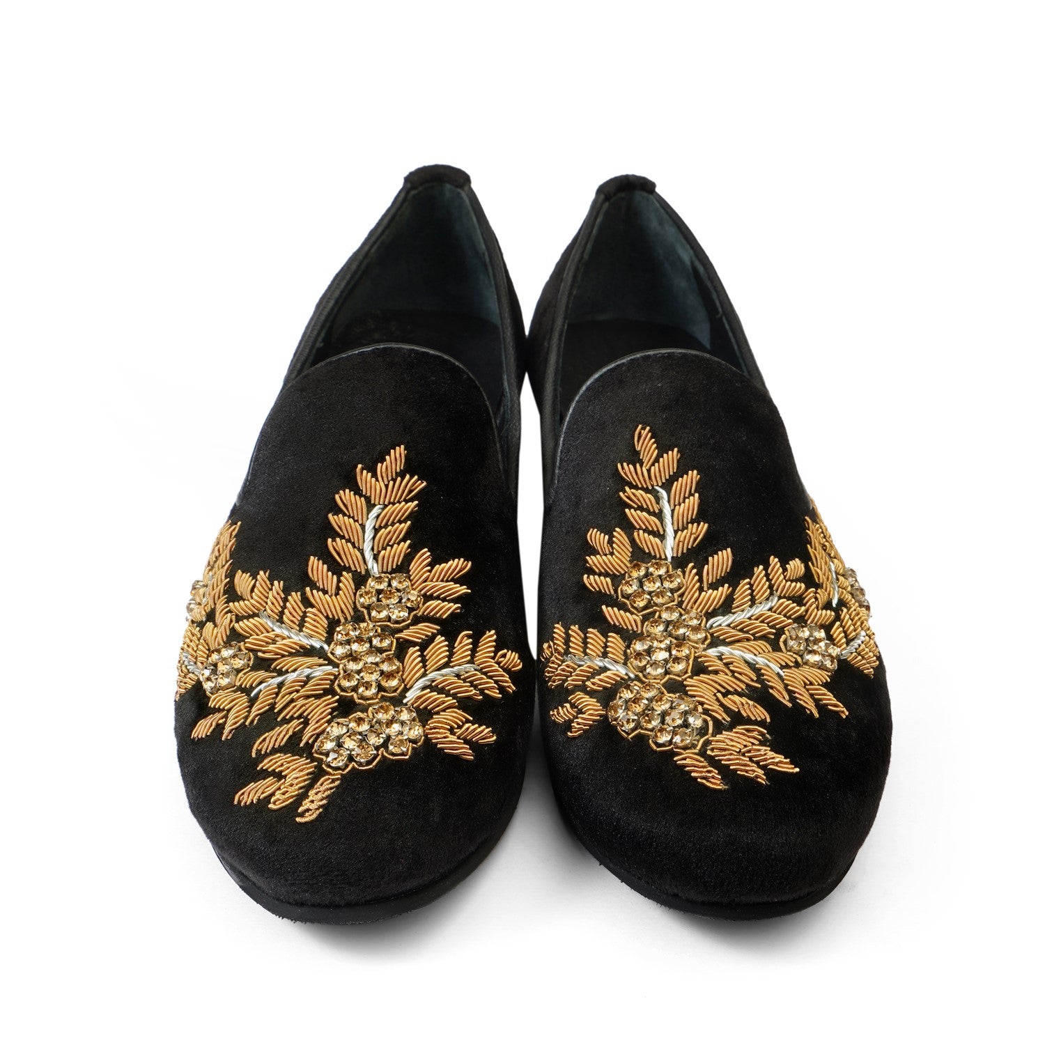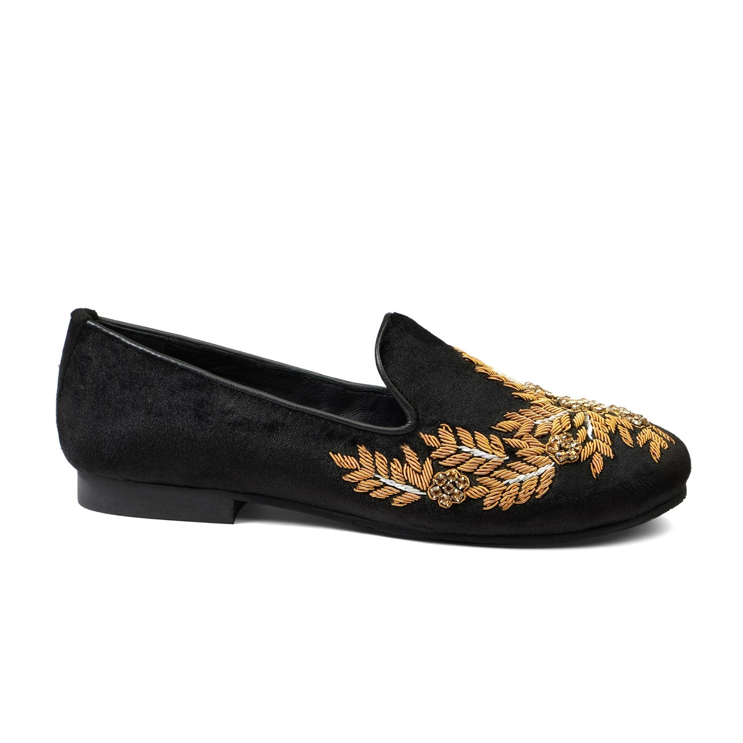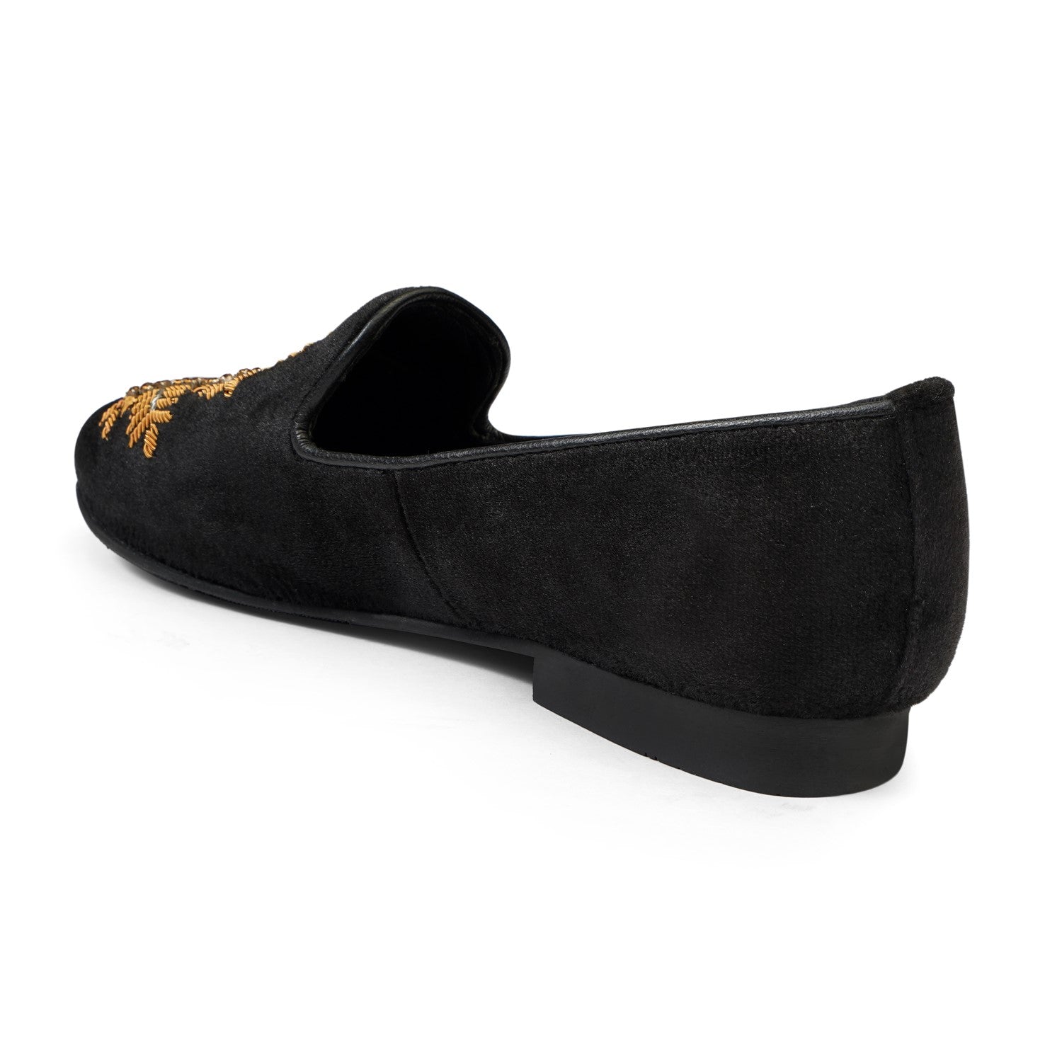 Golden Zardosi-Embroidered Slip-On Shoes in Black Italian Velvet