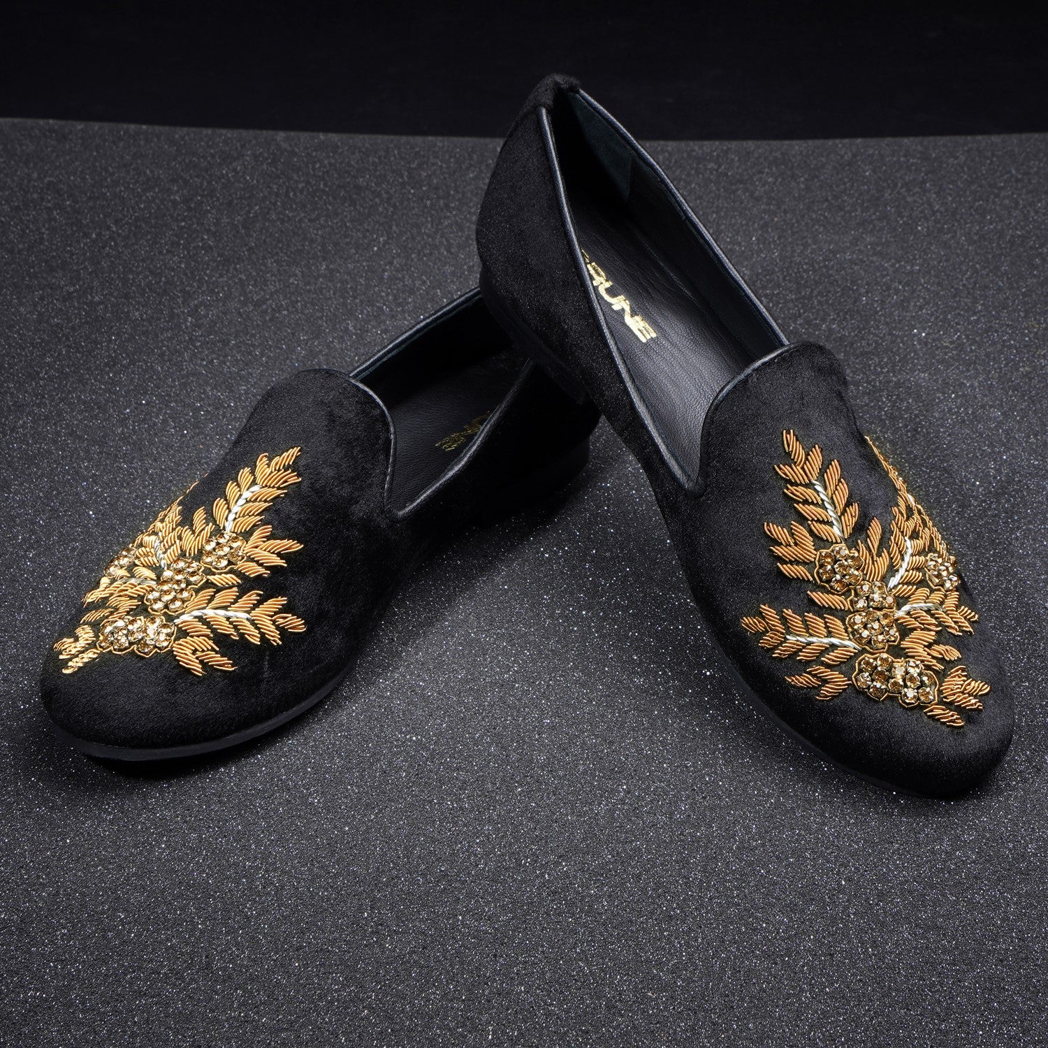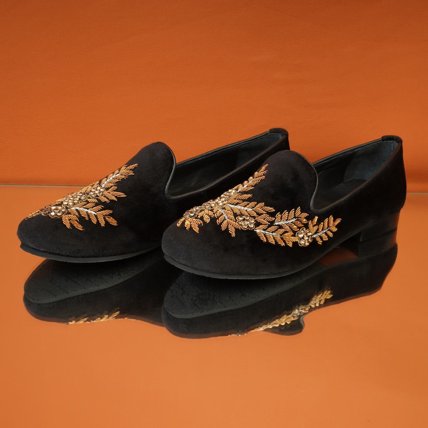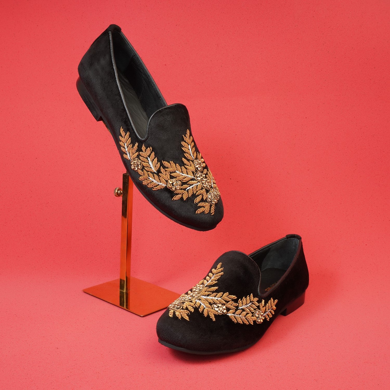 Golden Zardosi-Embroidered Slip-On Shoes in Black Italian Velvet
