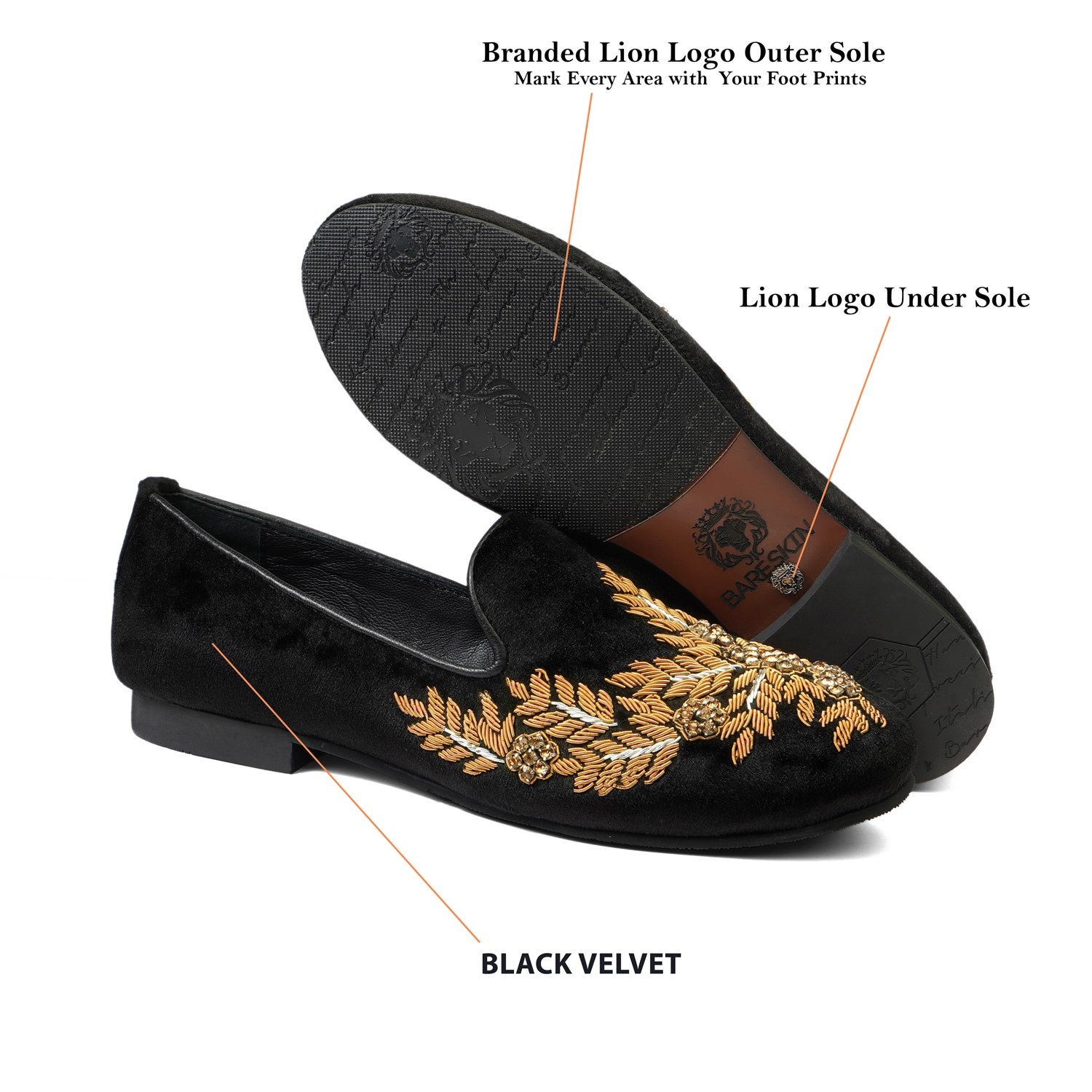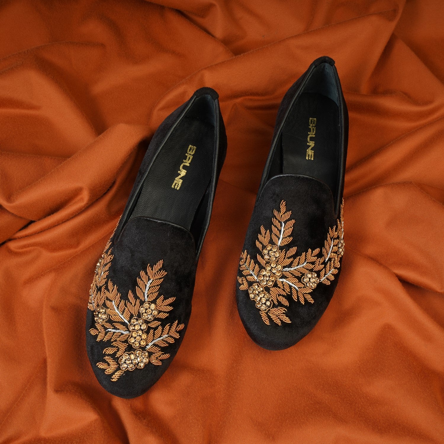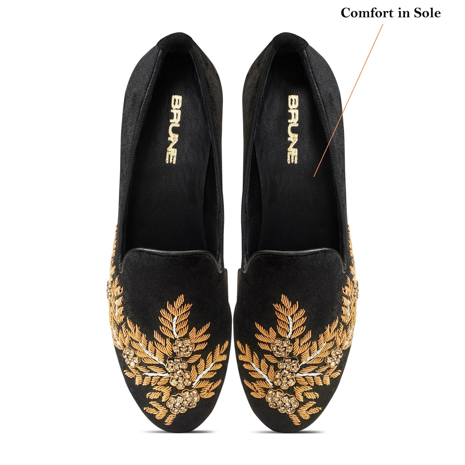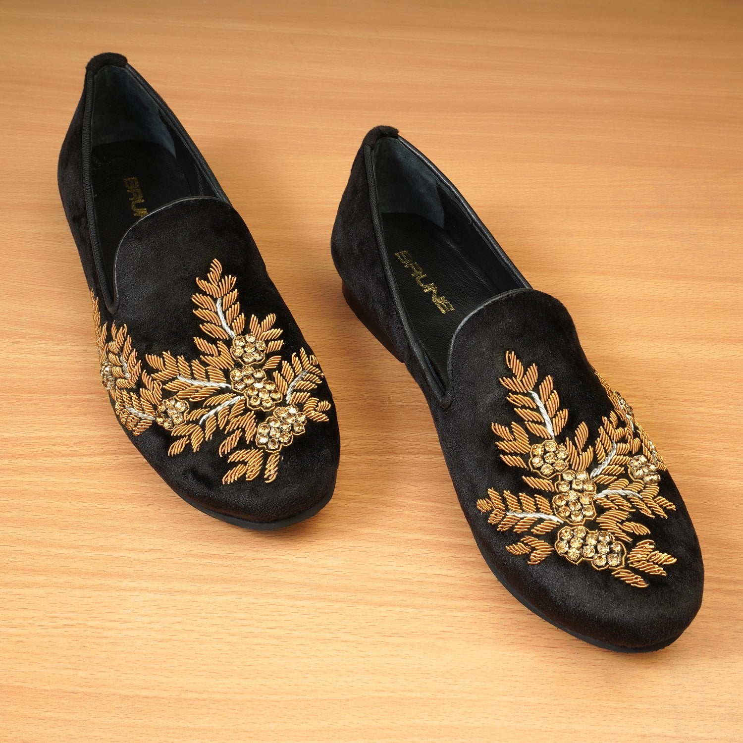 Brune & Bareskin's Extra comfy Black Leather slip-on shoes. Made using the most premium Leather, Rubber Sole with Anti Skid Pattern and extra cushioned padding in the insole. Zardosi Hand Work done by the most skilled sewing team in India makes this slip-on distinct from others. You just don't wear to Brune & Bareskin Shoes to Look Good. You wear them, because you have never worn a better Looking and Comfortable Ever Before This Day.