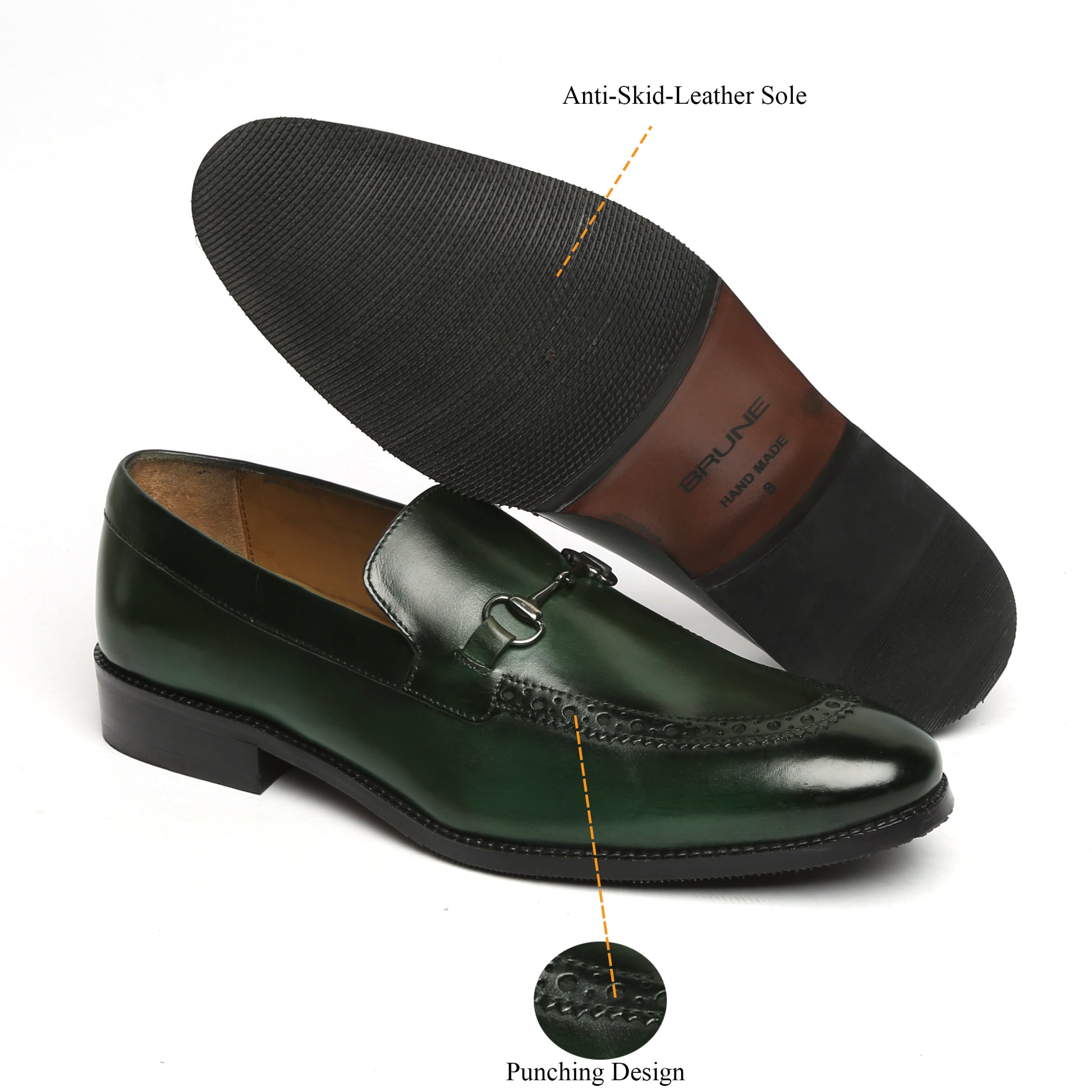 Loafers remain favorite style of shoes, as they are convenient to use and spell minimum fuss. And when they are made of exemplary fitting and finish as that of the brand Brune & Bareskin, you can be sure that the shoes are nothing short of excellence. These green leather shoes, with perfectly round toe and brogue punching apron toe design have a very stylish appearance. This is a must have pair in your footwear collection.