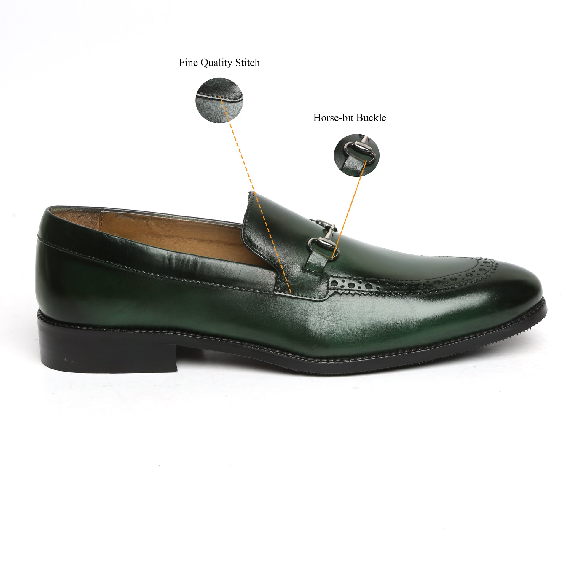 Horse-bit Detailing Leather Loafers with Green Punching Brogue Design