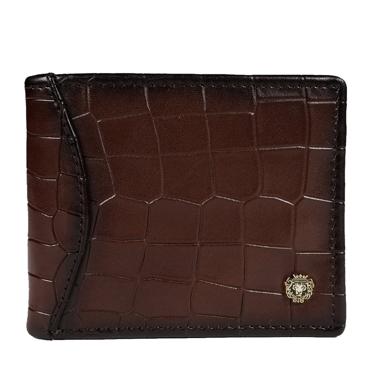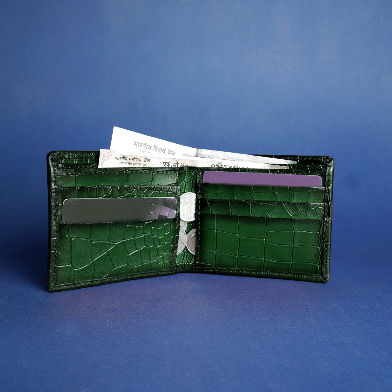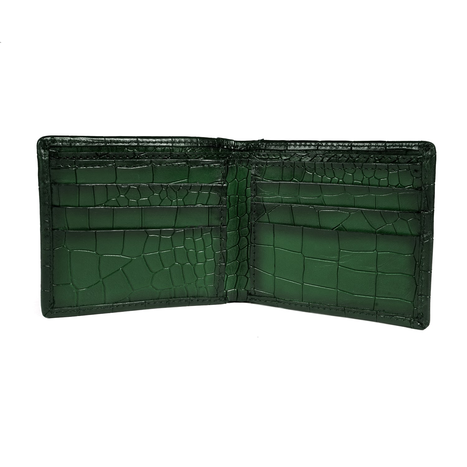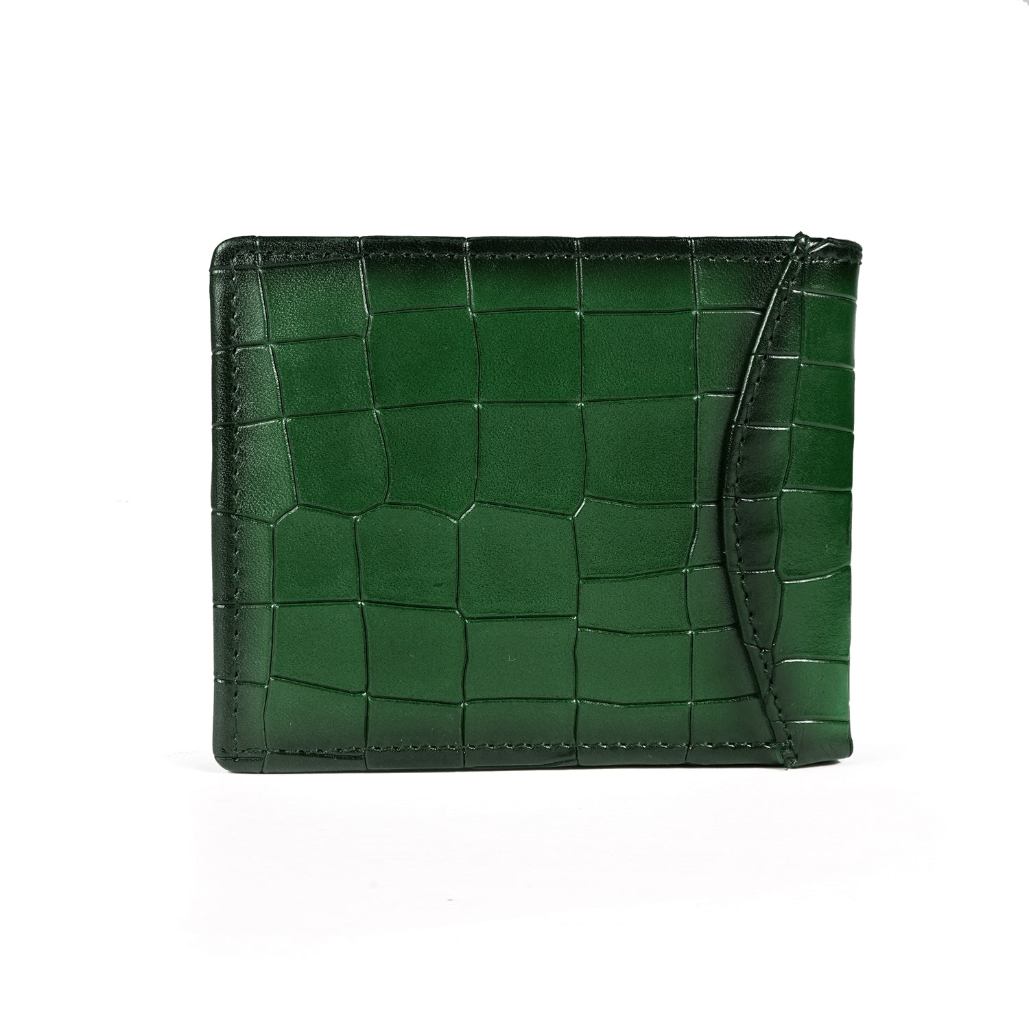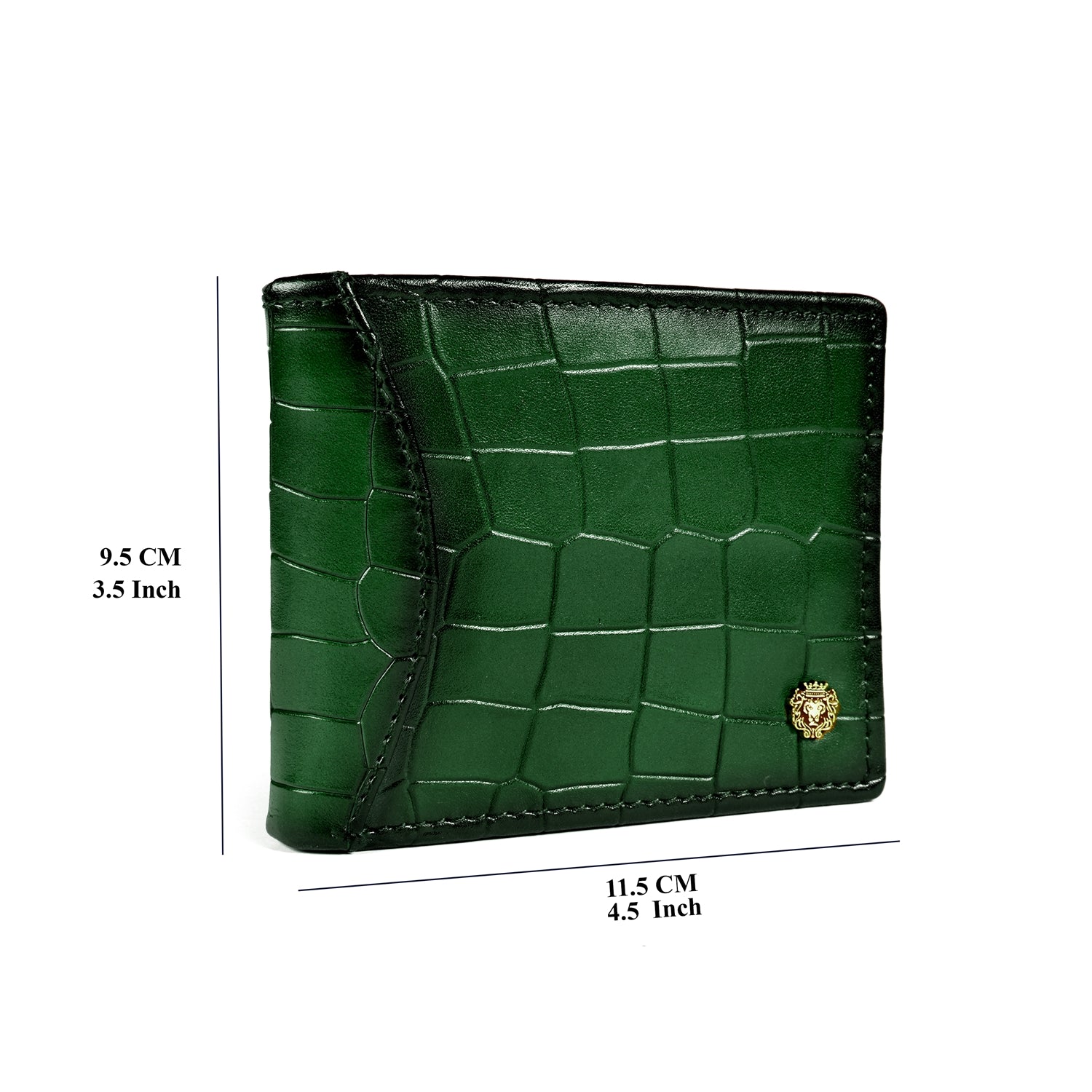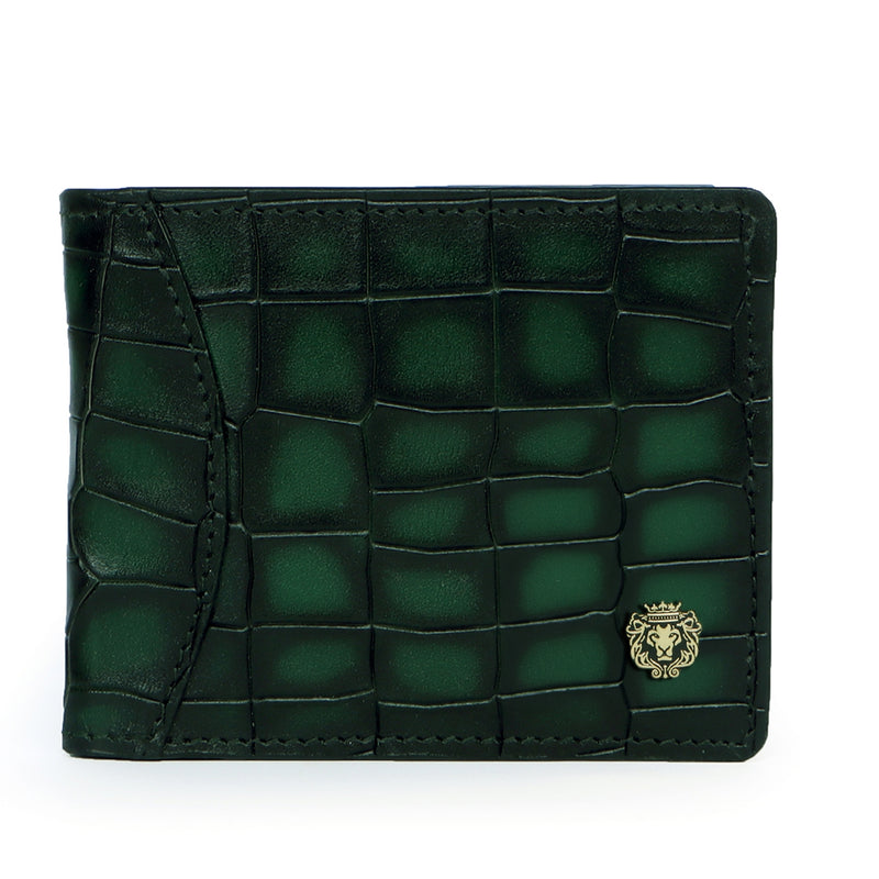 This bi-fold Green Croco print leather wallet with darker smudged edges looks very elegant. The Brune & Bareskin signature metal Lion brand logo increases the style quotient. Bi-fold opening wallet features two main pockets along with small secure pocket on both sides. It has the total of 10 pockets, which makes it a perfect buy for today's generation. It provides the style and storage with artistic Patina regime leather color shades. You can get your name initials on wallet with our bespoke services.
