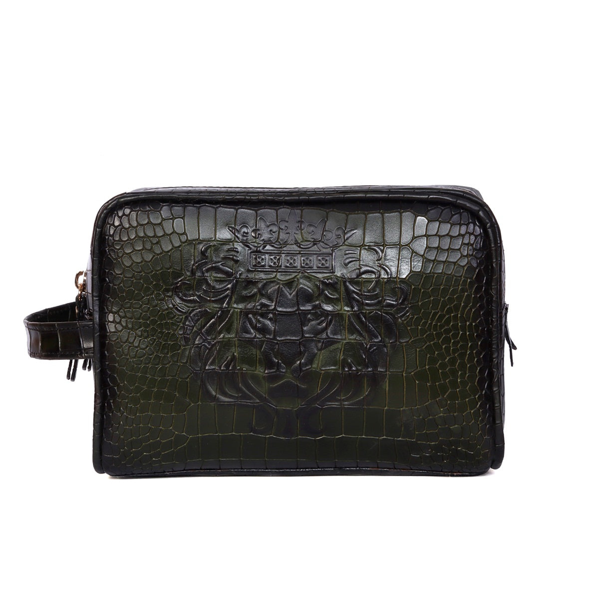 The leather Toiletry/Travel bag is a stylish and functional accessory designed for travel and organization. It is part of the Brune & Bareskin, known for their high-quality leather products. The bag comes in a green color, giving it an elegant and sophisticated appearance. The bag features a zip closure, ensuring the security of your belongings. It has two main compartments, providing ample space to store your toiletries, cosmetics, and other travel essentials. The compartments allow for easy organization and separation of items to keep them tidy during your journeys. On the front of the bag, you will find an embossed lion logo, which adds a touch of luxury and serves as a subtle branding element. The deep cut textured leather gives the bag a unique and visually appealing look, adding depth and character to its design.