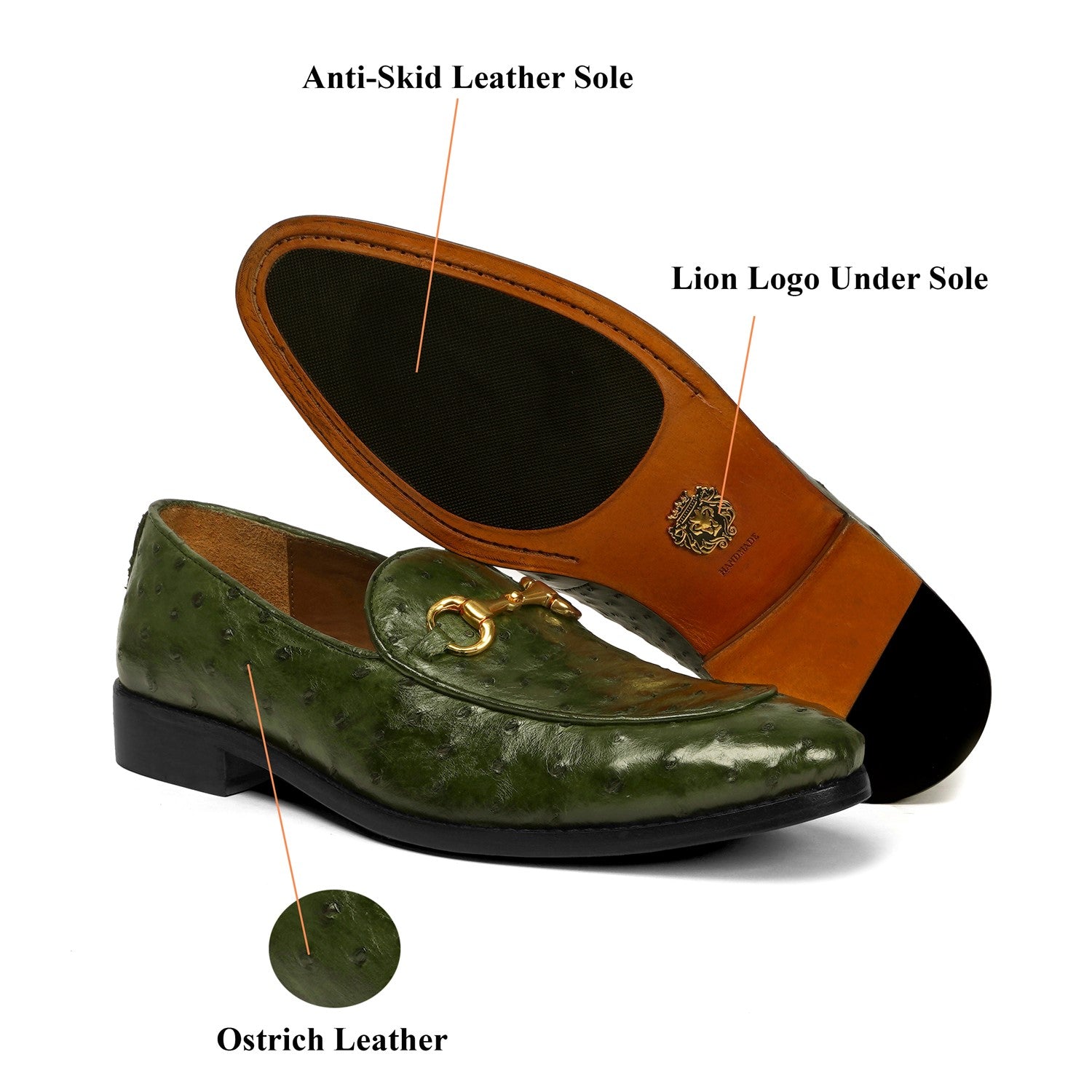 This pair of real Ostrich leather loafer is an ideal pick for cozy and elegant everyday wear. This pair of loafers shoes in astonishing leather is ideal for everyday wear to the office or for meetings with clients. This is the best category of every men's closet. Green ostrich leather shoe looks lavishing with golden horse-bit on the ostrich green loafer enhances the chic style further on it. 100% pure ostrich leather is used for making your style. When you choose to wear branded, shoes by BRUNE & BARESKIN, you are sure to get more than a few glances coming your way. The rugged look and ultra-lightweight make it the perfect pair that every guy should have in the closet.