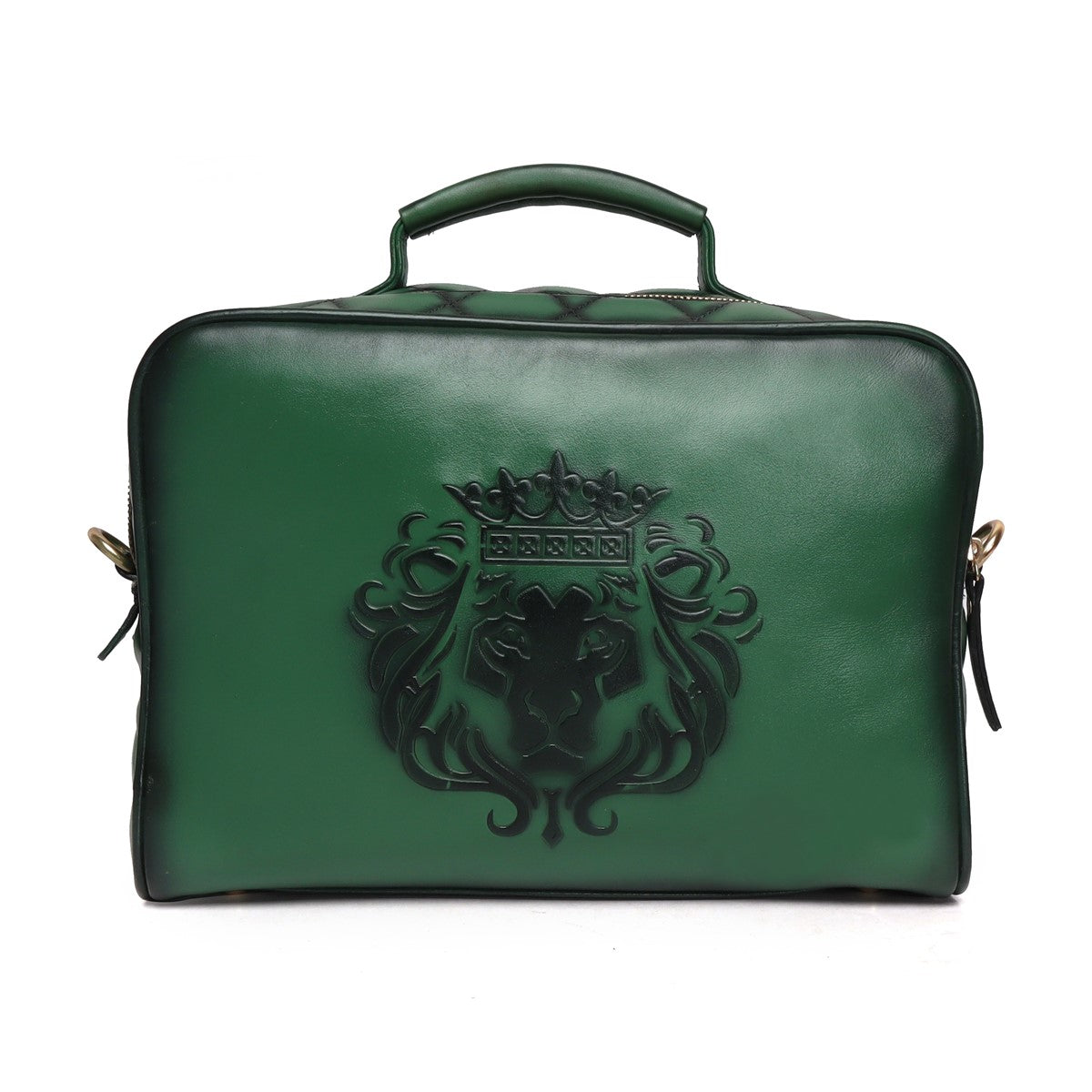 This eye catching kit bag in green color is best for its elegant design & durability. It is made up of genuine leather & hand painted in Green color by our artisans. The diamond cushioned cuts all around & embossed lion logo enhancing its look. It is more spacious with two pockets to carry your accessories. This kit is quite very handy for the travelers and the perfect for corporate sector also. The long leather strap helps to wear it as sling bag or cross body bag as per your comfort.