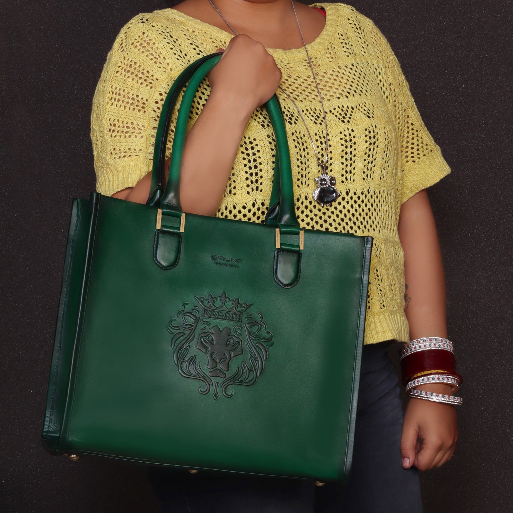 Medium Sized Green Genuine Leather Women bag is one of the most easiest to carry along with spacious space. This trendsetter Genuine leather bag with Embossed Lion Logo on the front looks astonishing. It is perfect for a shopping. The ample space with multiple pockets allows it to carry for traveling. The main button compartment provides the extra security to it. This hand bag can be personalized with your name initials in any color shade and in any size with our bespoke services. This is a must-have addition to your fashion collection.