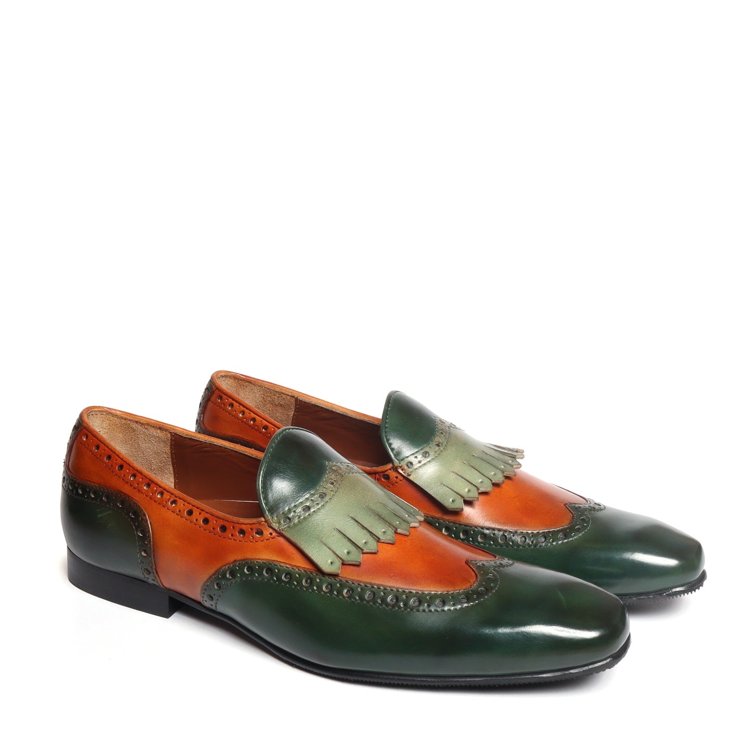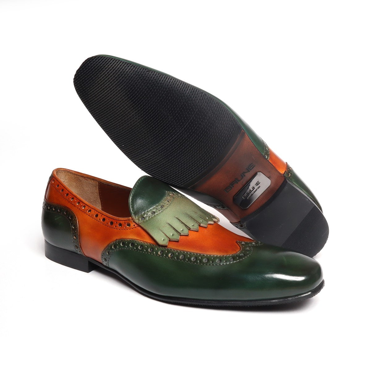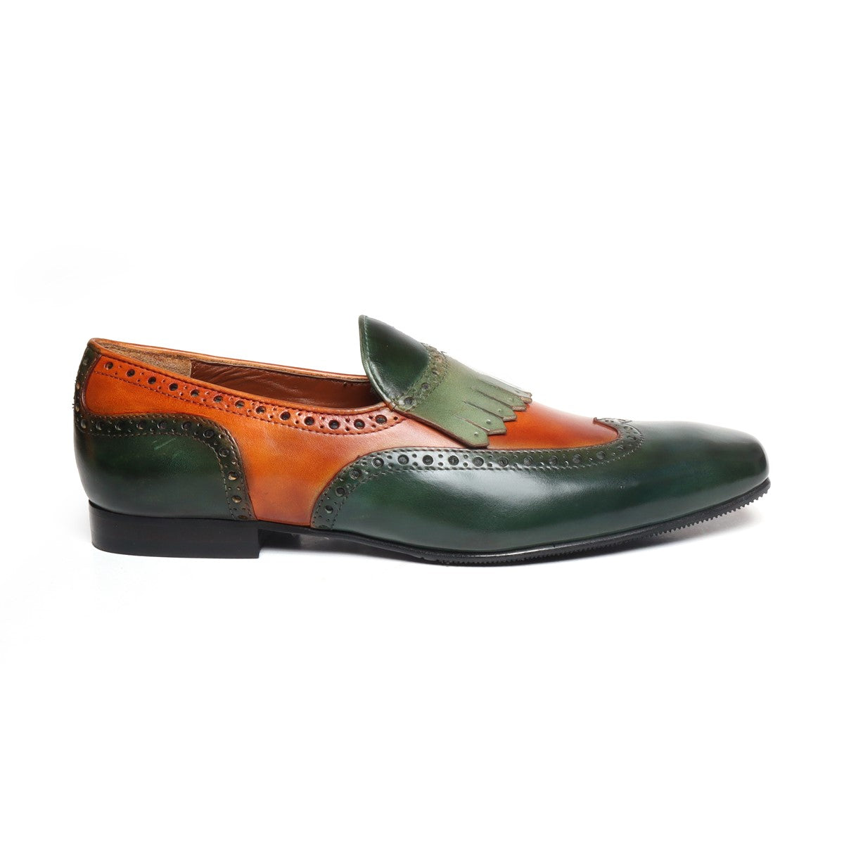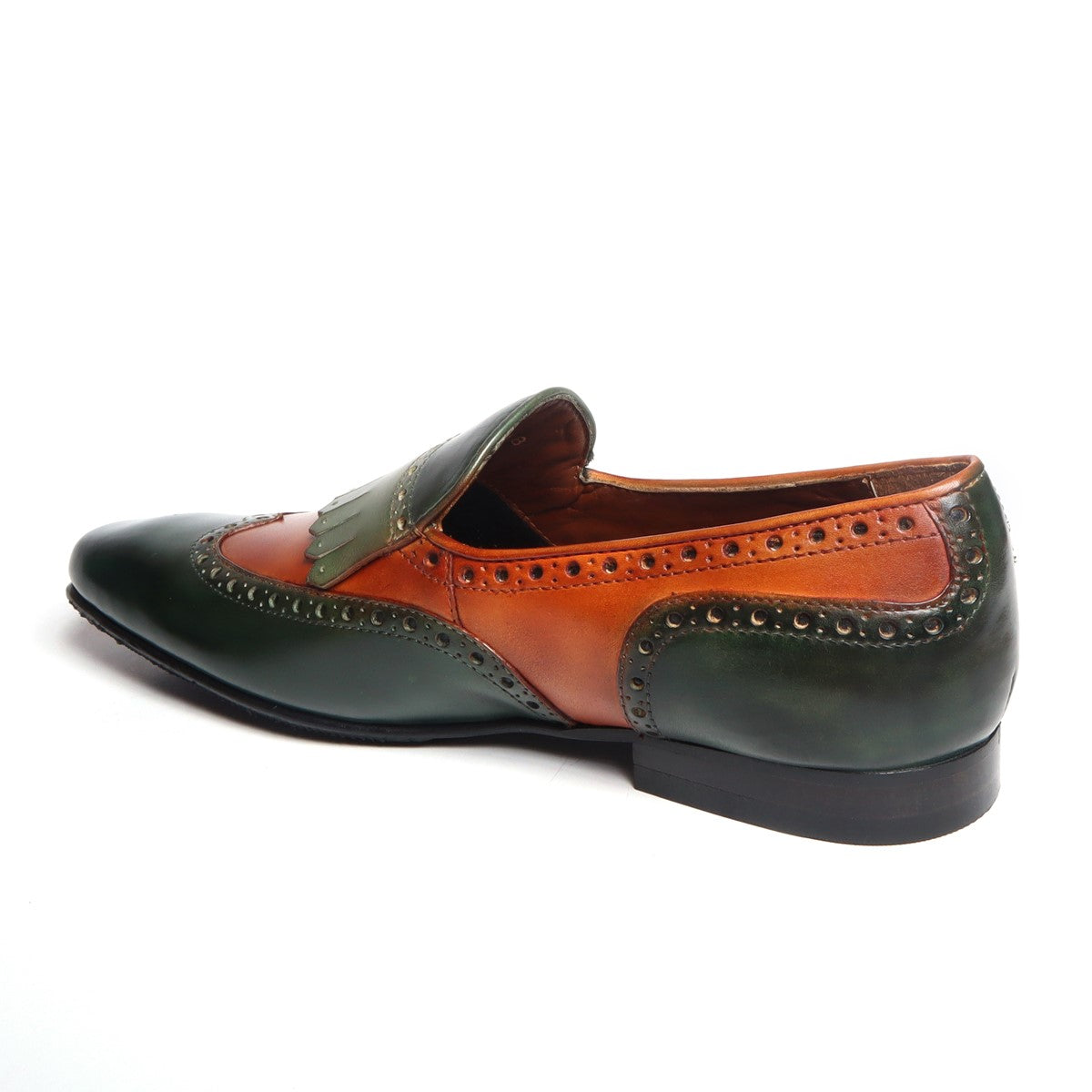 Green-Tan Dual Shade Leather Wingtip Brogue Fringes Slip On By Brune & Bareskin