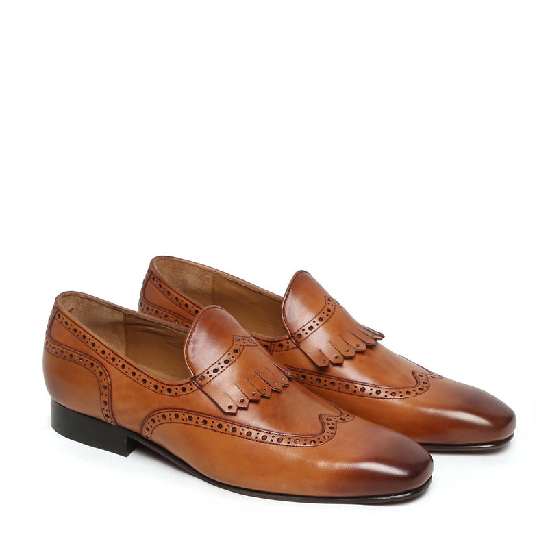 It is a pair of hand-colored tan and green leather brogue slip-on shoes with a stylish fringes design. For, it is often said that finding the perfect pair of shoes to wear for formal occasions is tough. Finding shoes that spell your style, besides being comfortable to wear, is definitely a challenge. However, these shoes will free you from that. The dual shade color makes it unique and enhances your style statement.
