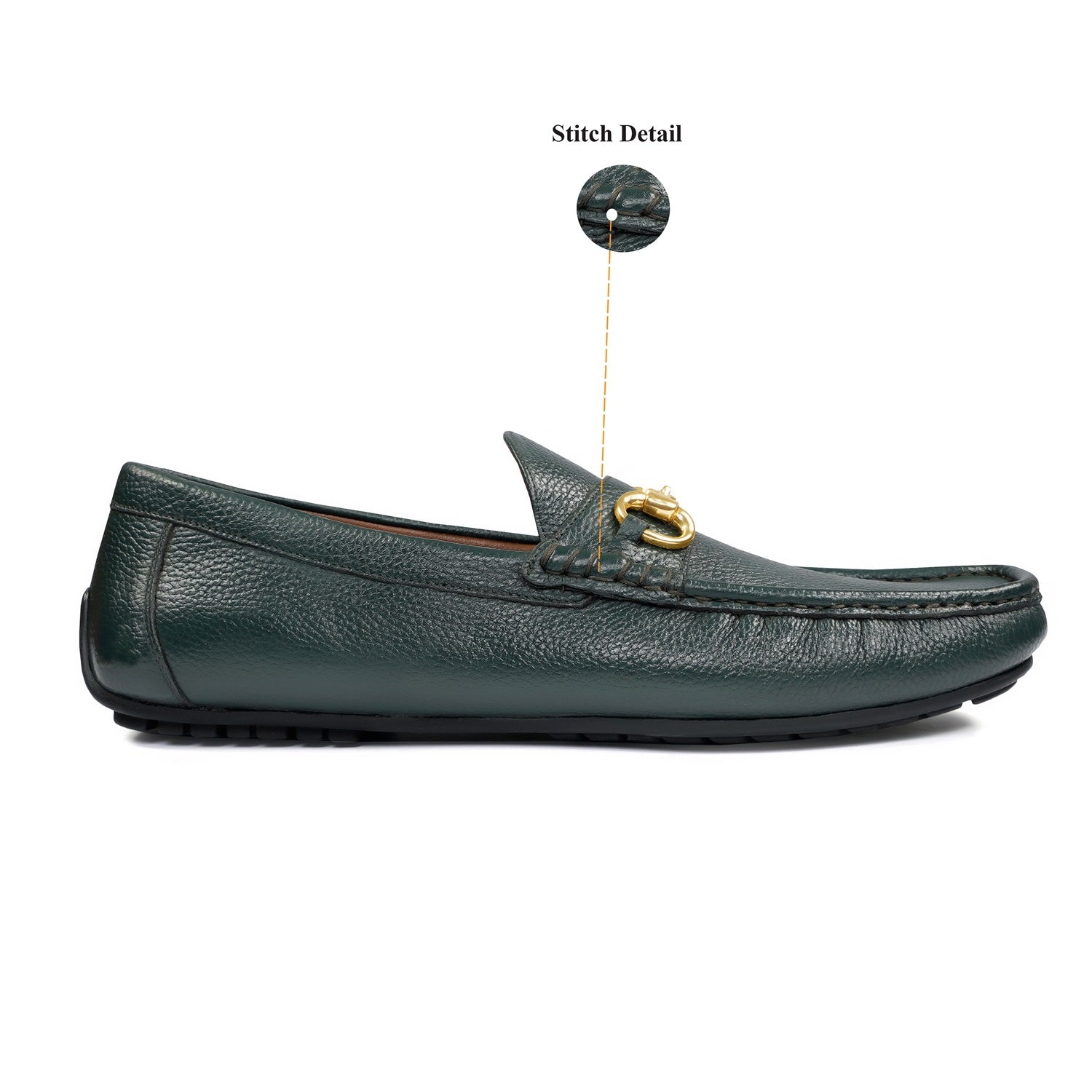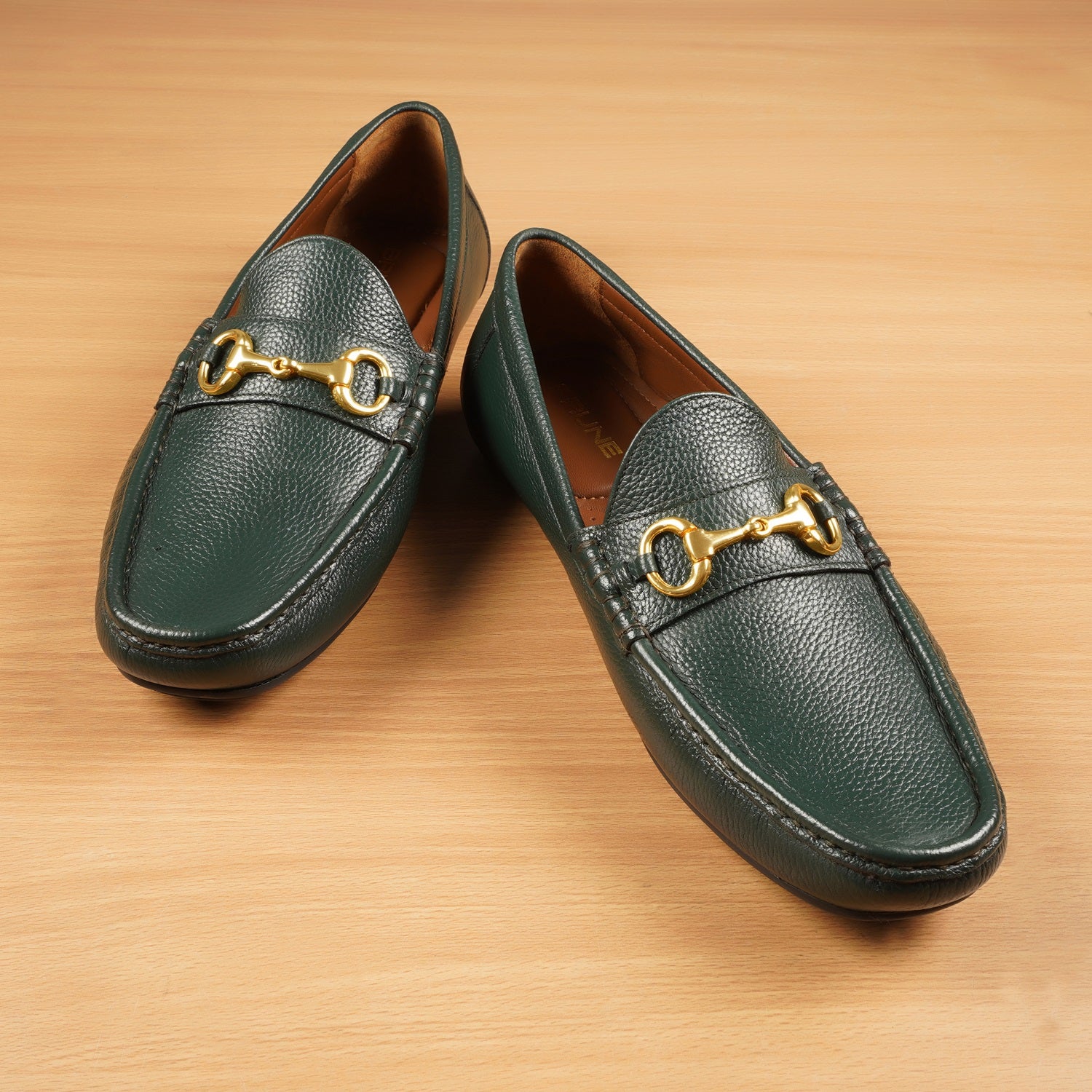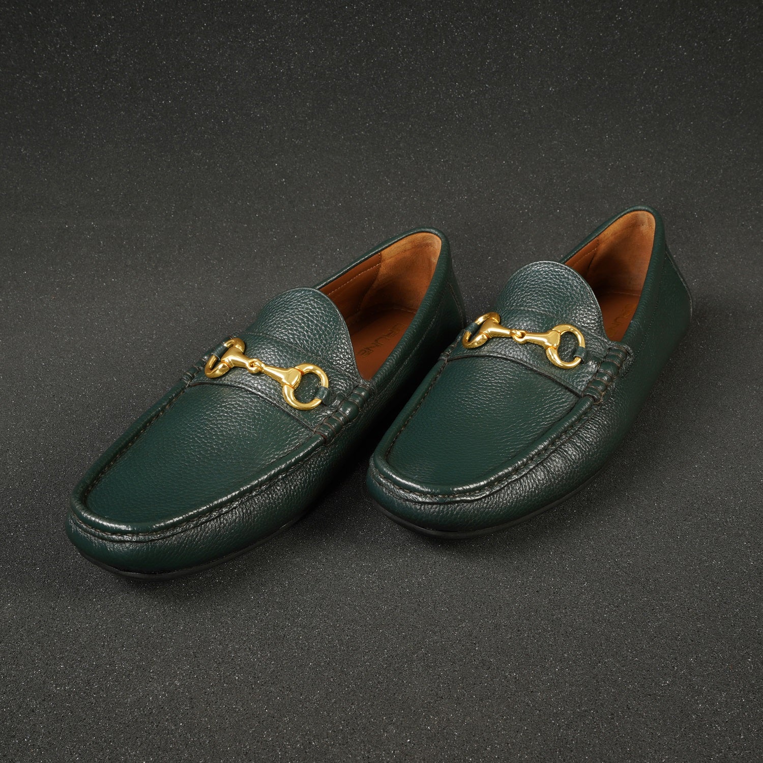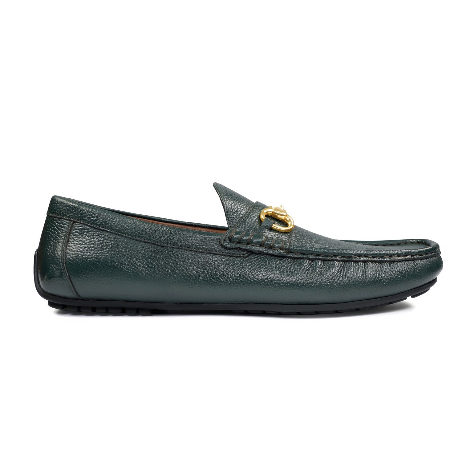 A modern twist on the classic moccasin slip-ons shoe is style thing to admire. The textured leather looks very elegant. The golden horse-bit on the textured green leather enhances the chic style further.