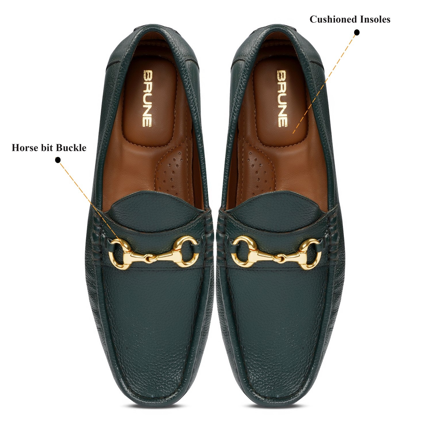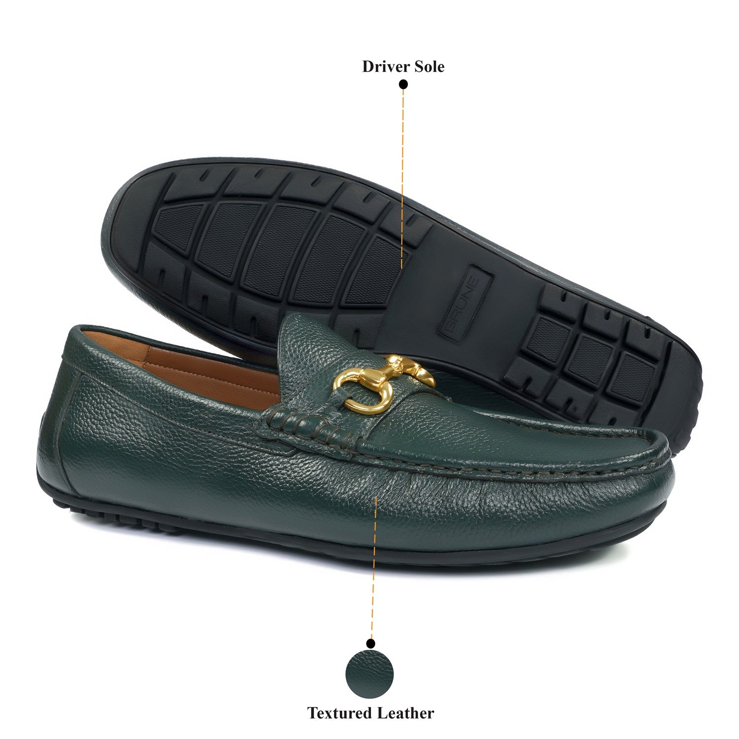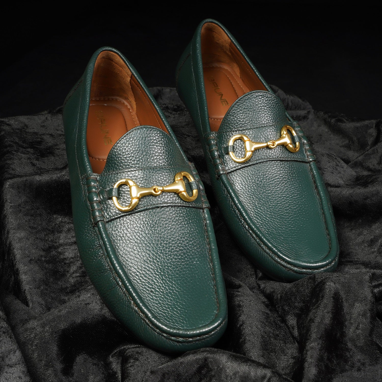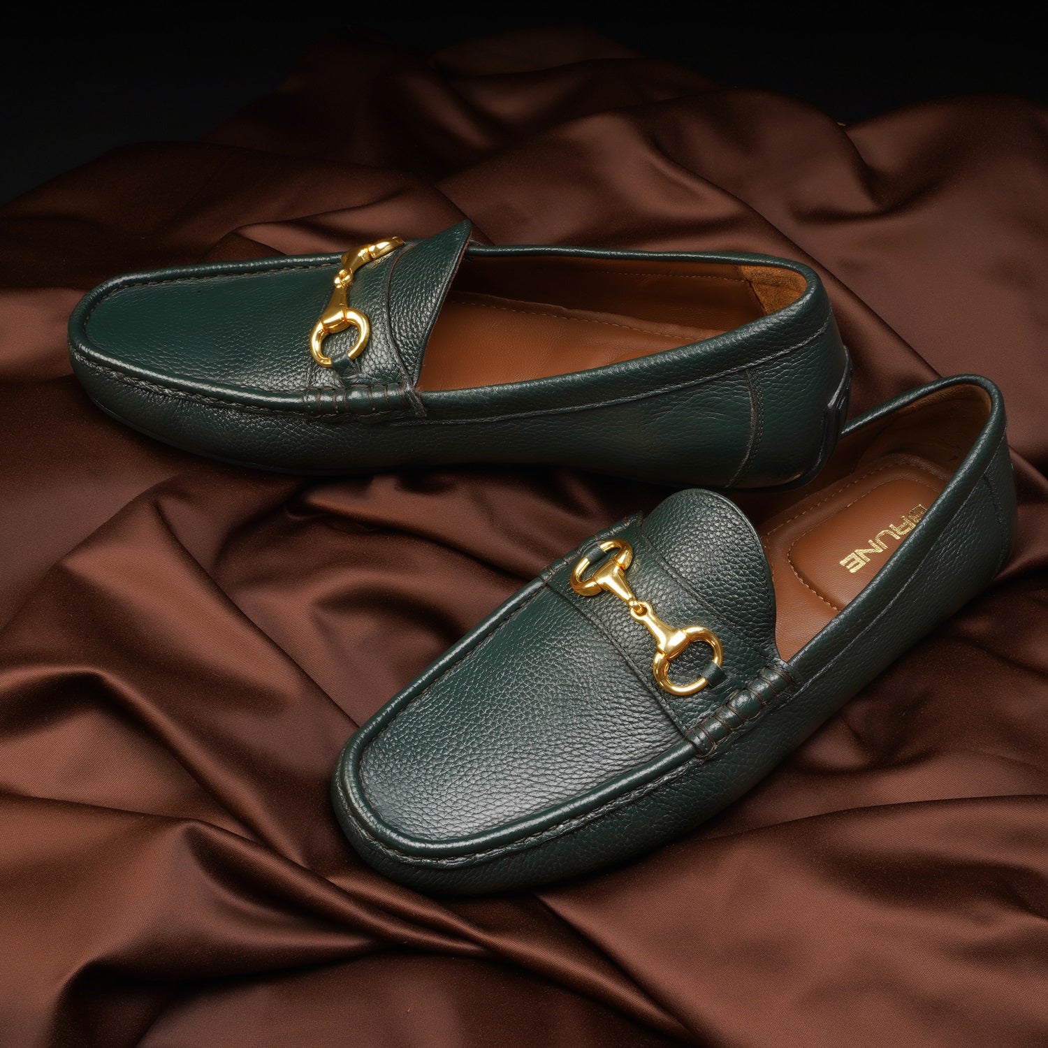 A modern twist on the classic moccasin slip-ons shoe is style thing to admire. The textured leather looks very elegant. The golden horse-bit on the textured green leather enhances the chic style further.