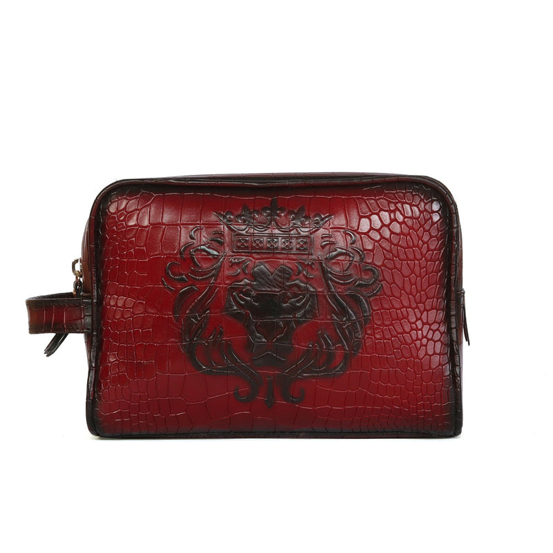The leather Toiletry/Travel bag is a stylish and functional accessory designed for travel and organization. It is part of the Brune & Bareskin, known for their high-quality leather products. The bag comes in a grey color, giving it an elegant and sophisticated appearance. The bag features a zip closure, ensuring the security of your belongings. It has two main compartments, providing ample space to store your toiletries, cosmetics, and other travel essentials. The compartments allow for easy organization and separation of items to keep them tidy during your journeys. On the front of the bag, you will find an embossed lion logo, which adds a touch of luxury and serves as a subtle branding element. The deep cut textured leather gives the bag a unique and visually appealing look, adding depth and character to its design.