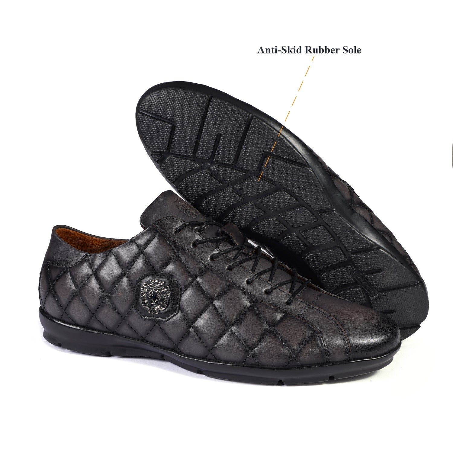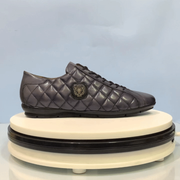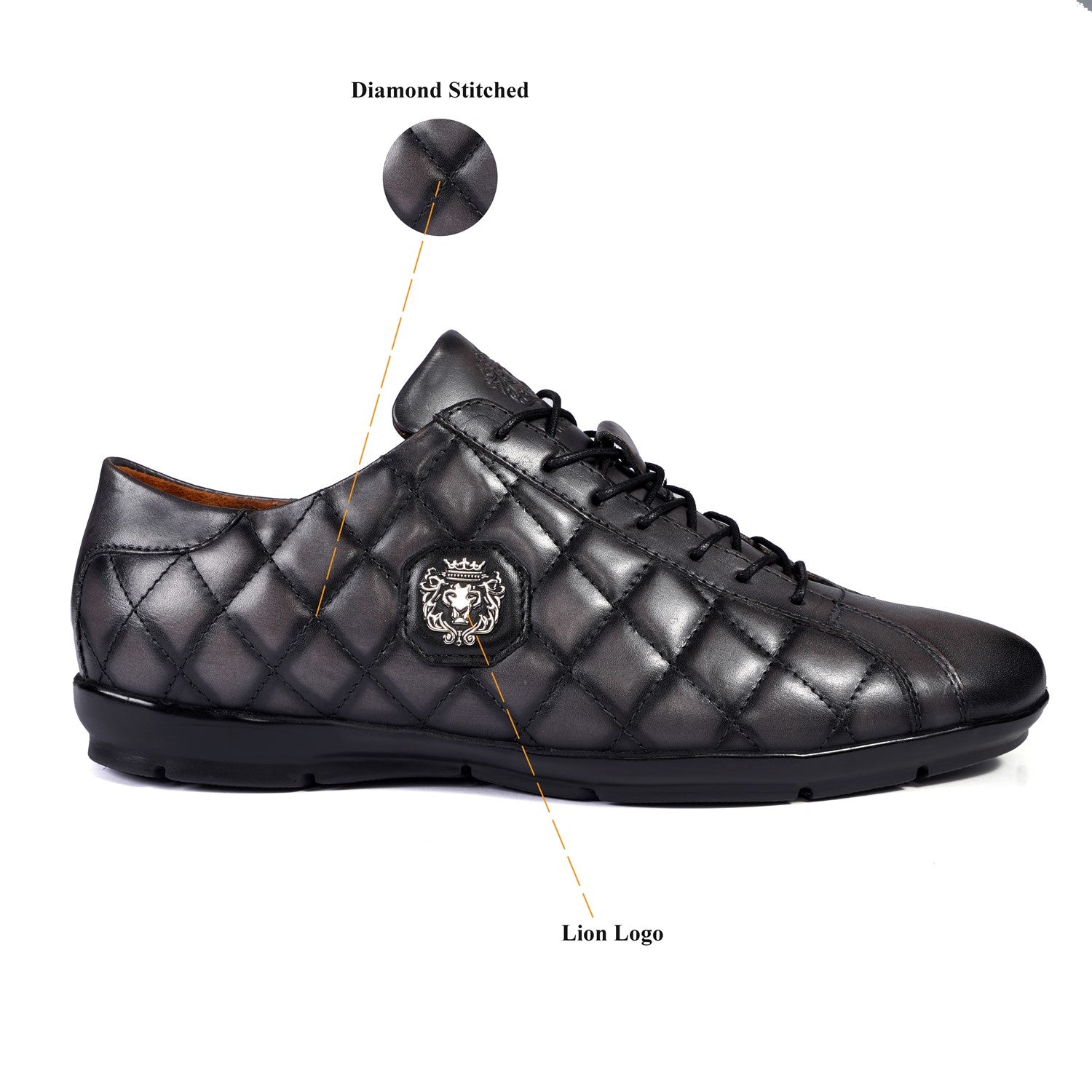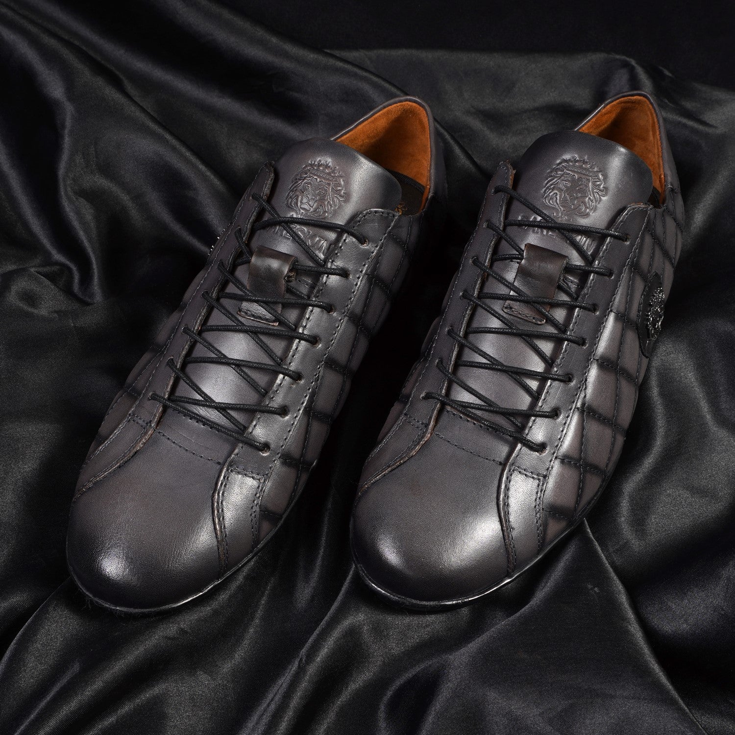 Men's Grey Leather Sneakers with Diamond Stitched Pattern & Metal Lion