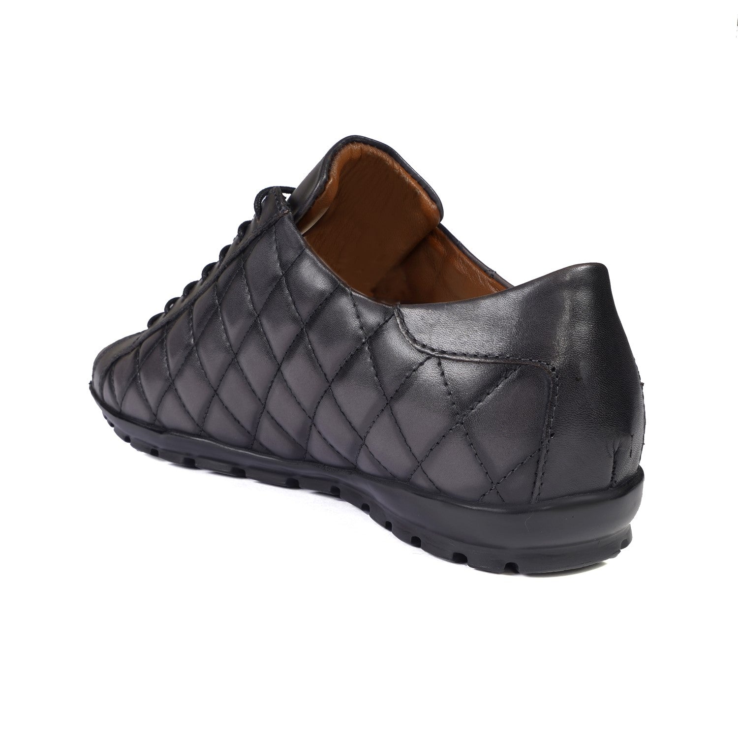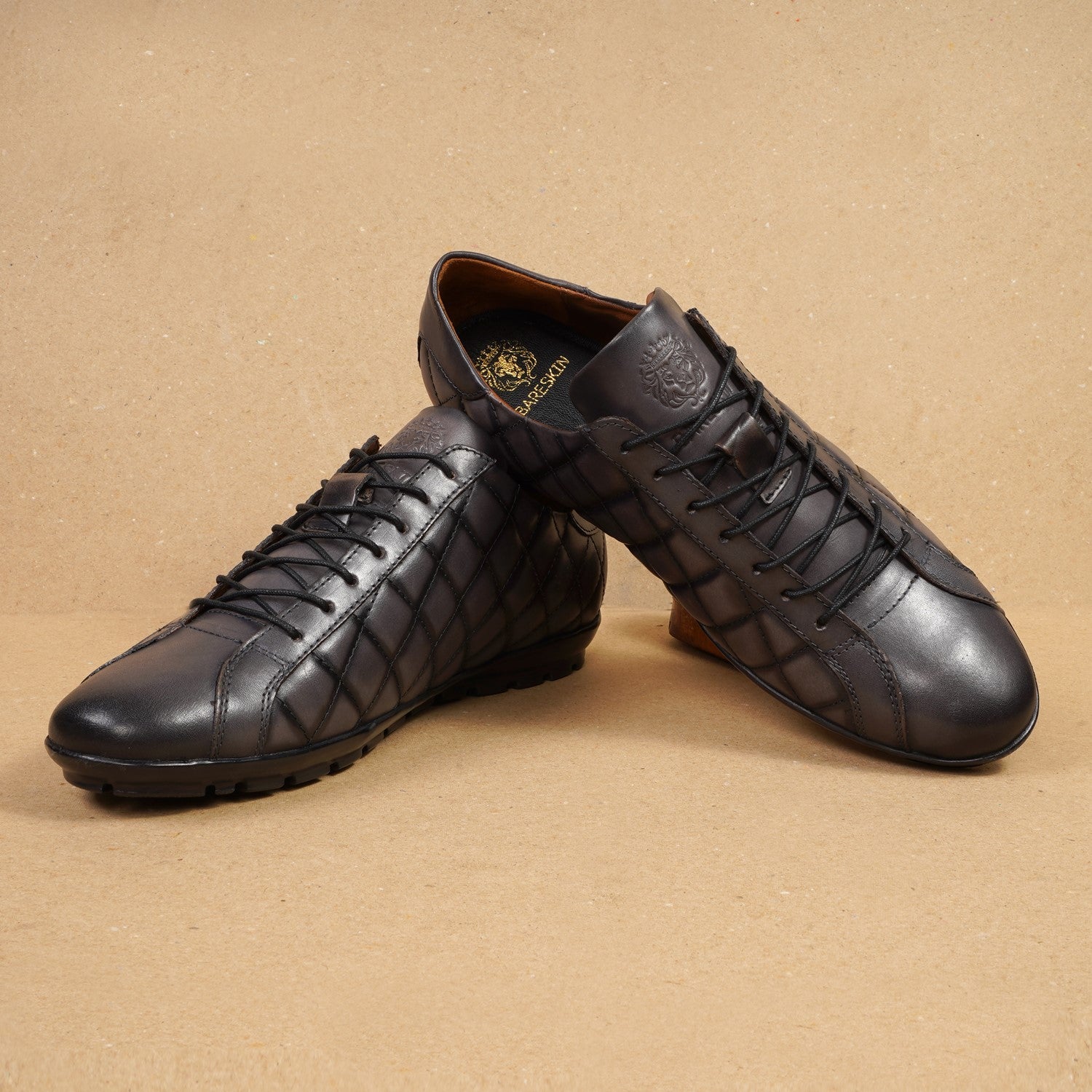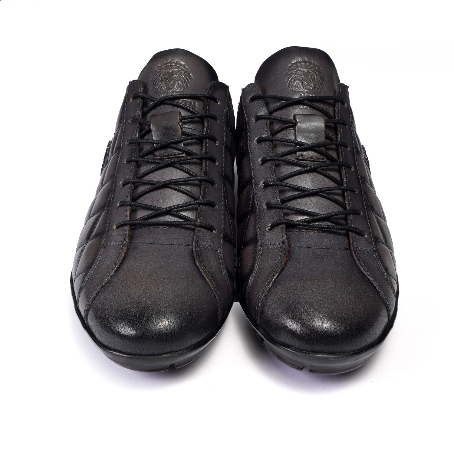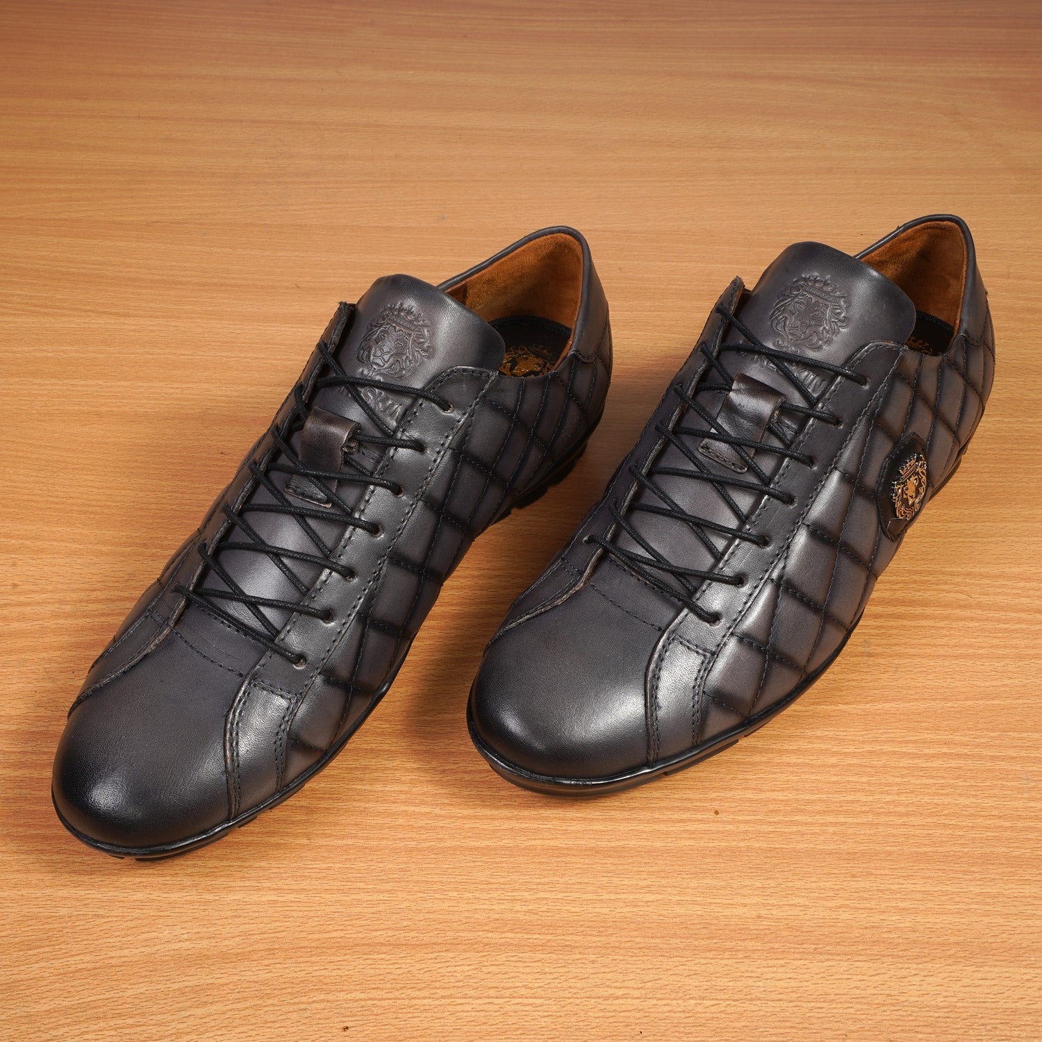 Men's Grey Leather Sneakers with Diamond Stitched Pattern & Metal Lion