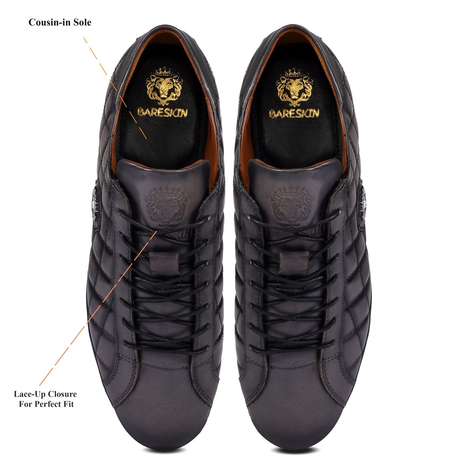 Look sporty and smart by wearing these Brune & Bareskin Grey Leather Diamond Stitched Sneakers Shoes. The metal BRUNE & BARESKIN Lion logo enhances its elegance. These Diamond Stitched sneakers have a 100% Genuine Leather upper which is crafted very precisely. The light weight patterned Rubber Sole provided the all day long wearability. Team these shoes with casual attires of your choice to look astonishing.