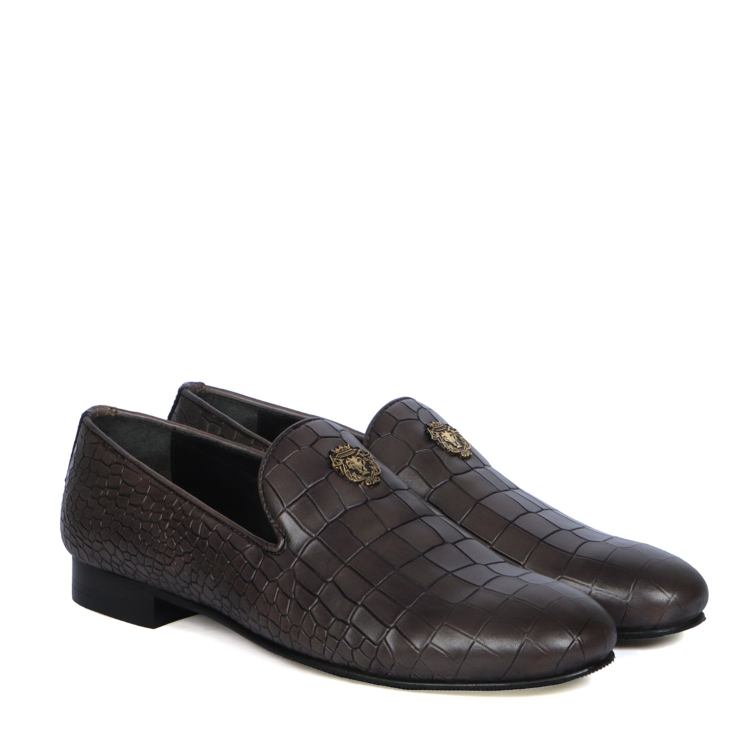 Grey Full Deep Cut Print Leather With Golden Metal Lion Logo Slip-On Shoes