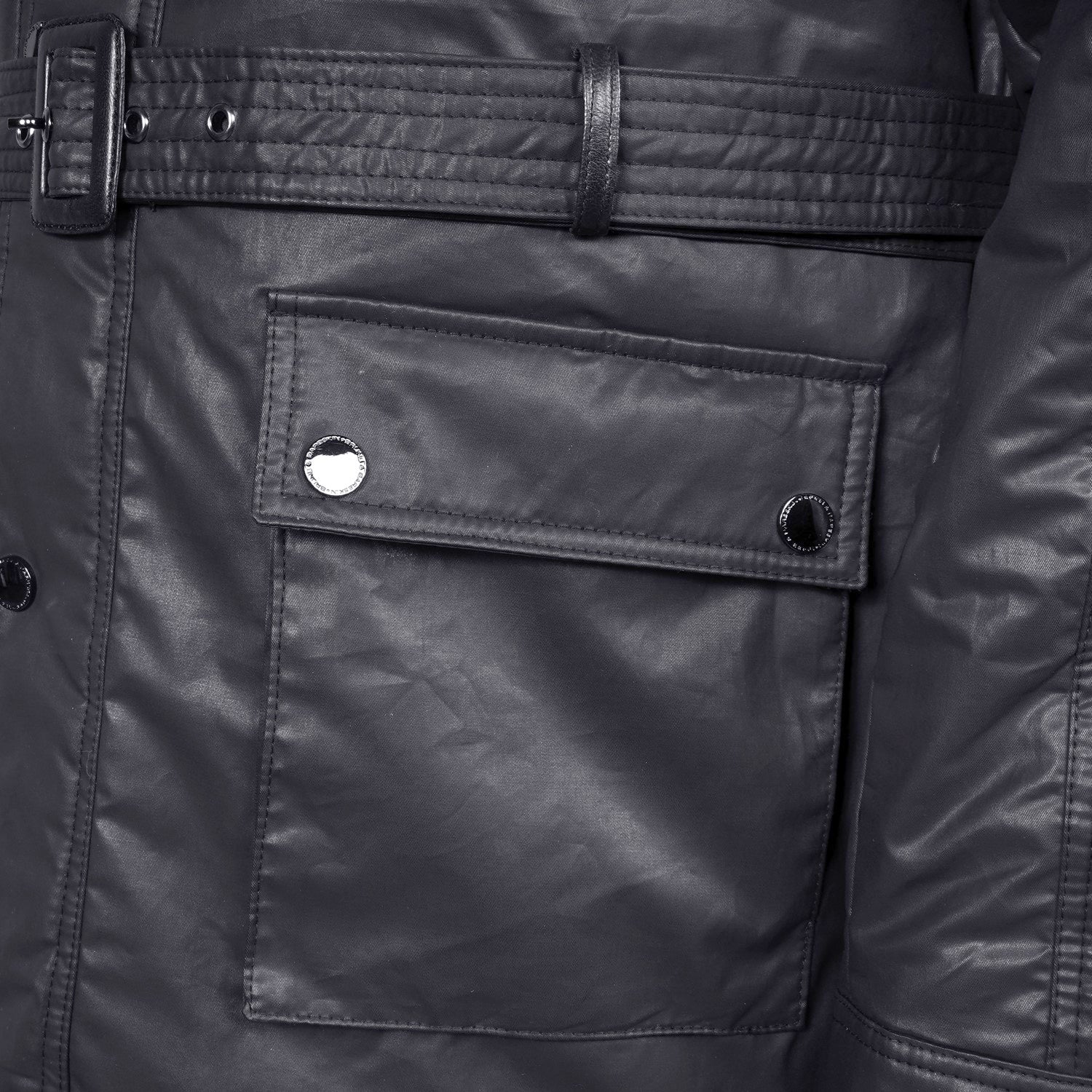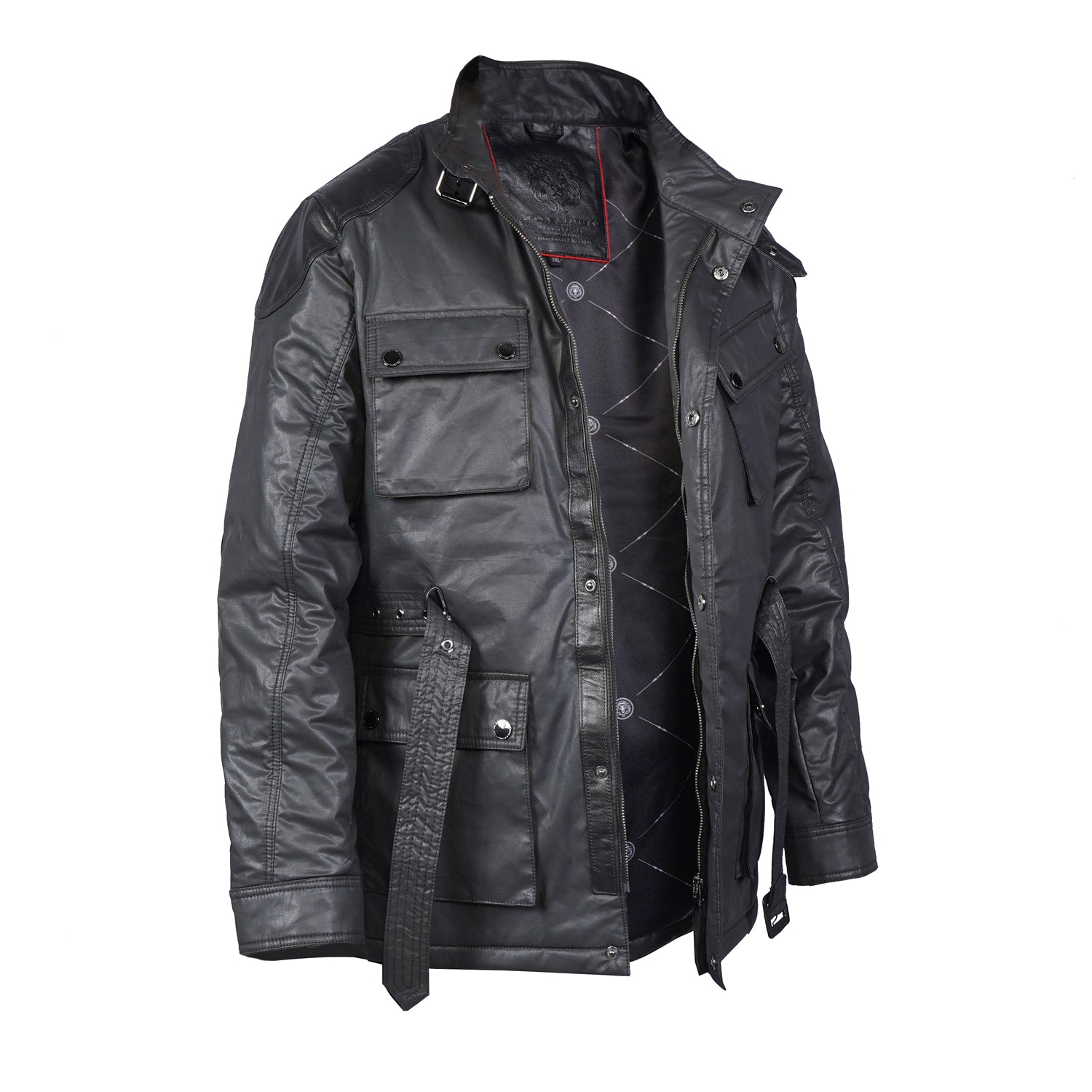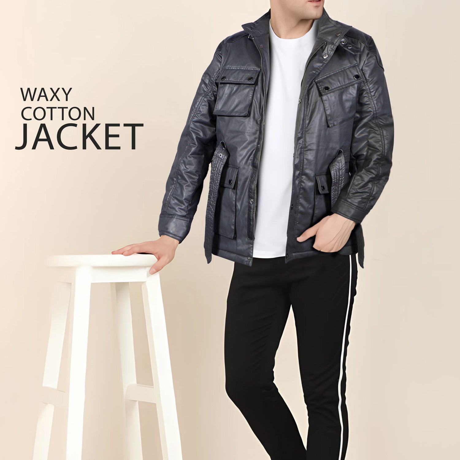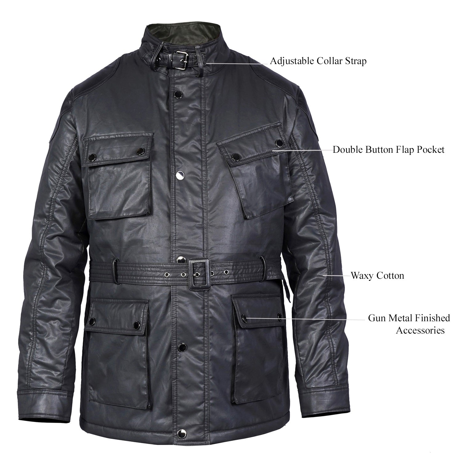 Introducing the Waxy Cotton Coat & safari jacket. Exuding impressive style and functionality, this handcrafted grey jacket features a high-closing collar, multiple flap pockets, and an inside concealed zipper for added security. With a dual look of jacket and coat, it offers a belted waist and buckle strap for a customizable fit and plenty of storage options with zippered chest and hand pockets. Stay light in weight without compromising on quality and elevate your look with this black masterpiece.