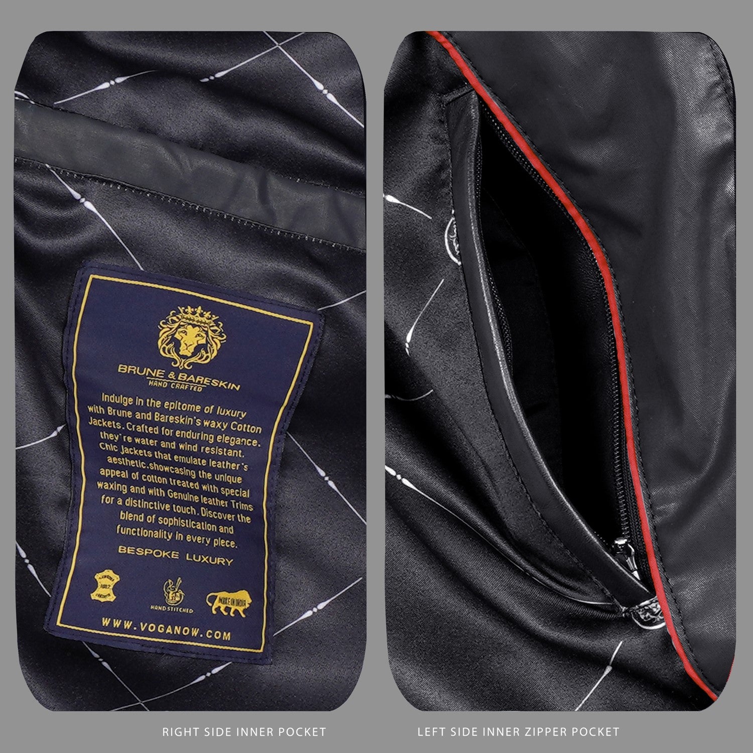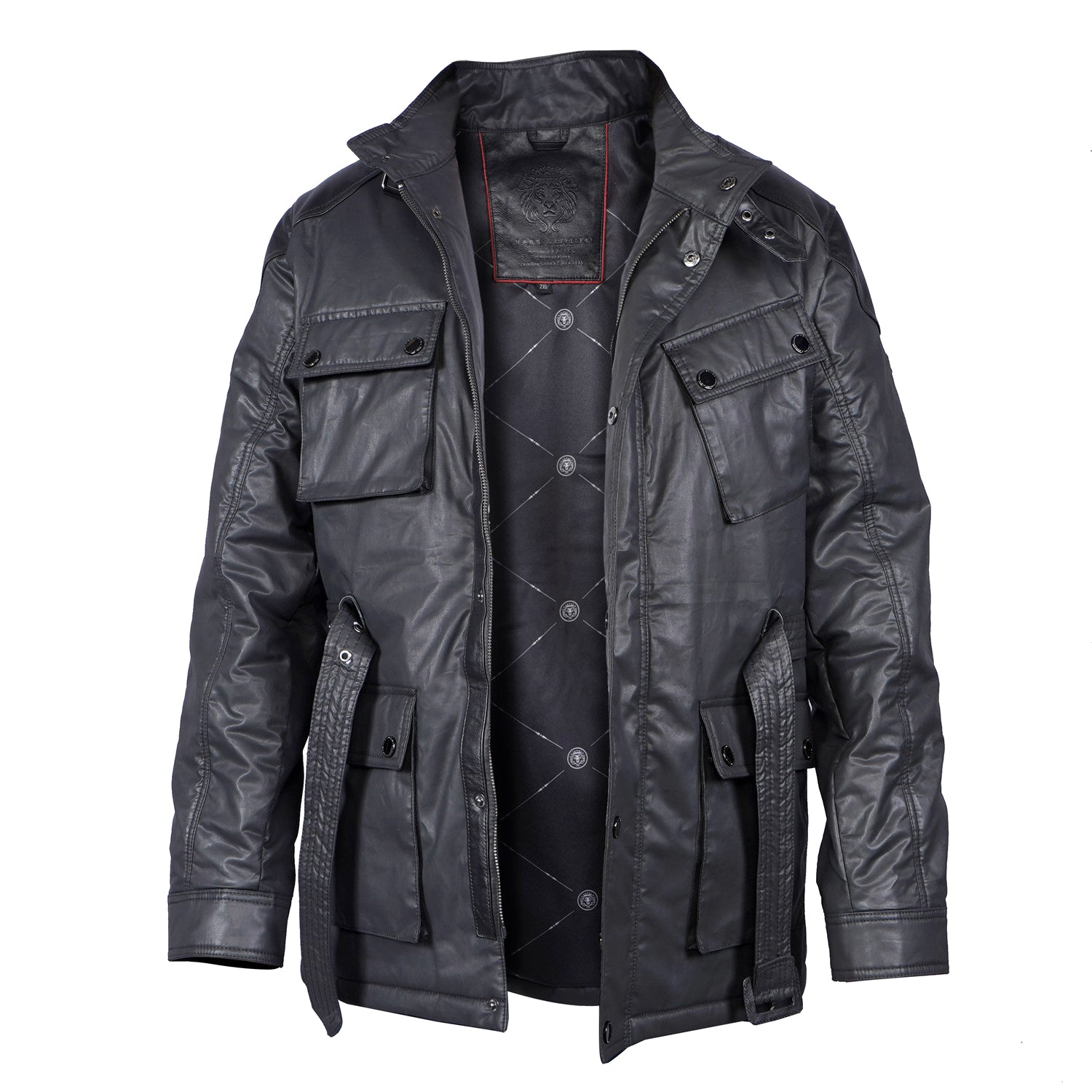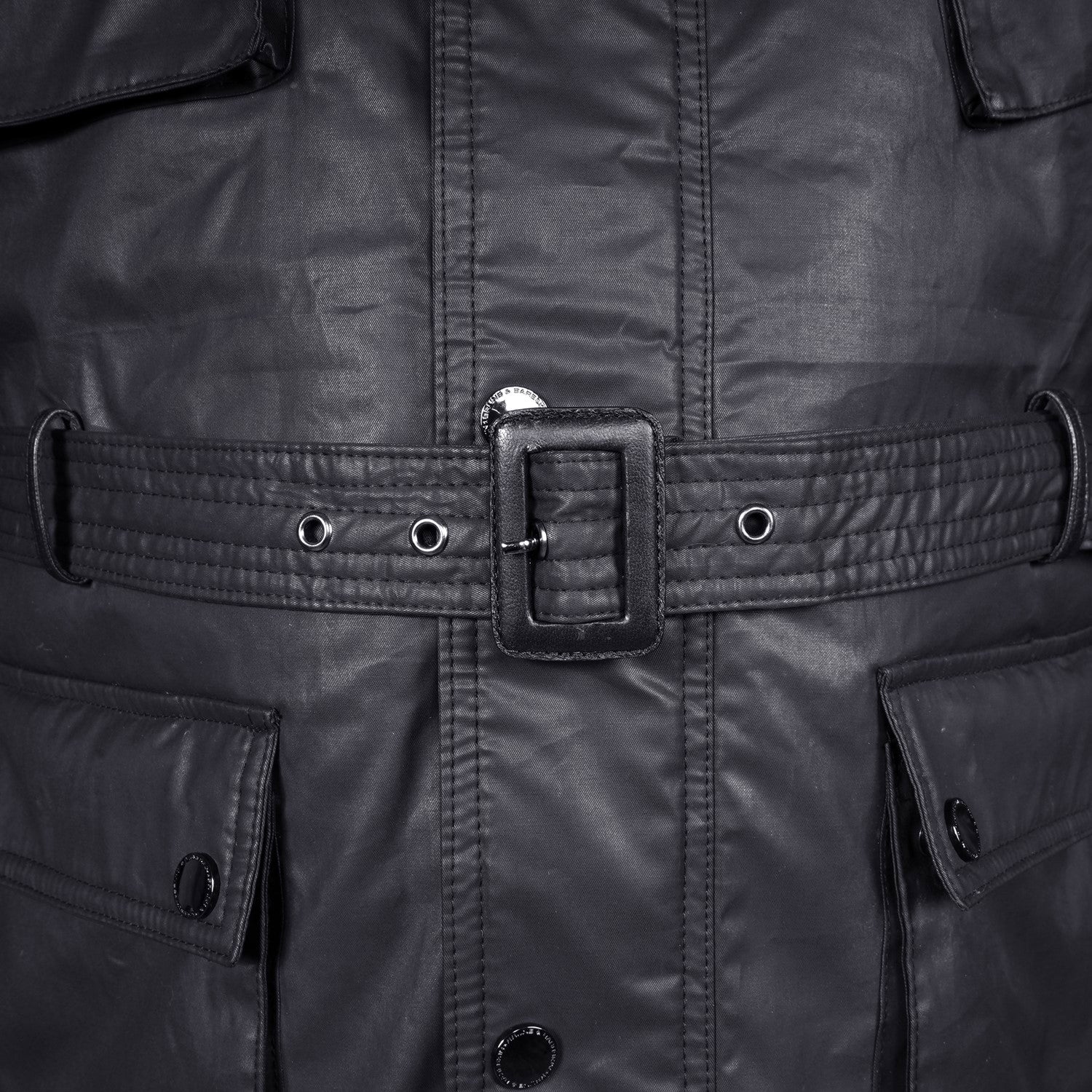 Introducing the Waxy Cotton Coat & safari jacket. Exuding impressive style and functionality, this handcrafted grey jacket features a high-closing collar, multiple flap pockets, and an inside concealed zipper for added security. With a dual look of jacket and coat, it offers a belted waist and buckle strap for a customizable fit and plenty of storage options with zippered chest and hand pockets. Stay light in weight without compromising on quality and elevate your look with this black masterpiece.
