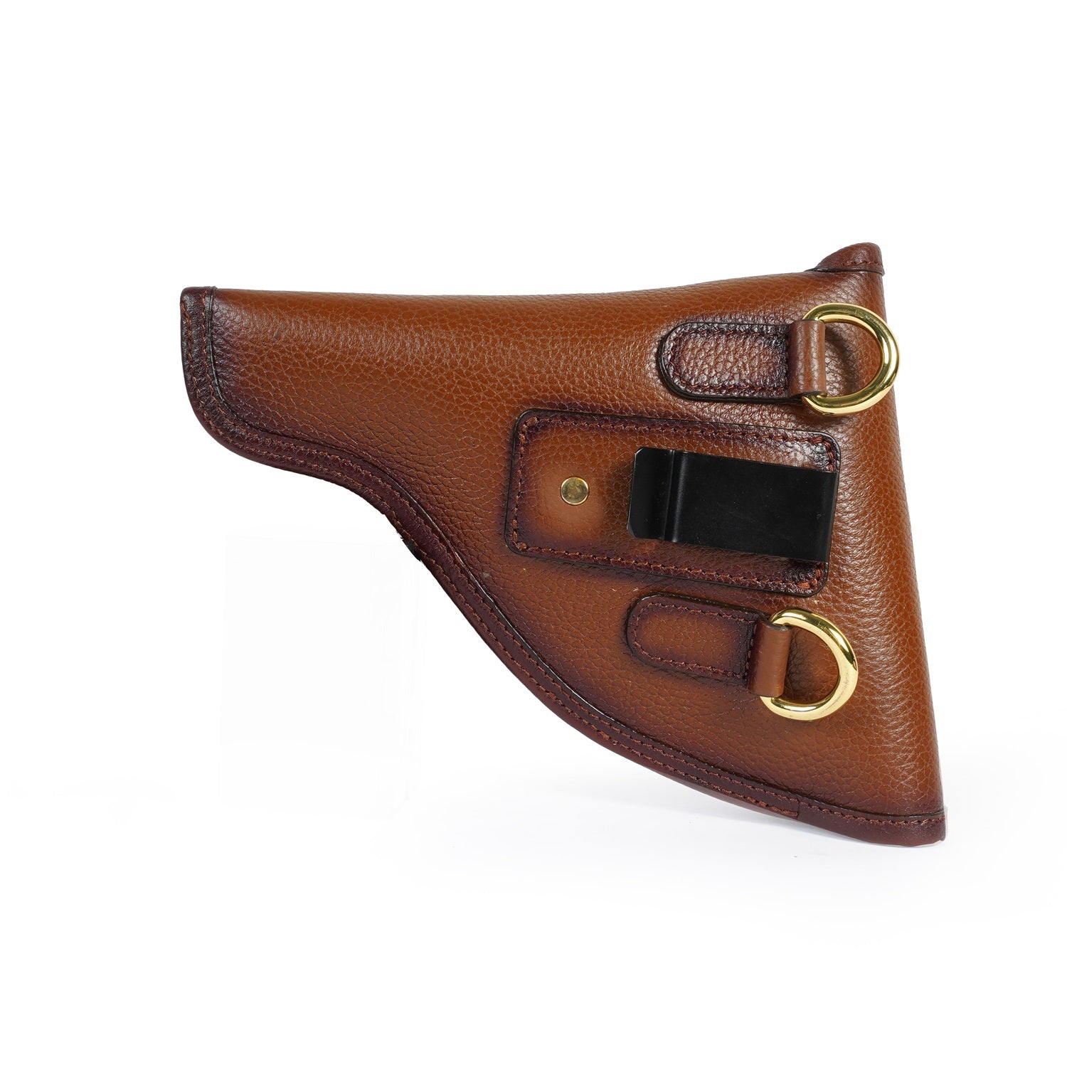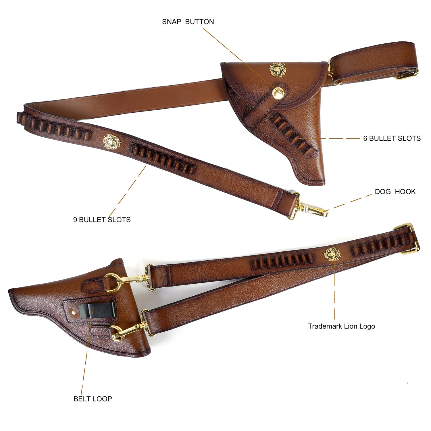 Safety & security both are important keys to keep a gun with you. This gun and bullets holder gun-cover is a perfect choice for you. It is made with superior quality imported leather to keep your Gun & Bullets. Strong & wide adjustable Strap is attached to maintain its durability & comfort to wear on your chest. It has Gold metal buckles in strap to adjust its length & lion logo is placed at the centre of the strap. It gives classy look to a person when some one hods it. This can be customized to any size weapon .22, .32, .38, 9mm and .45 pistol and revolver .38. We offer name Initials and other personalisation like color change, laser engraving of logos or slogans. For this please write to us by choosing the "customization tab"