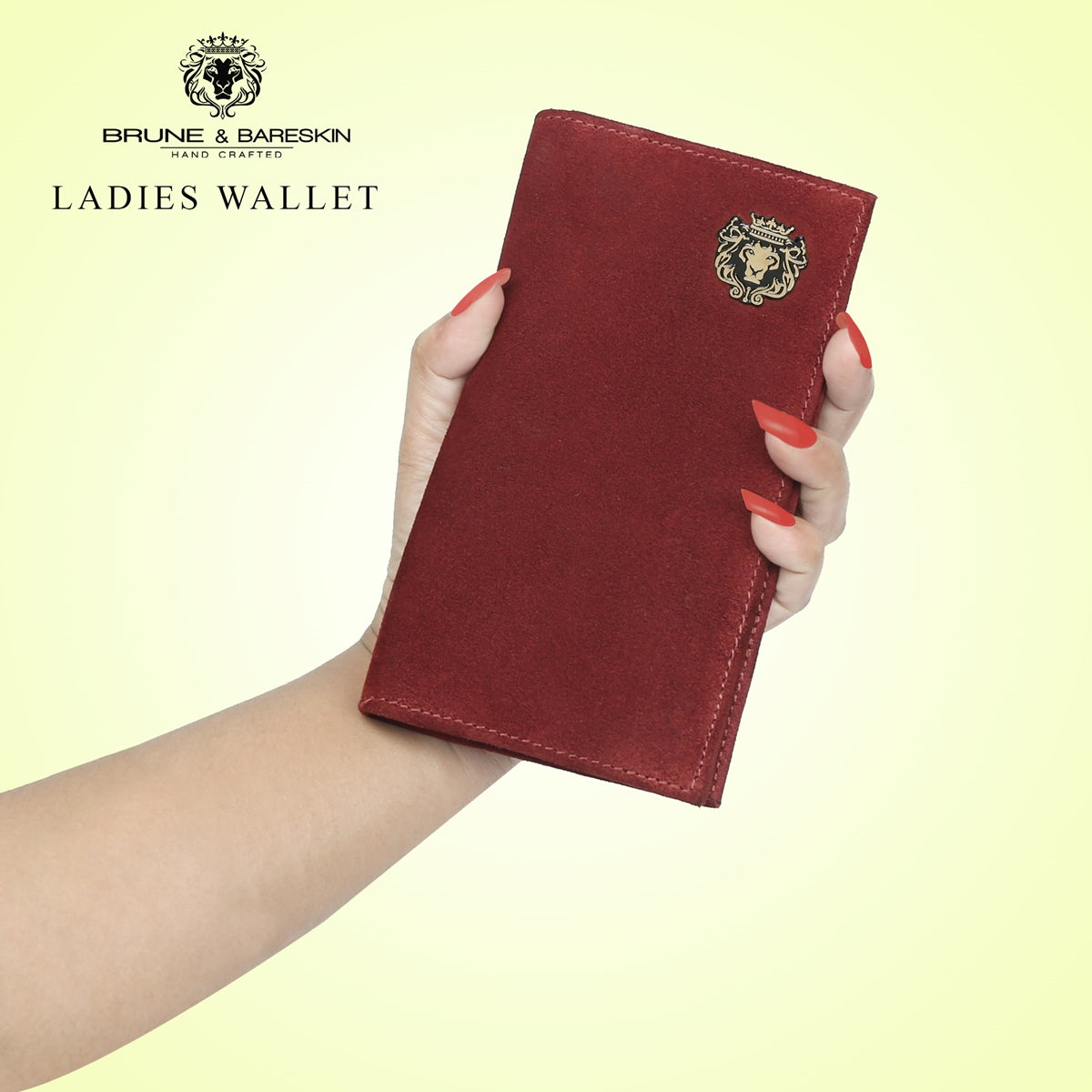 Red colour in Suedeleather, this trendy wallet/clutch from Brune & Bareskin is especially designed for fashion conscious women. Made from 100% Genuine Leather, this wallet ensures lasting durability. It features a Bifold closure and has innteral hidden zip pocket, which enables easy storage of your cards and cash.