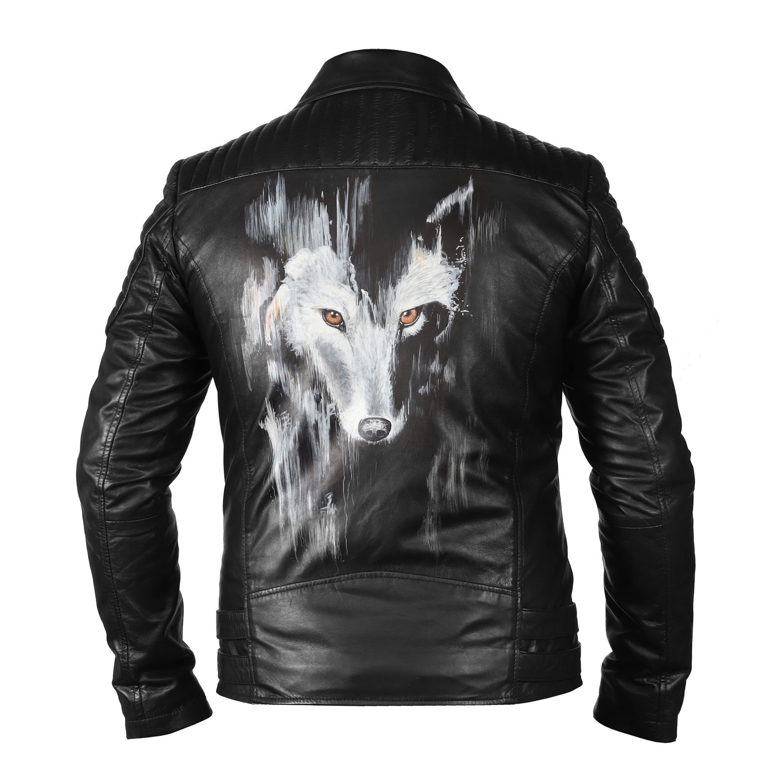 Hand-Painted "BHEDIYA"(WOLF) Black Dual Buckle Zip Closure Leather Jacket By Brune & Bareskin