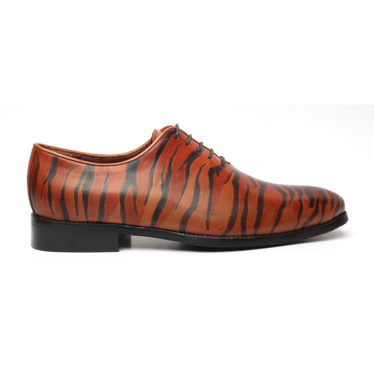This lustrous hand-colored tiger-inspired art shoe is made up of genuine leather. This Oxfords shoe is an amazing piece of art. This tiger stripe provides an elite look to the shoe. When you choose to wear branded, customized shoes by Brune & Bareskin, you are sure to get more than a few glances coming your way. These high-ending leather shoes, with laces, are crafted with a fit and finish that spell designer wear. This pair will complement your entire formal to semi-formal to casual looks and shows your animal love. This pair is a must-buy to be the center of attraction in your friends and events.