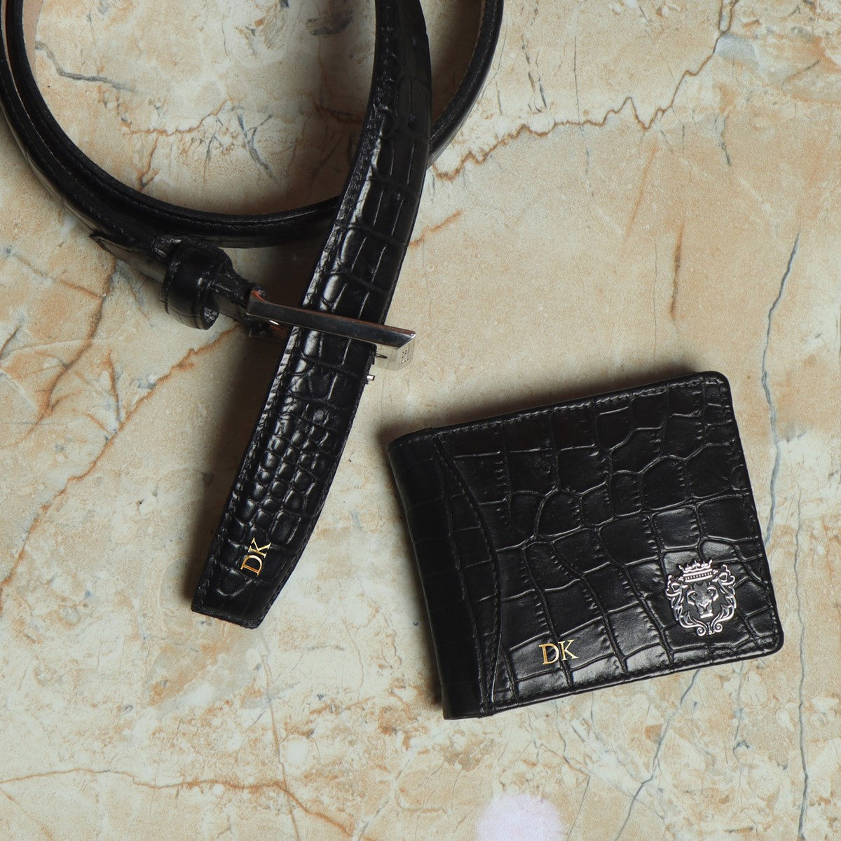 Bespoke Combo of Black Croco Leather Wallet & Belt With Initial by Brune & Bareskin