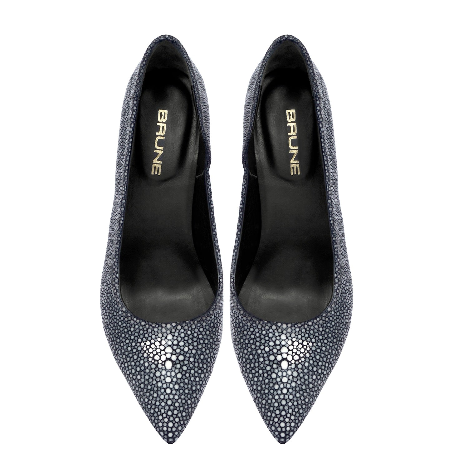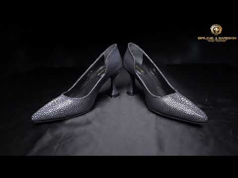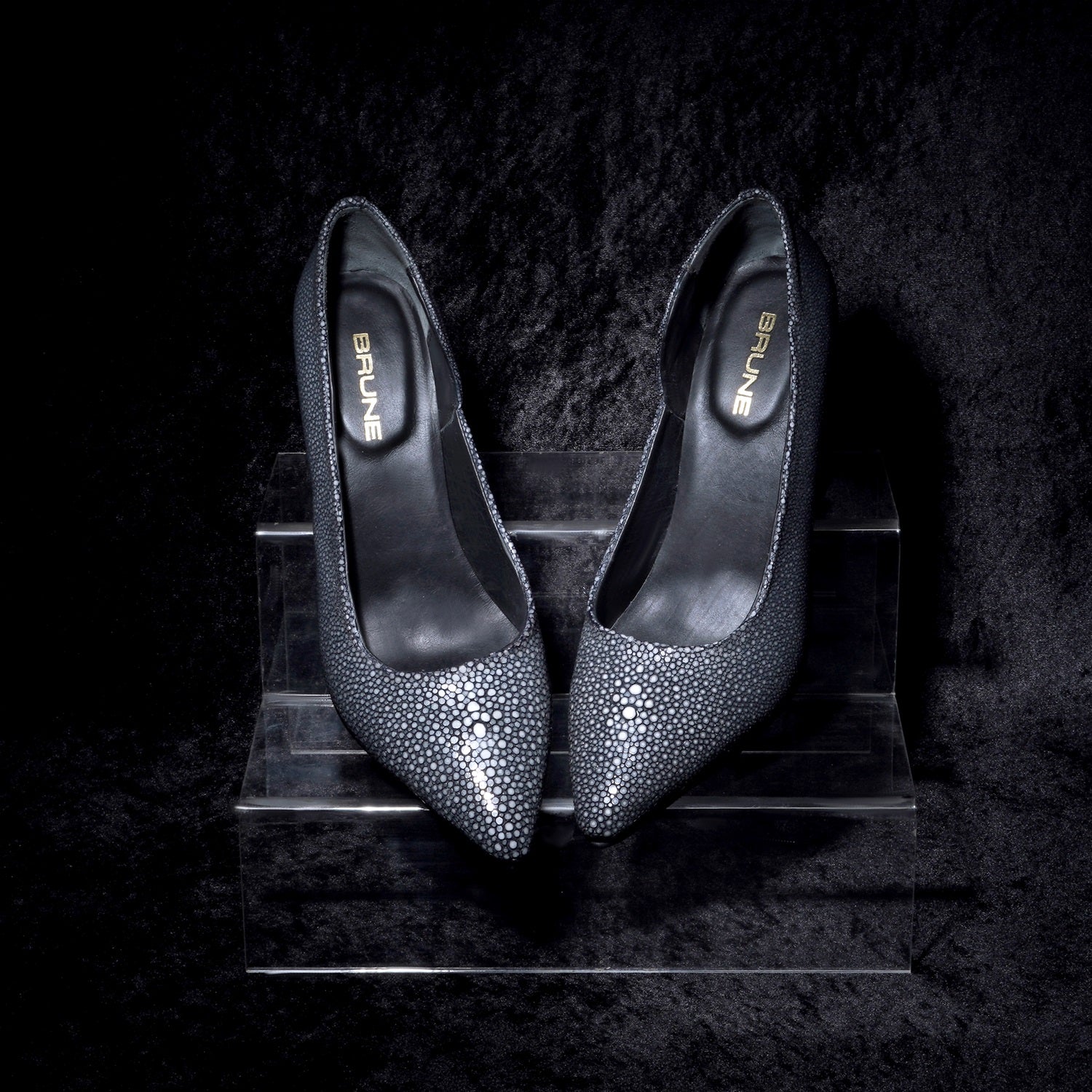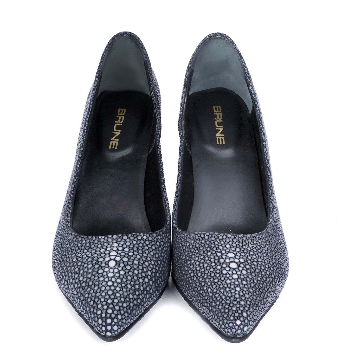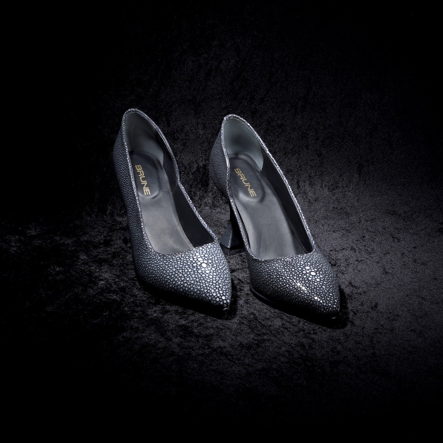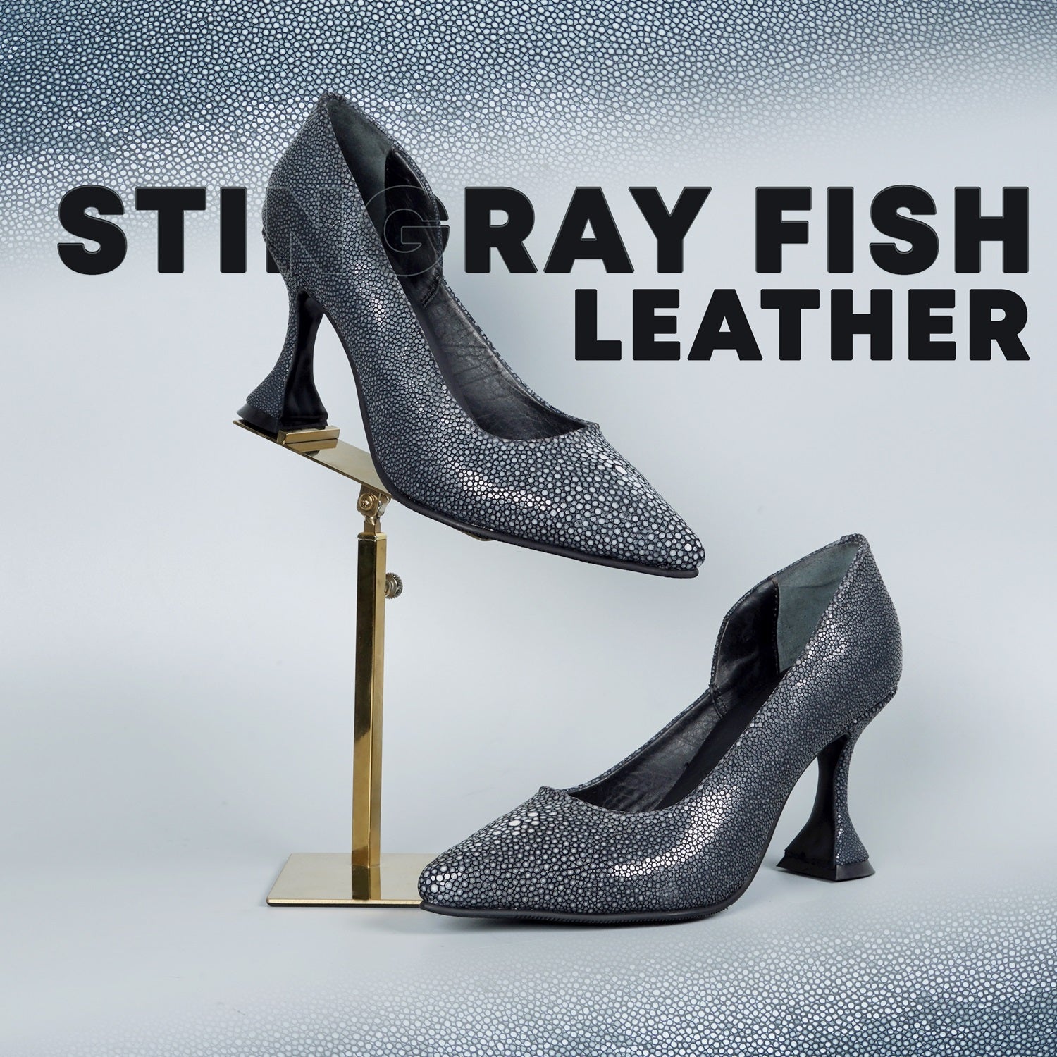 Stingray fish Leather fluted heel by keeping in mind the current trend affairs & fashion. A pointed-toe fluted heel is one of the most noted heel shapes and a classic. Fluted Heel still a more comfortable option, and thus, they're easier to walk in. For grey stingray fish leather footwear, with style, choose to wear this pair of handcrafted leather footwear by BRUNE & BARESKIN.