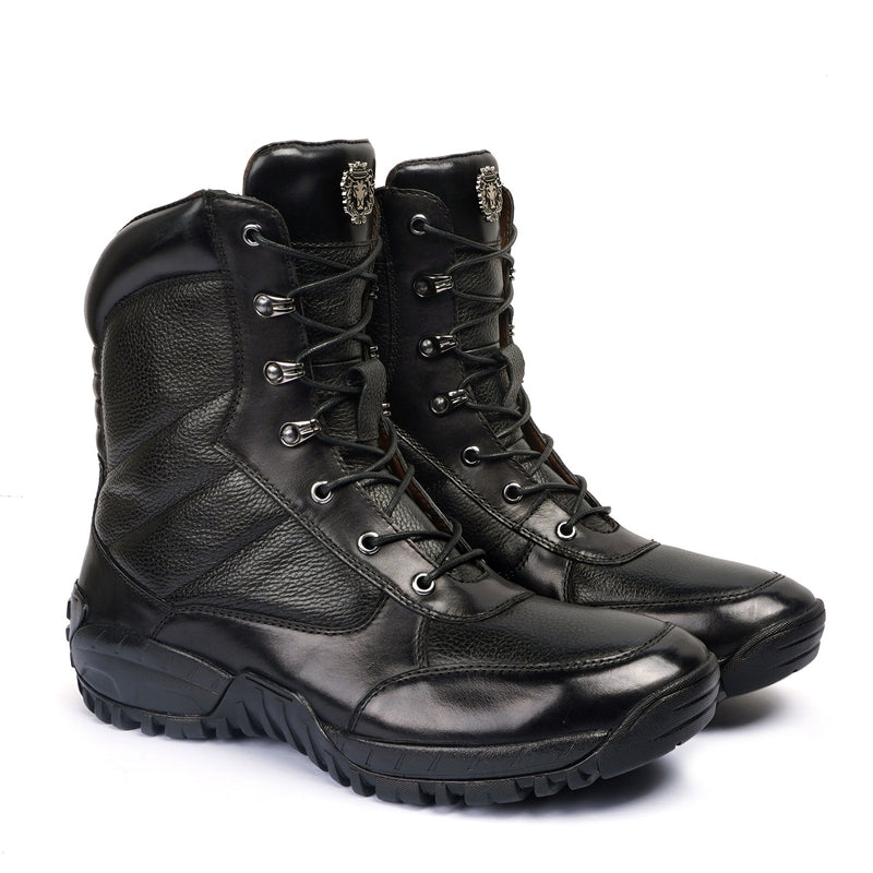 Take on any adventure with our High Ankle Military Boot! Handmade with premium quality genuine leather, these Cognac boots from Brand brune & Bareskin offer both style and durability. The lace-up and inside zipper closures provide a secure fit, while the extra grip rubberized sole ensures stability. Perfect for the risk-takers out there, these boots feature a padded insole and collar for added comfort, topped off with our signature metal lion logo on the tongue. Light weight and versatile, these boots are a must-have for your collection.