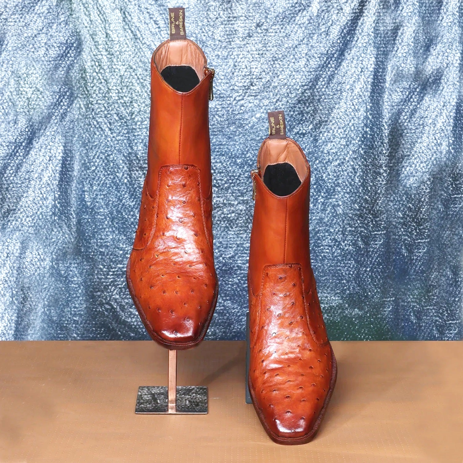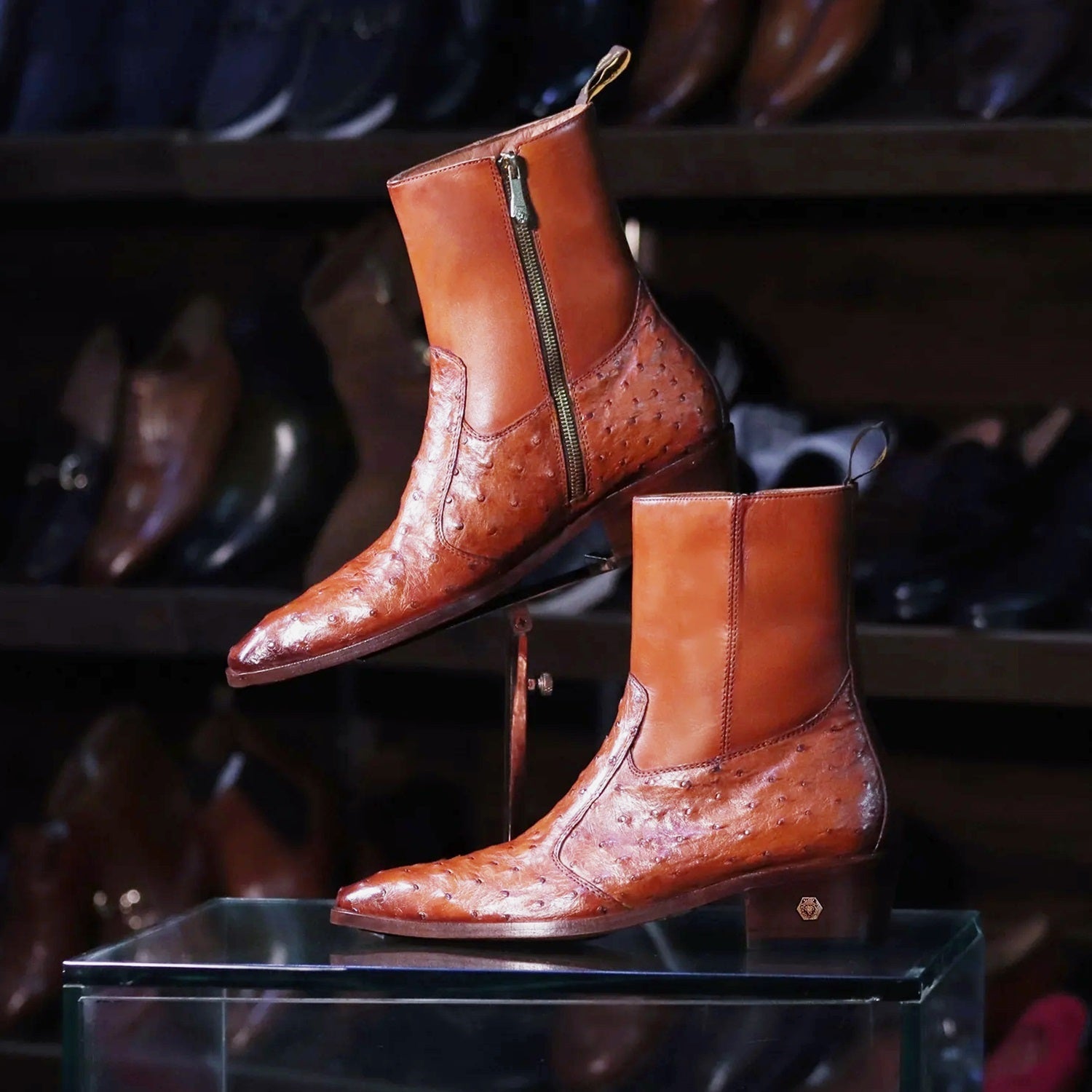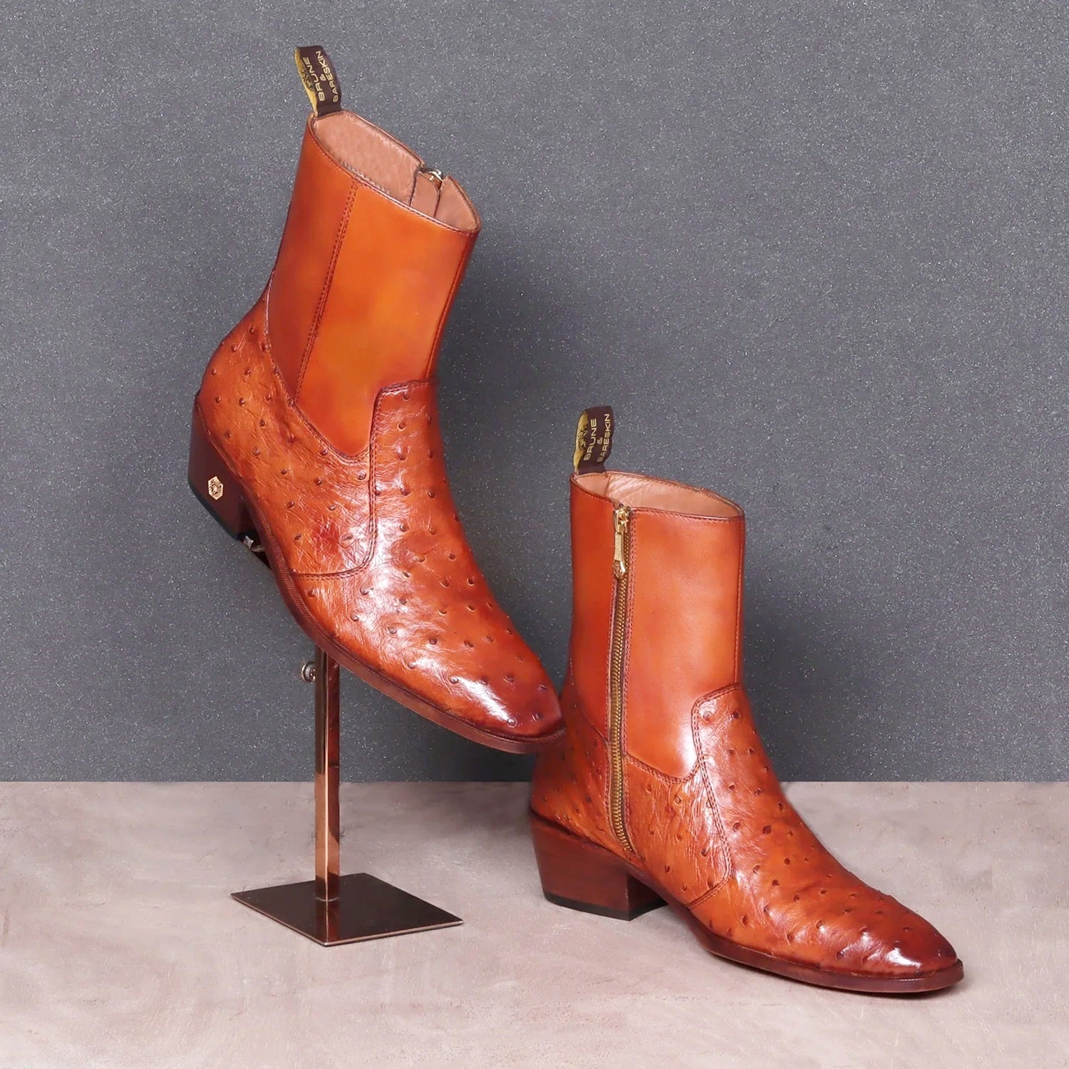 High Ankle Men Formal Boots Stitched Tan Real Ostrich Leather Cuban Heel Zip Closure