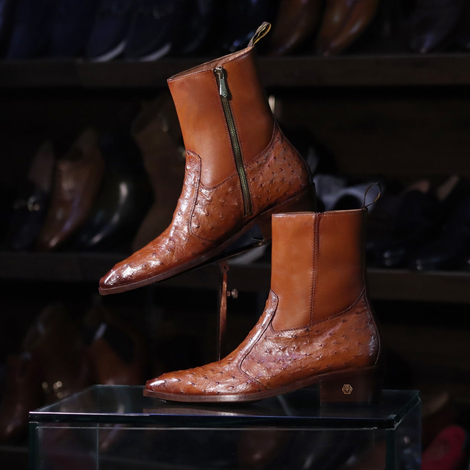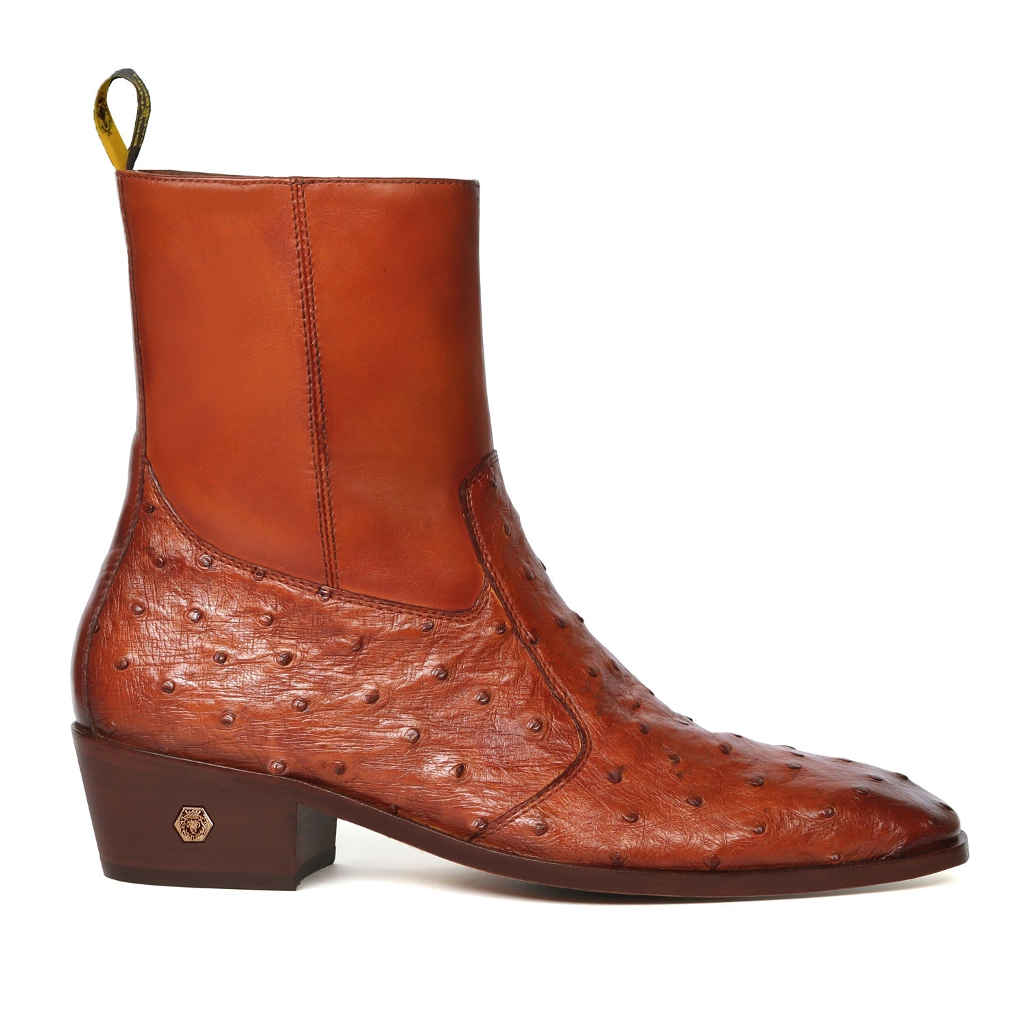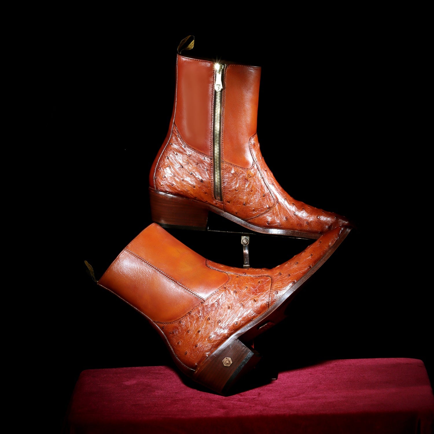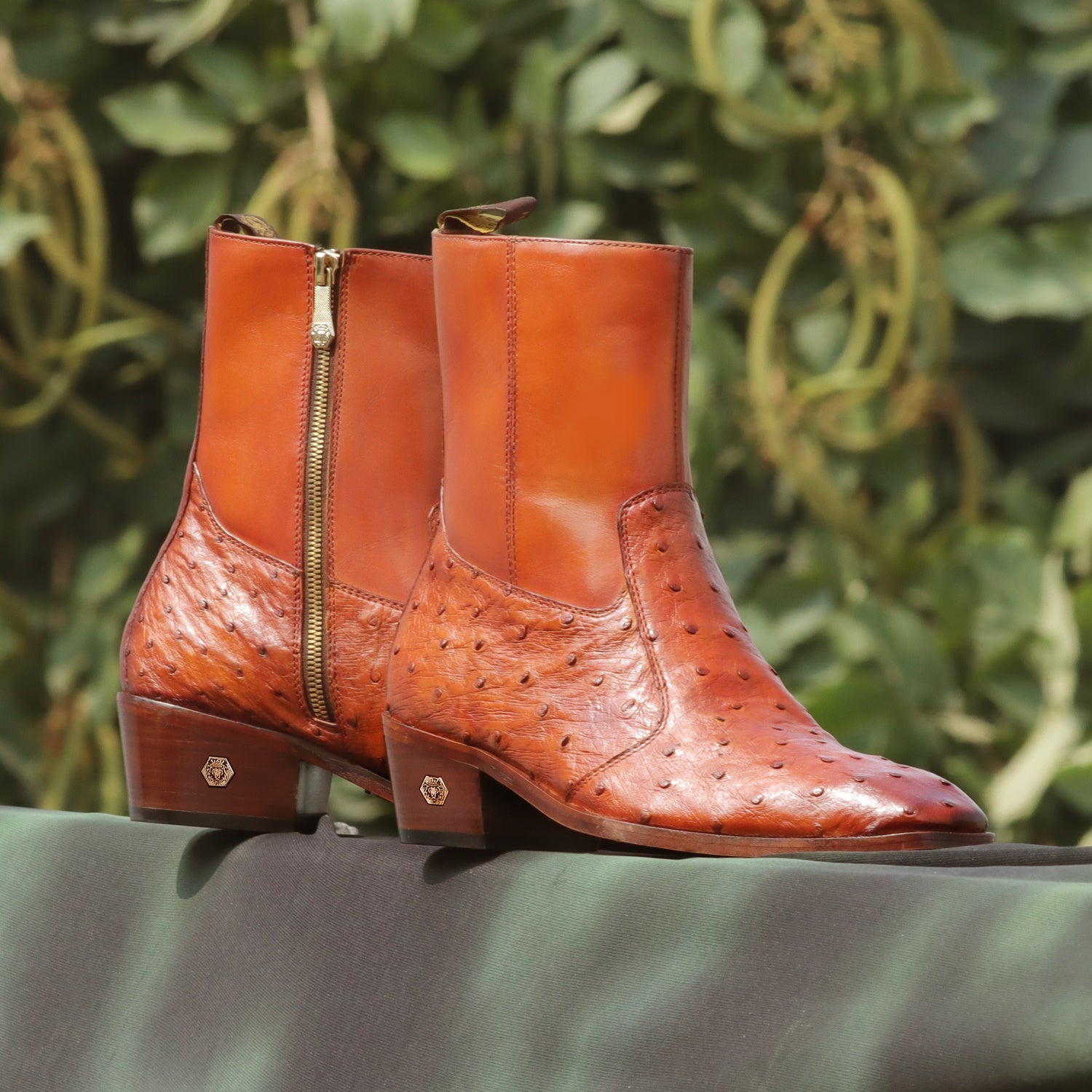 High Ankle Men Formal Boots Stitched Tan Real Ostrich Leather Cuban Heel Zip Closure