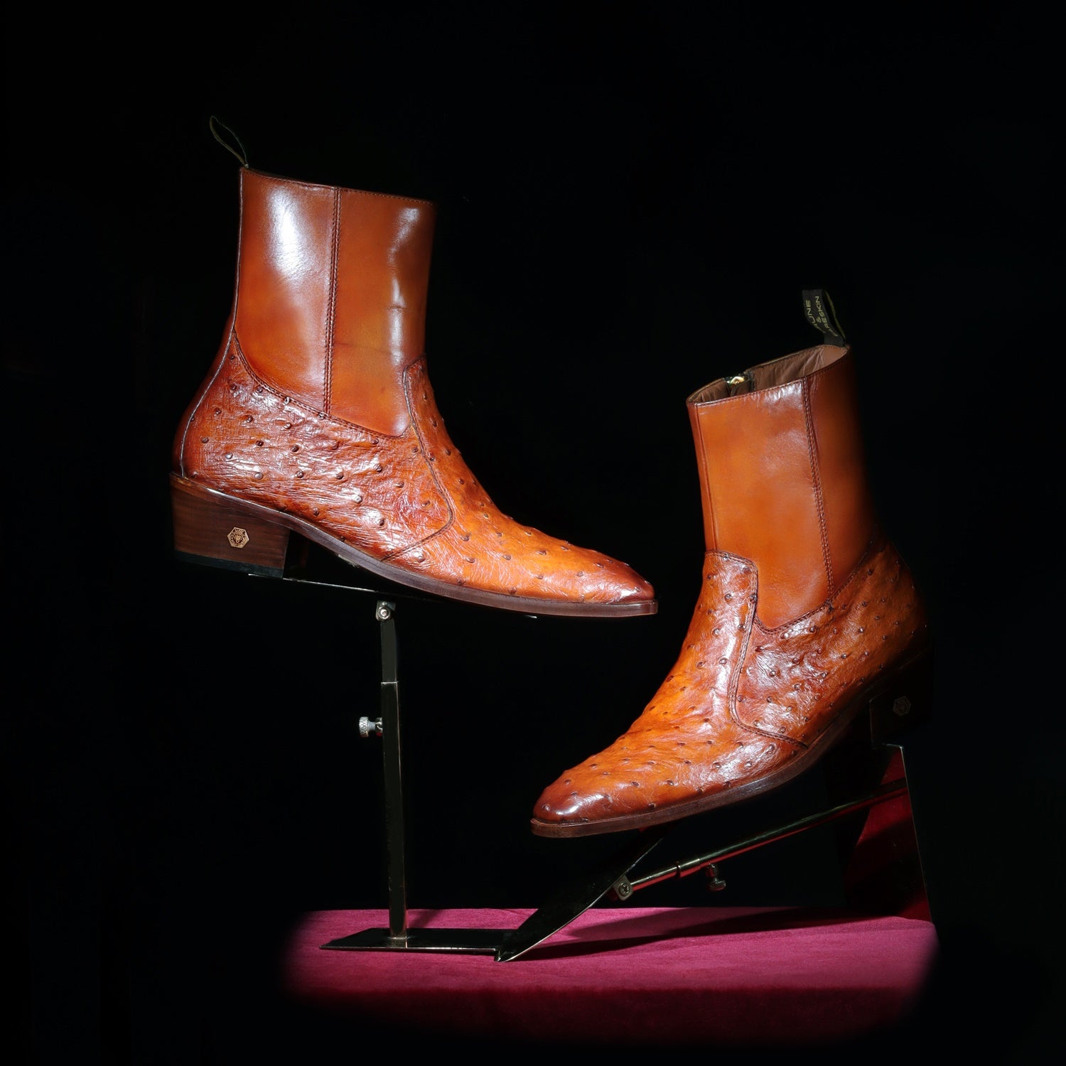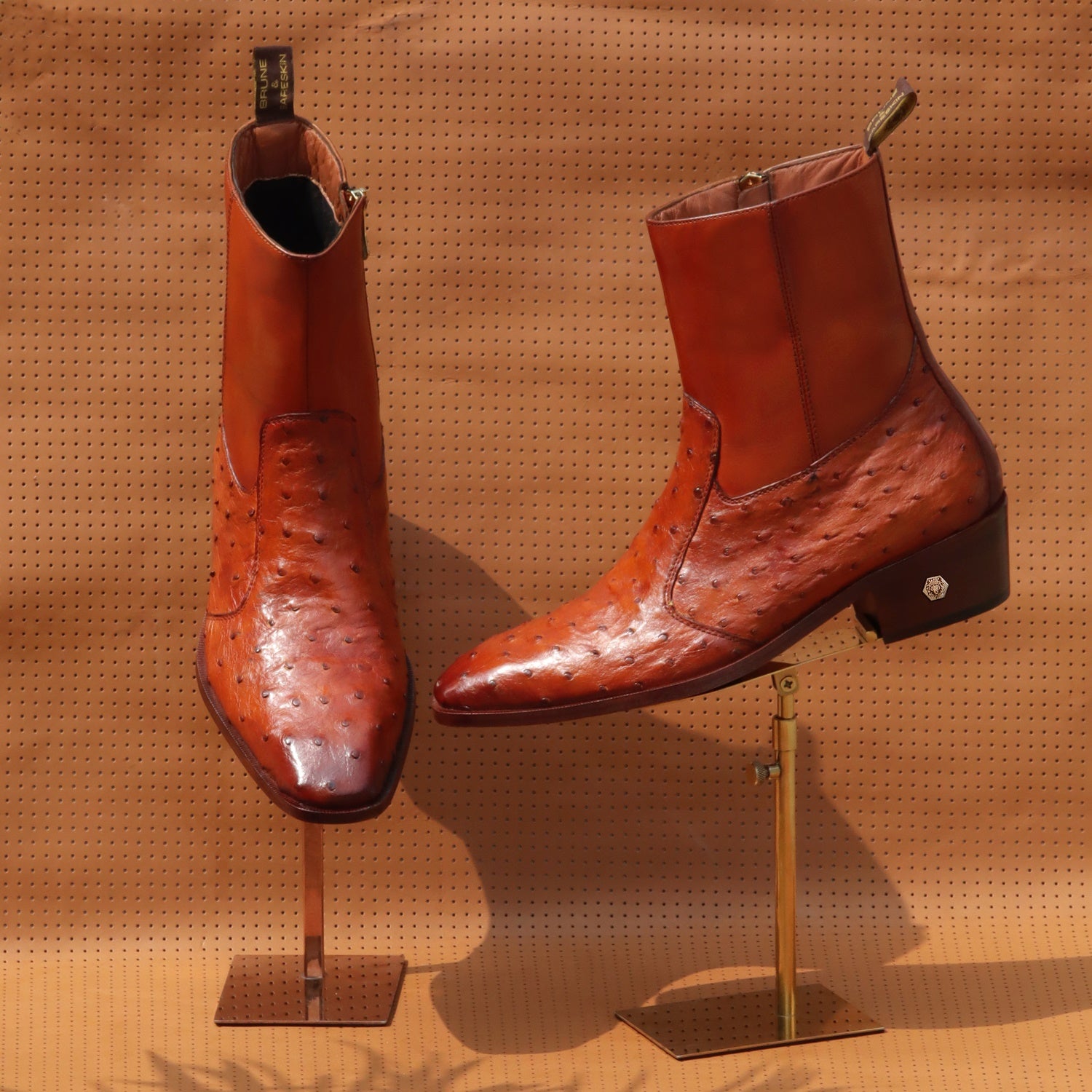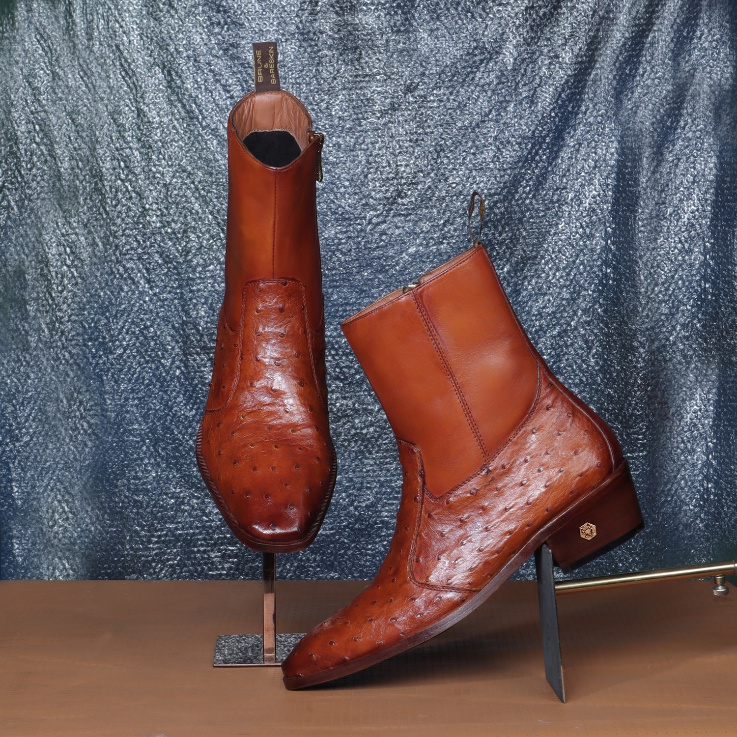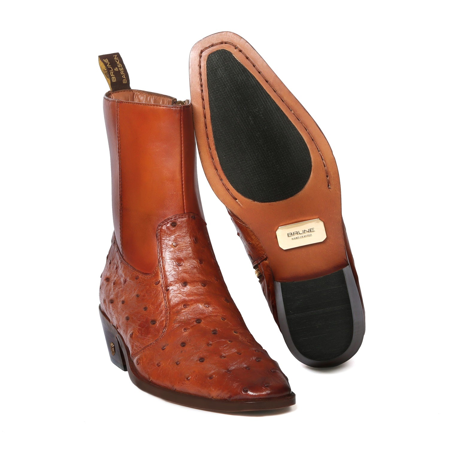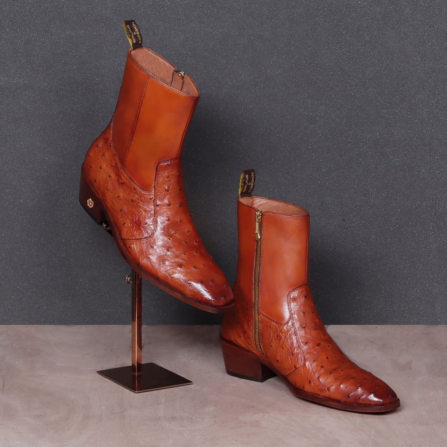 Brune & Bareskin offers sensational exotic skin boots that are completely hand crafted and hand stitched. It is a pair of hand-finished Real Ostrich Genuine leather with sure-to-be satisfied fit and style. Ostrich is known for its durability and comfort. The rugged look makes it the perfect pair that every guy should have in the closet. The natural texture of Ostrich Leather adds an extra element of style. The stitched detailing on the quarter looks classy. The zip closure provides an extra ease to wear these exquisite boots. The leather sole and Cuban heel adds the extra elegance to it. These boots work for everyday or formal attire. Either way, you will be comfortable on your feet during the hours. Durable construction ensures your boots hold their shape, while the cushioned foot-bed and leather lining make them feel soft and supportive. This astonishing pair is very comfortable to wear. You can customize this chic boots in any of your favorite color according to your attire with our bespoke services. They are easy to team with formal trousers as they blend well with the classic fabrics as well as the modern blended synthetic fabric pants, slacks and trousers.