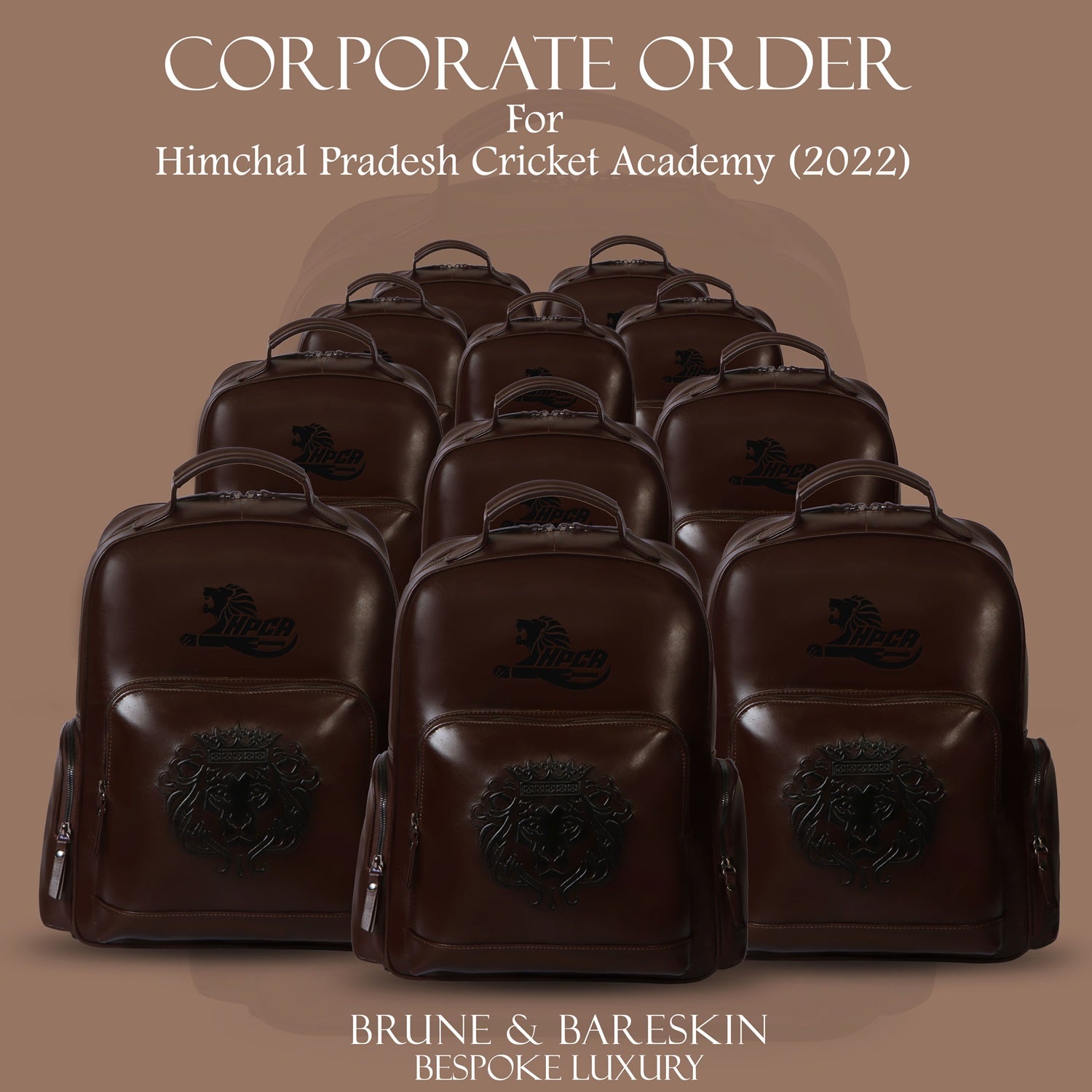BRUNE & BARESKIN Handcrafted Dark Brown genuine leather is used to craft this exclusive Backpack for Himachal Pradesh Cricket Academy in 2022. It is a perfect Travel Collection.