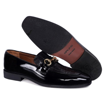 Add a touch of sophistication to your wardrobe with these elegant patent black deep cut leather loafers from the esteemed Brune & Bareskin brand. Featuring a sleek Italian toe shape design with horse-bit buckle detailing on vamp, these formal shoes exude a timeless, luxurious appeal. Crafted from genuine durable leather, the slip-on silhouette and textured outsole provides ultimate comfort, while the black color ensures you can wear them for any occasion - from the office to an evening party. Look your best with this luxurious black loafer.