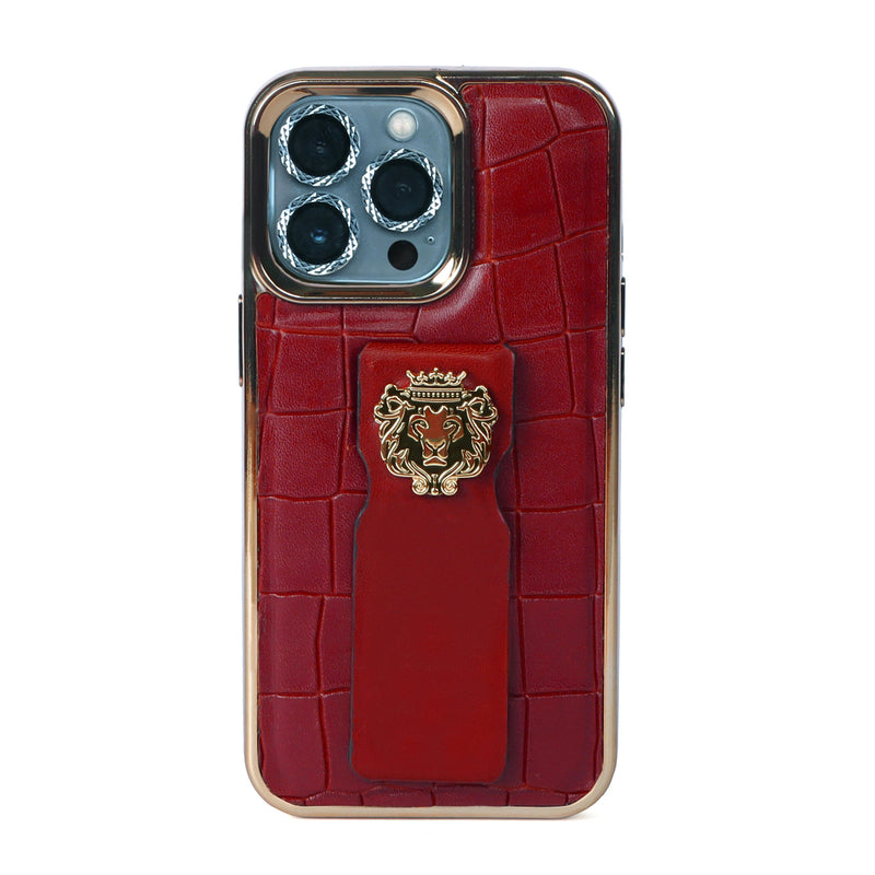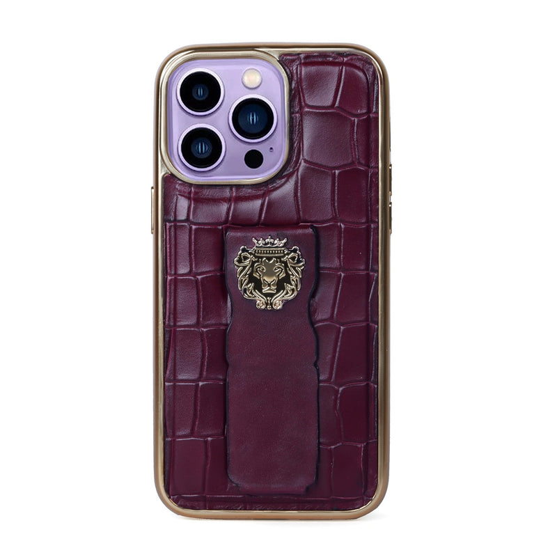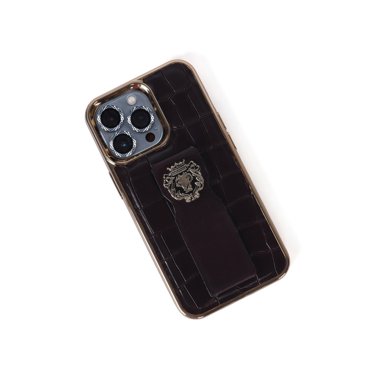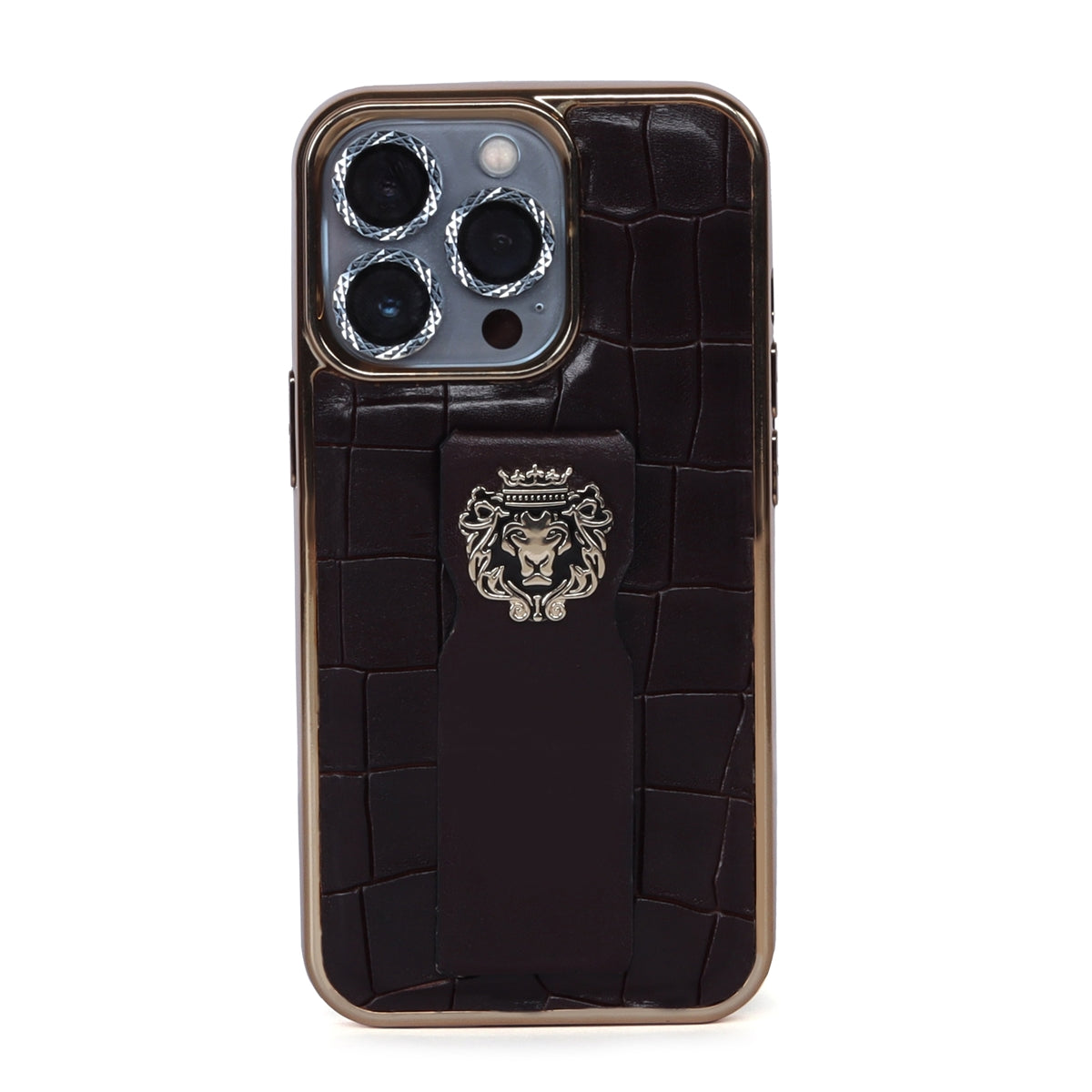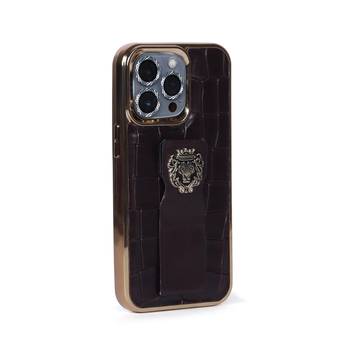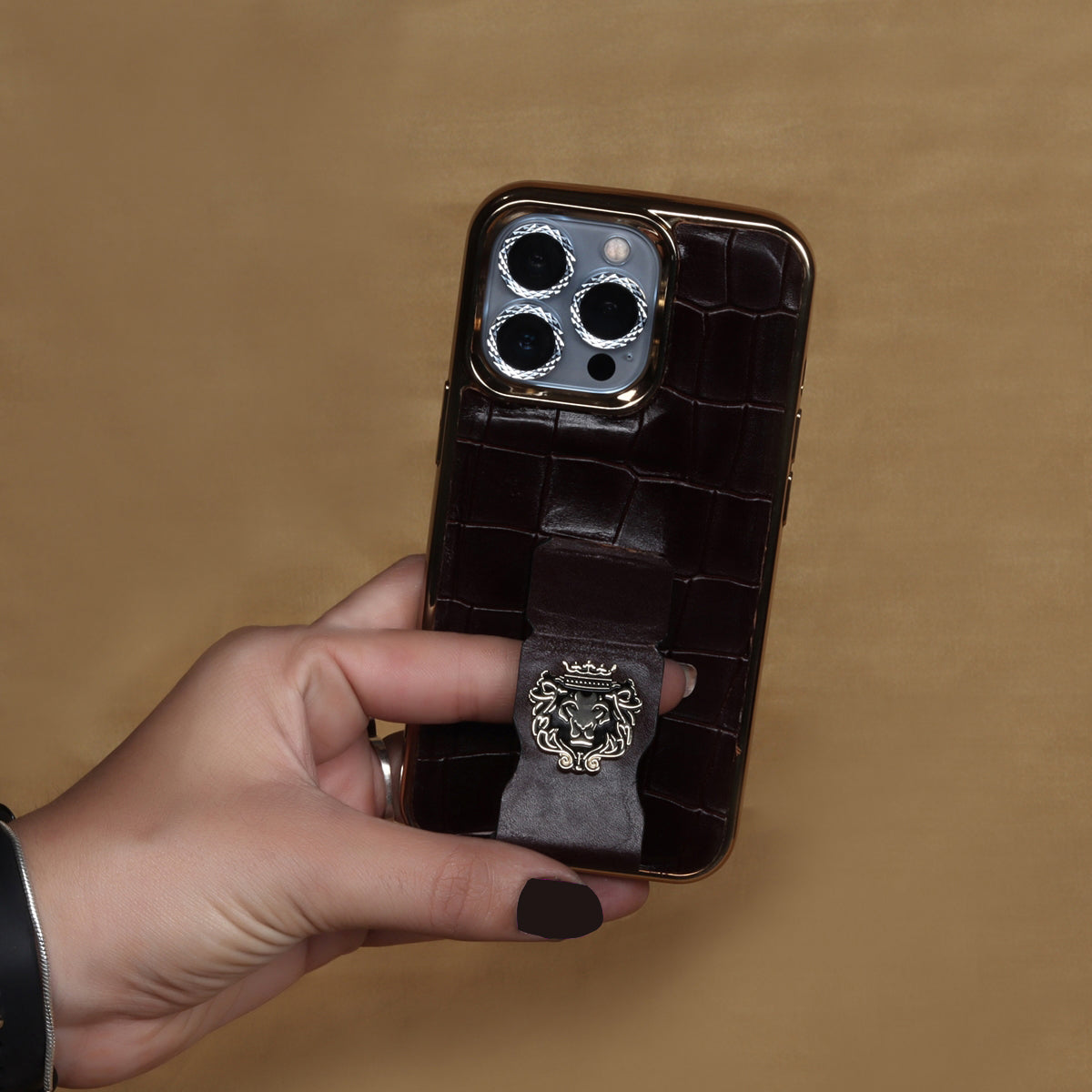 iPhone Series Dark Brown Mobile Cover Golden Rim Finger strap cum Stand Croco Textured Leather with Metal Lion Logo