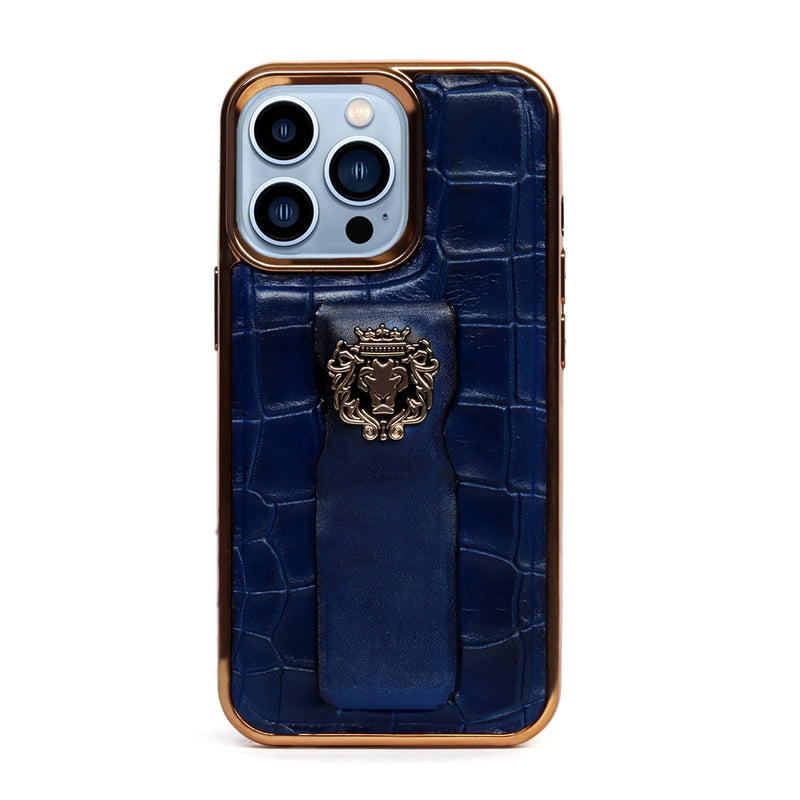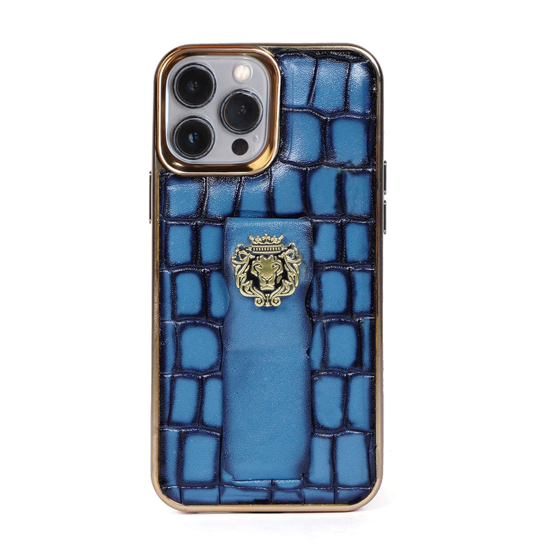 The Latest Dark Brown Croco Textured leather Golden Rim iPhone case is unique. This time Brune & Bareskin has come up with more ease to your accessory, it's an elegant mobile cover in blue deep cut croco print leather with finger strap. The exquisite mobile cover you would love to carry. This Mobile Cover is hand-finished with our metal Lion logo and designed to make your everyday tasks easier on your phone with the finger strap added on the back. With this cover on, you can use your phone on your work desk productively. The Finger strap also converts to a stand which can place your phone in Portrait or Horizontal orientations. The dark brown color in deep cut leather dignified the darker scale shades of deep cut Croco print leather cover. The metal lion logo leaves a remarkable mark of style. The hand stitched around the border provides more rigidity elite look to it. This high veg tanned leather will surely serve you for a very long time and you can get name Initials as well of their choices with our bespoke services.