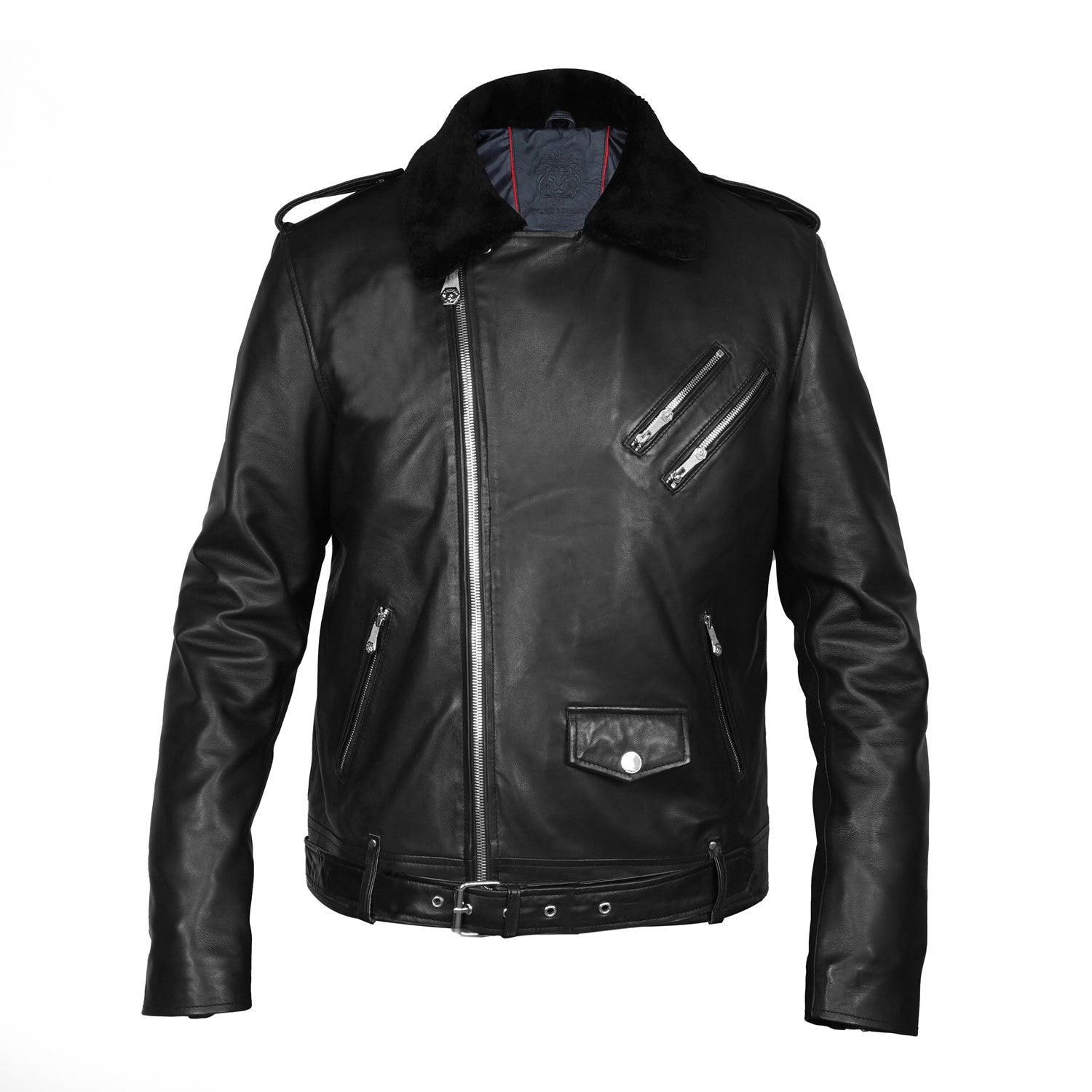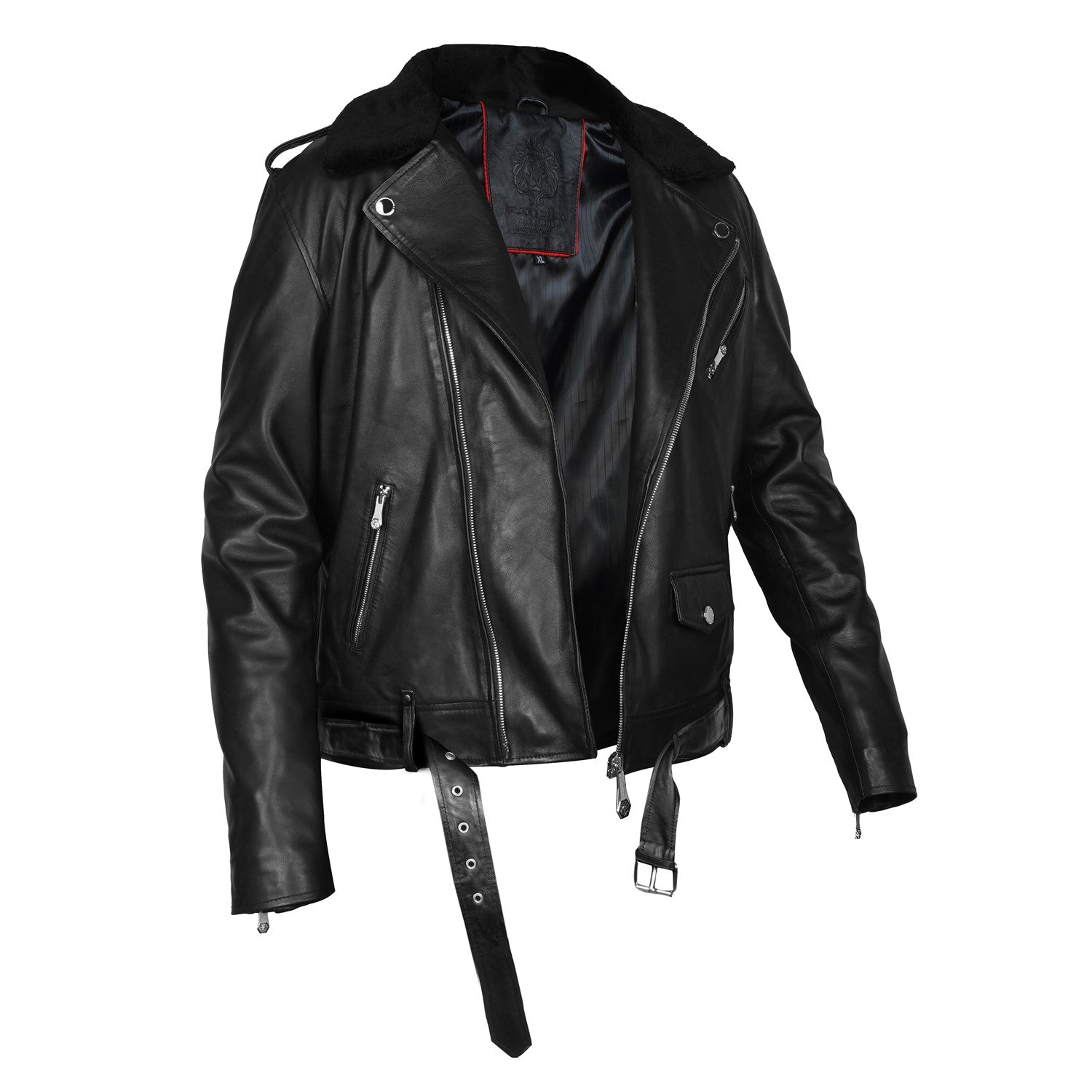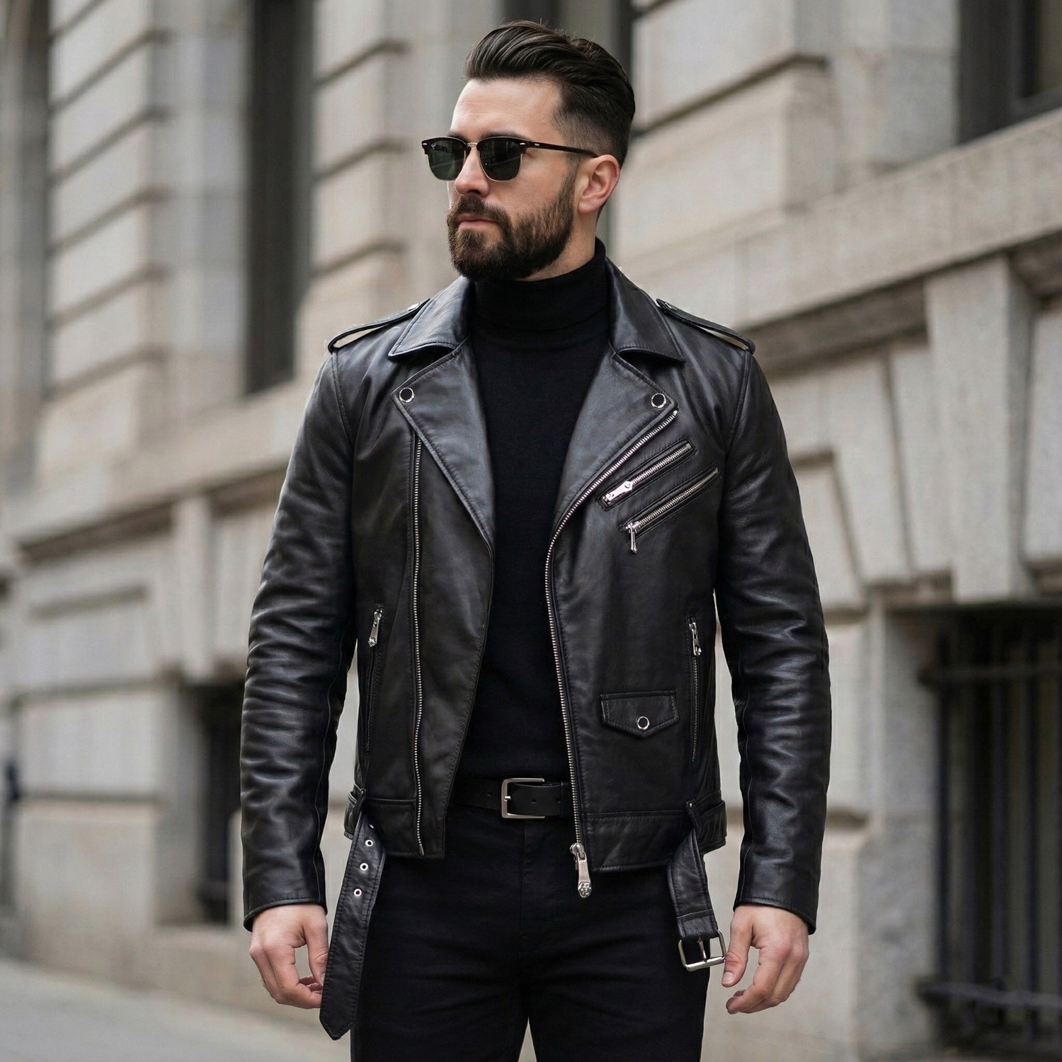 Black Leather Biker Jacket with Adjustable Waist Belt